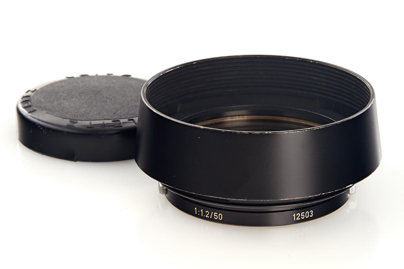 in good condition with perfect optics, barrel shows some wear, both caps, original metal hood 12503 (near mint condition), UVa filter