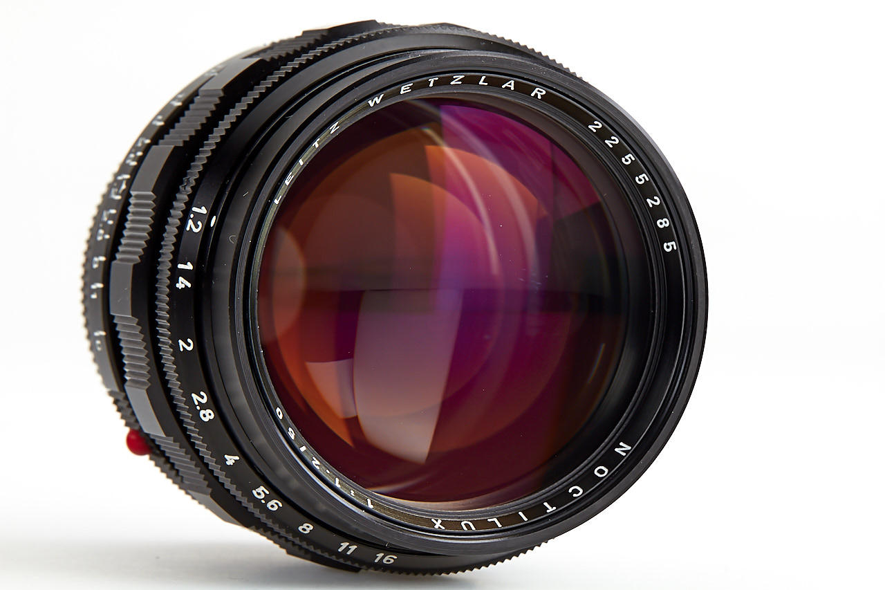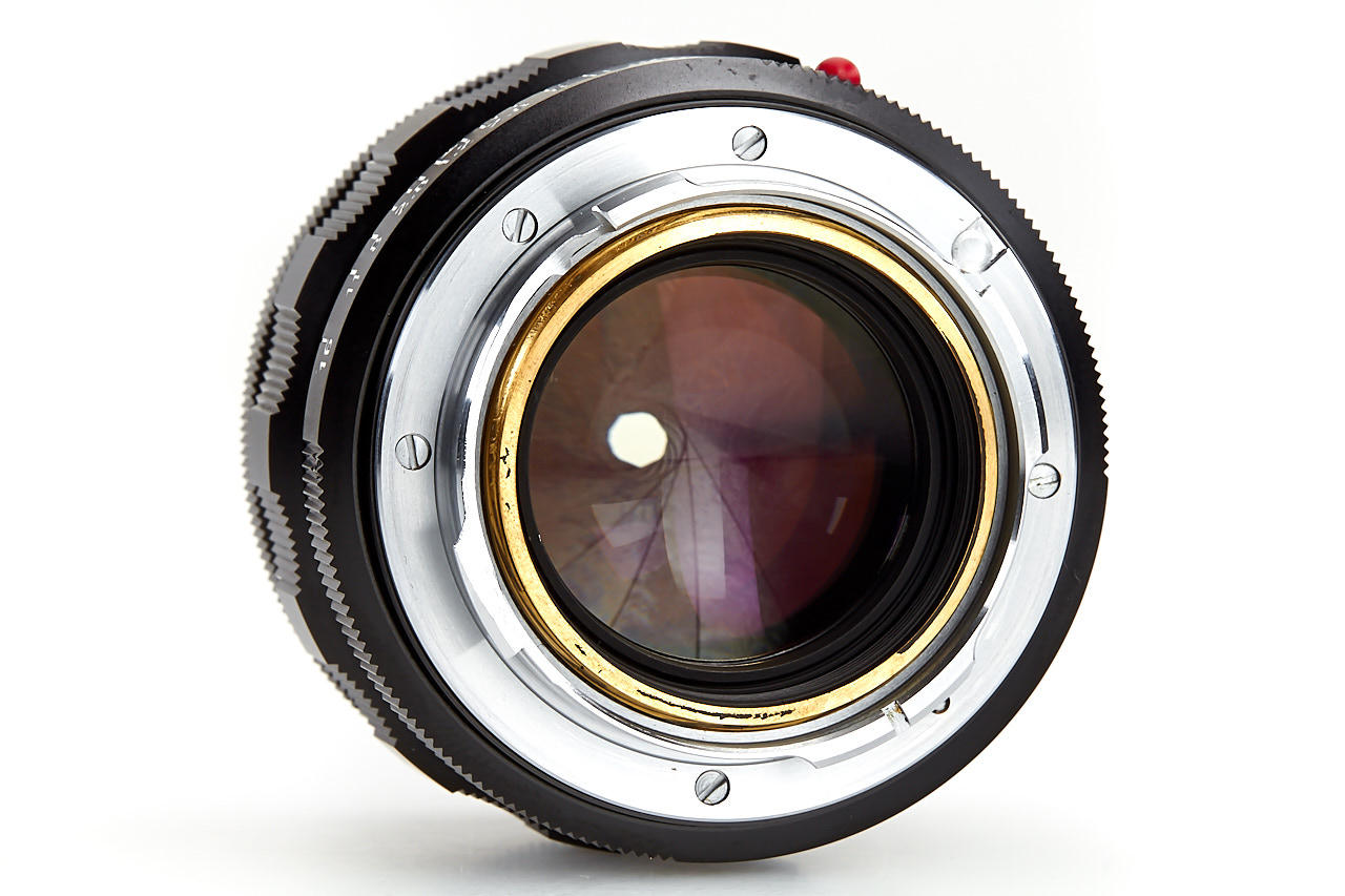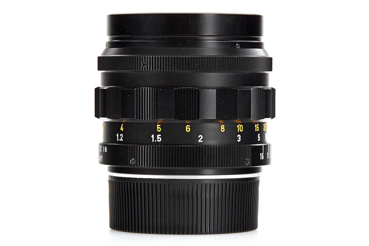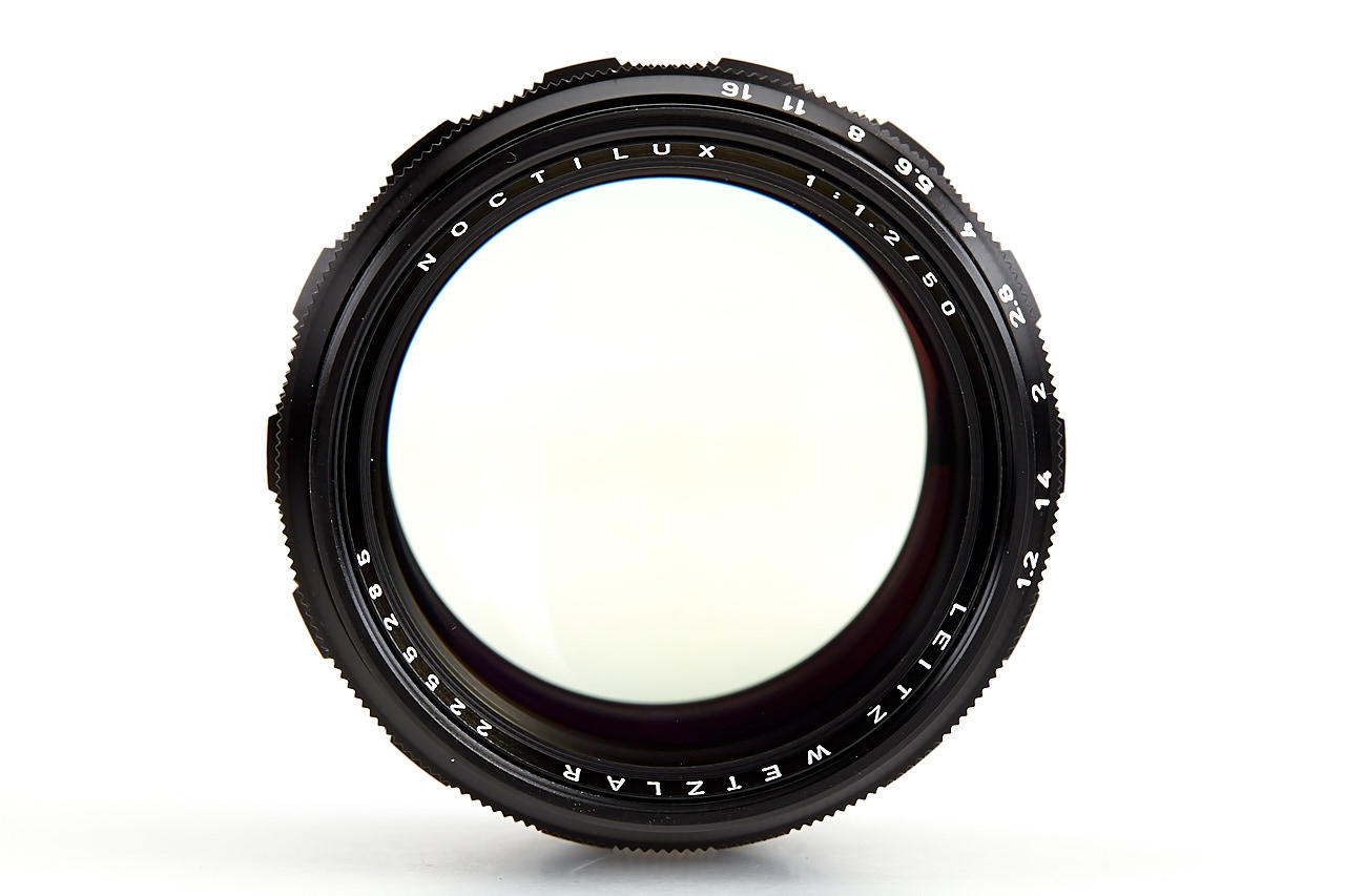 The Noctilux 1.2/50mm was the first 35mm lens in the world containing an aspheric element. Leitz Wetzlar optical designers Helmut Frenk and Dr. Paul Sindel were responsible for the optical computation. The lens was introduced in 1966 and was received by the market as a sensation. It is almost entirely free of spherical aberration and coma while producing an exceptionally high degree of contrast. 45 years ago, however, even for Leitz it was quite a challenge to produce such a lens, a fact reflected in its price as well: the lens was almost twice as expensive as the body of the Leica M4. It was replaced by the 50 mm Noctilux f/1 in 1976, which – using optical glasses new at the time – could be calculated without aspherical elements and was even cheaper than its predecessor. In ten years of its production, only about 2,500 units of the 50 mm Noctilux f/1.2 were produced in total, which represents a proportion of one unit per business day. The Noctilux f/1.2 lens can truly be called a legend within the technical development of the Leica lenses. It is not only sought-after by collectors, but still also a favourite of some photographers. This particular example is in near mint cosmetic condition, with good optics (only minimal cleaning marks inside), with front cap and keeper.