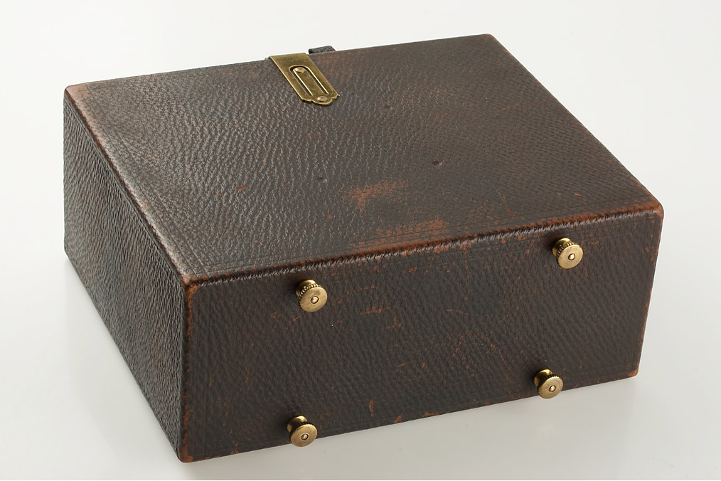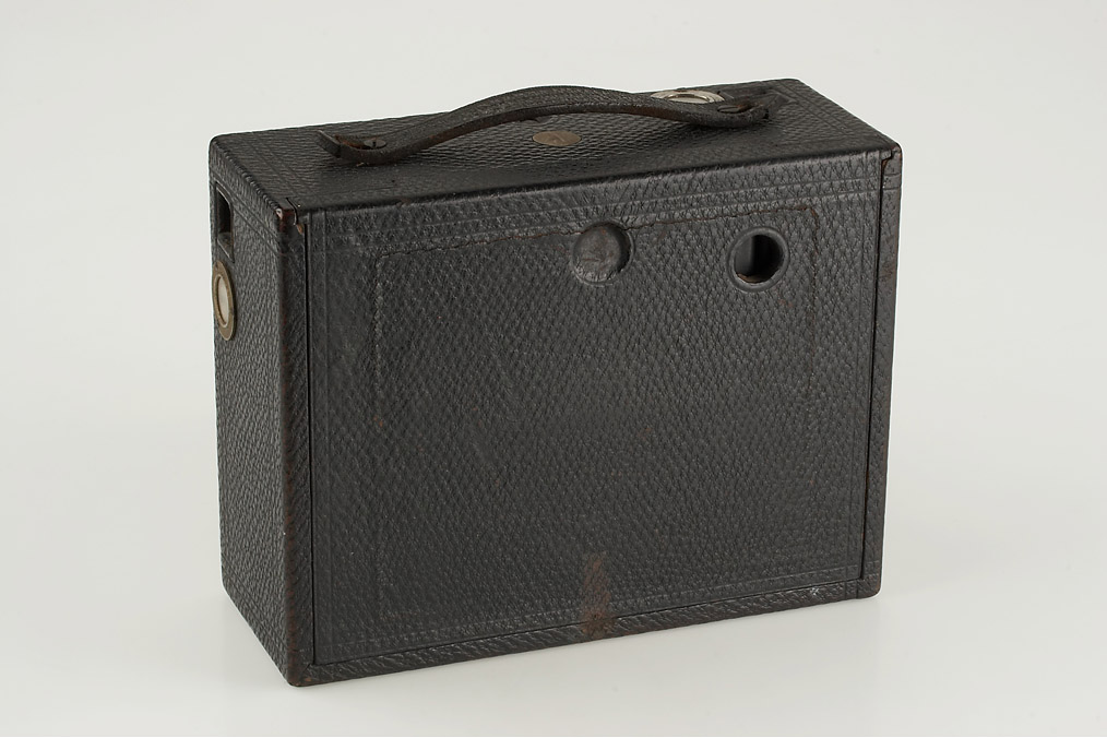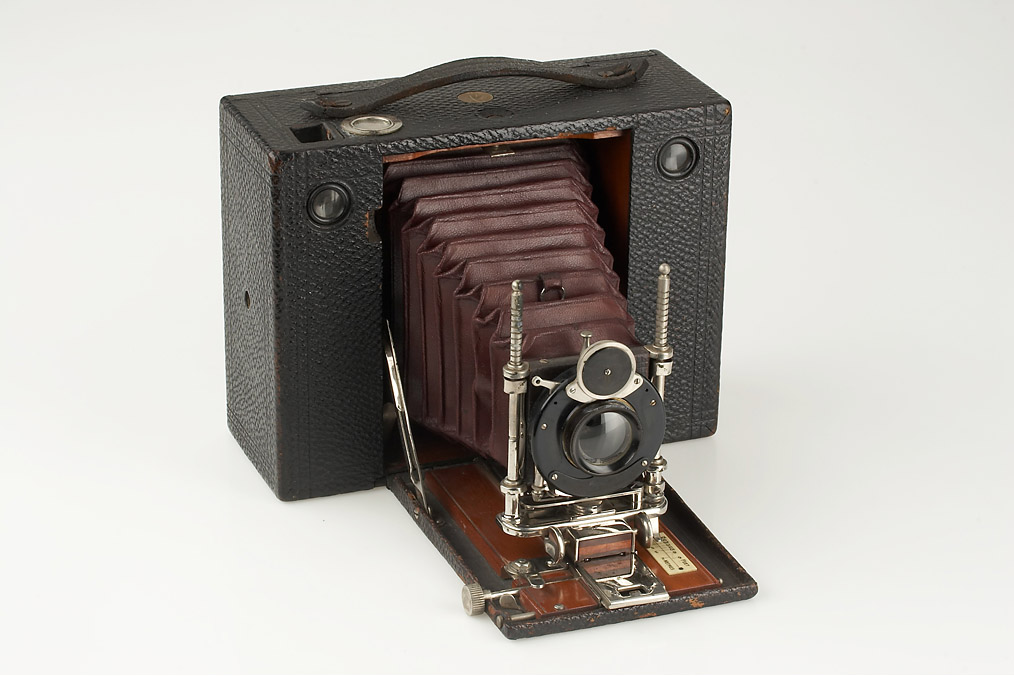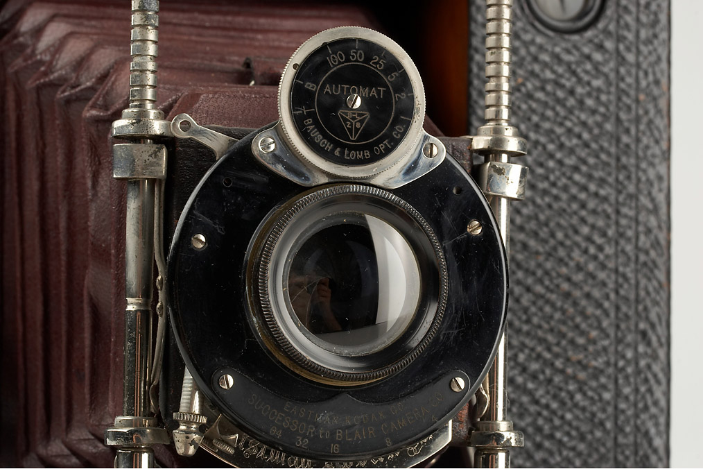 camera for exposures 4 x 5', with Bausch & Lomb Rapid Rectilinear f/8 lens in B&L Automat shutter, with rare Cartridge Kodak Bicycle Case which has two thumb screws at the bottom for clamps that attach the case to bicycle tubing. Ex Spira Collection.