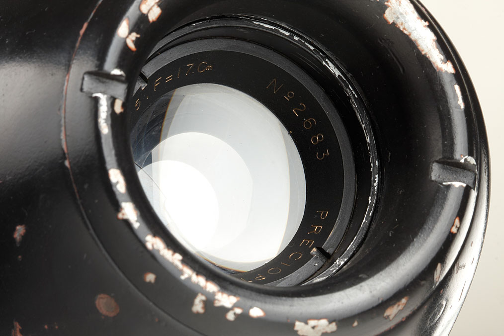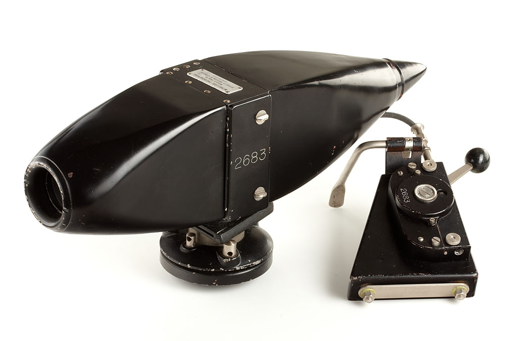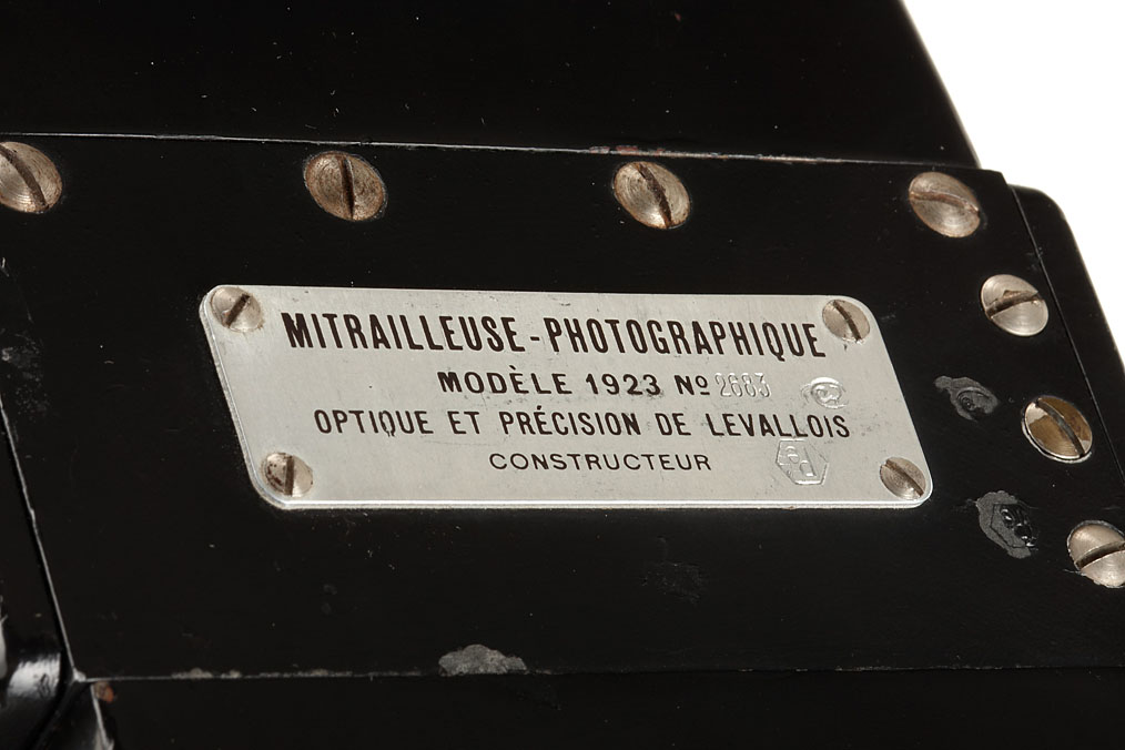 boxed first model of the French streamline aerial camera called ‘La mitrailleuse photographique’ made by 'Optique et Précision de Levallois', a well known maker of surveying instruments located near Paris, the all-metal camera is complete in great original condition, it comes in the original fitted wooden box together with the original cable release which was mounted inside the pilots cabin, a set of mounting parts and tools and an additional film holder, in the lid of the box a handwritten inventory. The ’mitrailleuse photographique’ was used for training purposes by the French Air Force in combination with a Lewis machine gun. The 1927 model of the camera had an built in Chronograph, by the end of WII both models were produced under the label FOCA. A beautiful and highly collectible camera!