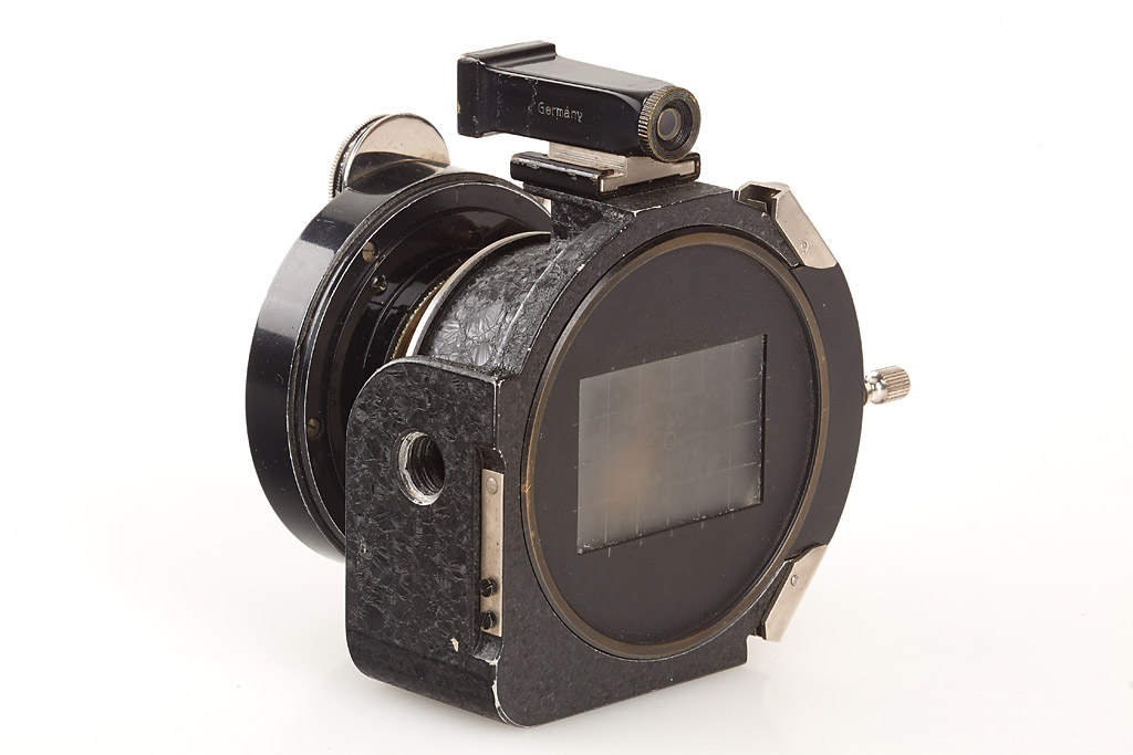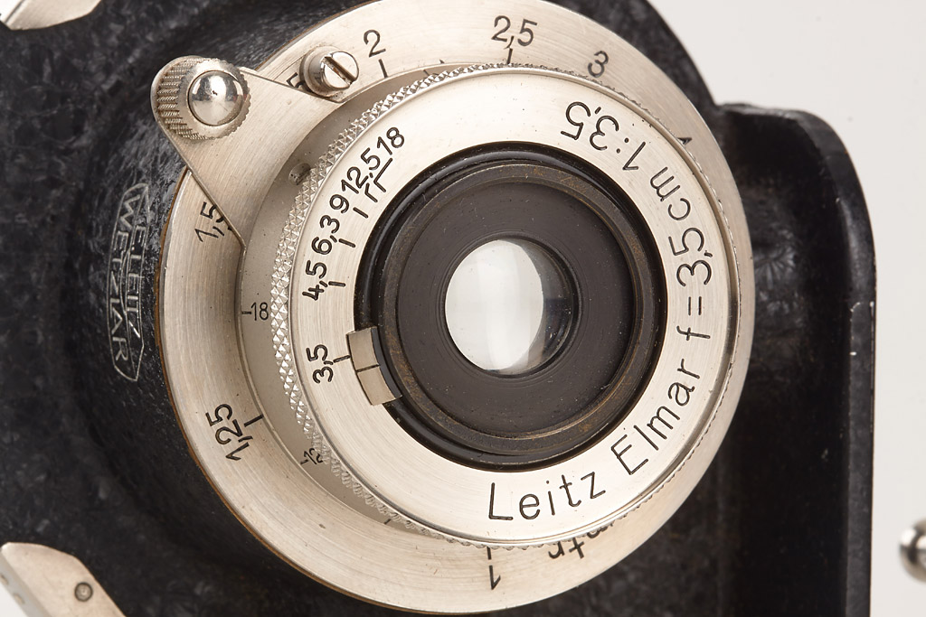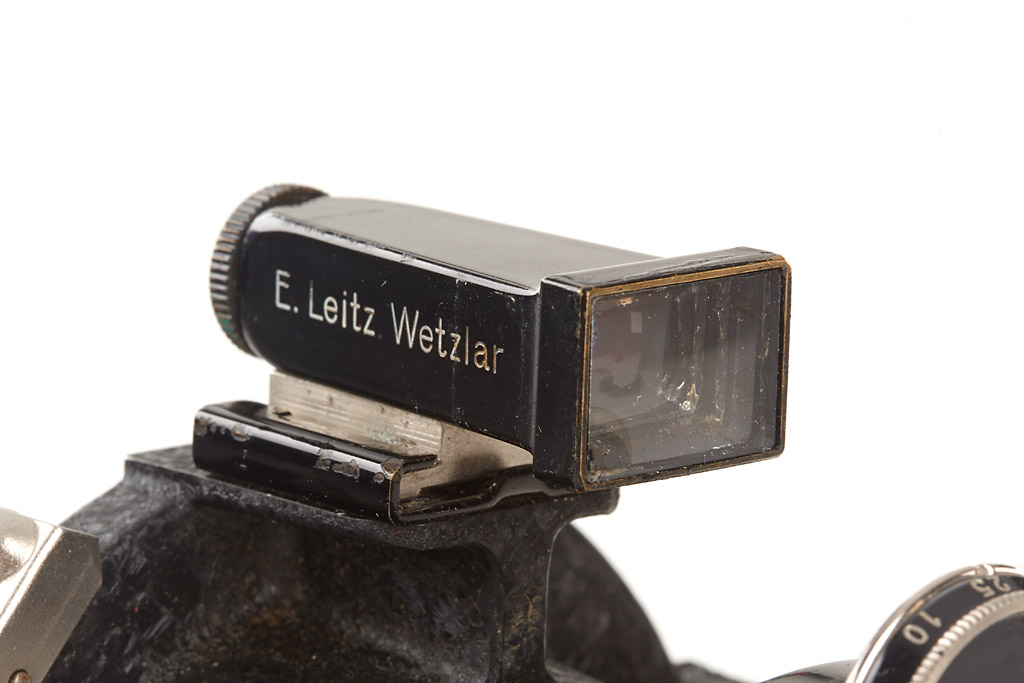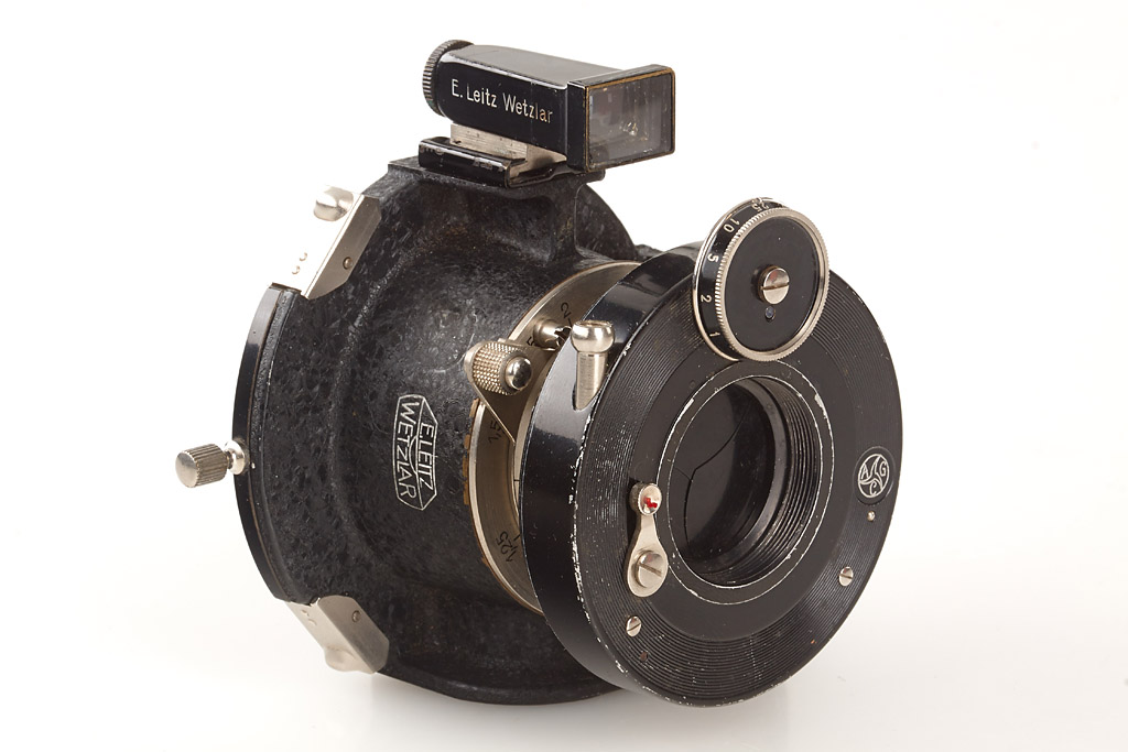 in fine original condition with un-numbered nickel Elmar 3.5/3.5cm, black/nickel WEISO 3.5cm finder engraved 'E. Leitz Wetzlar Germany', shutter, cable release, one film holder, red maker's box for the single exposure housing