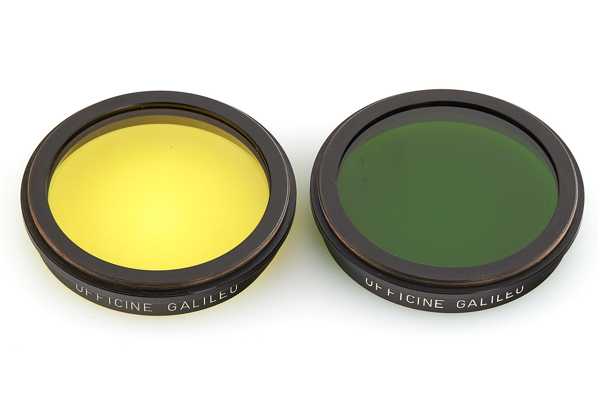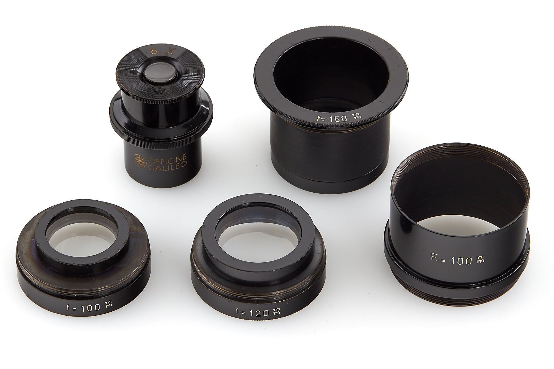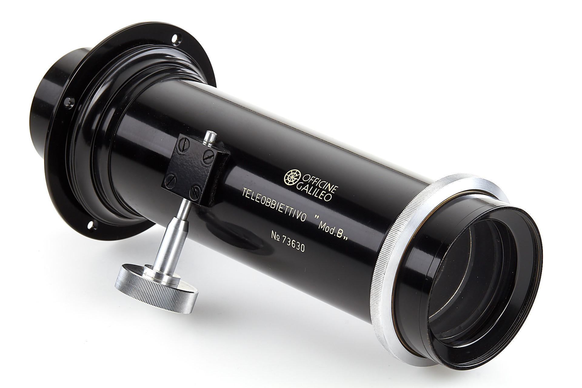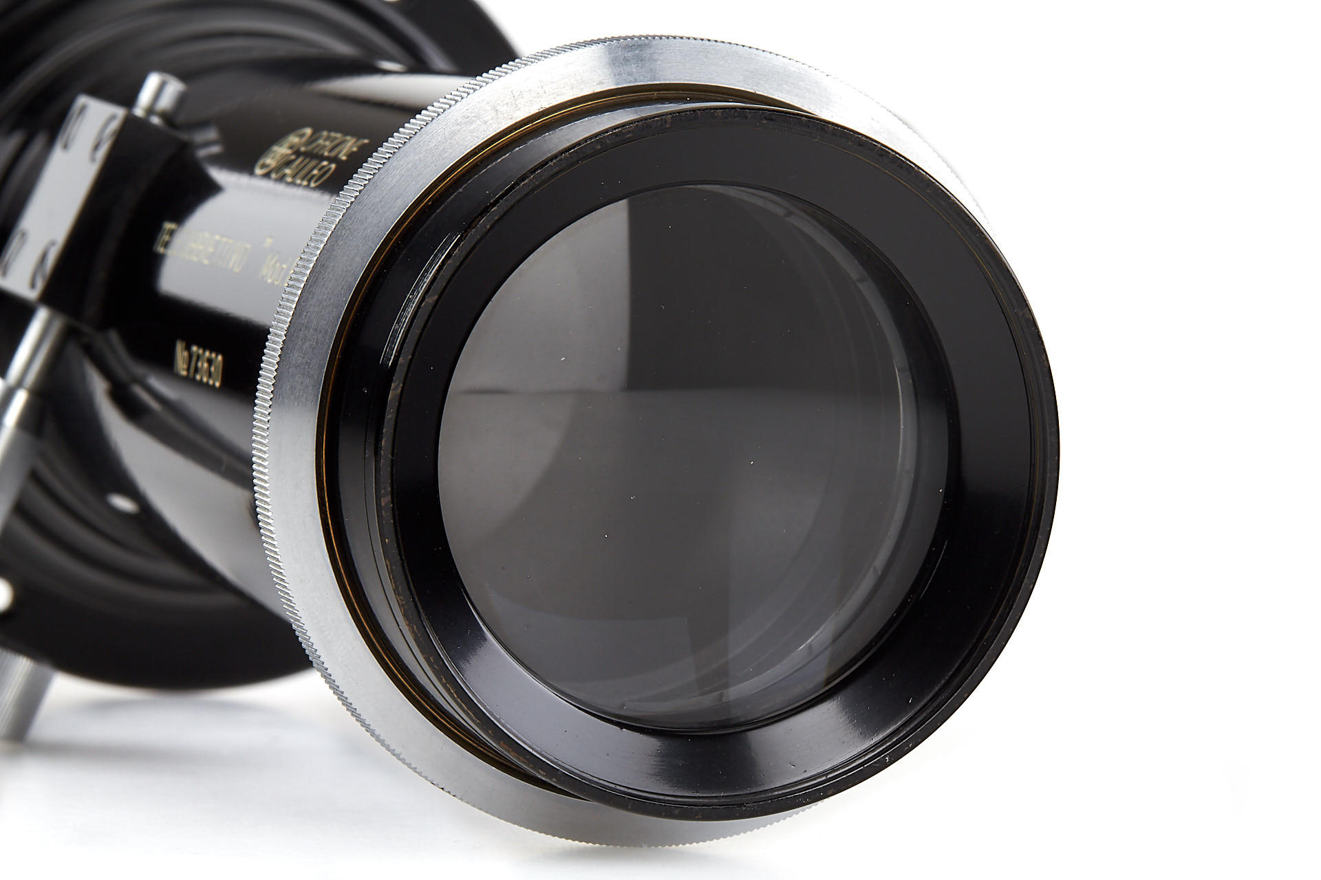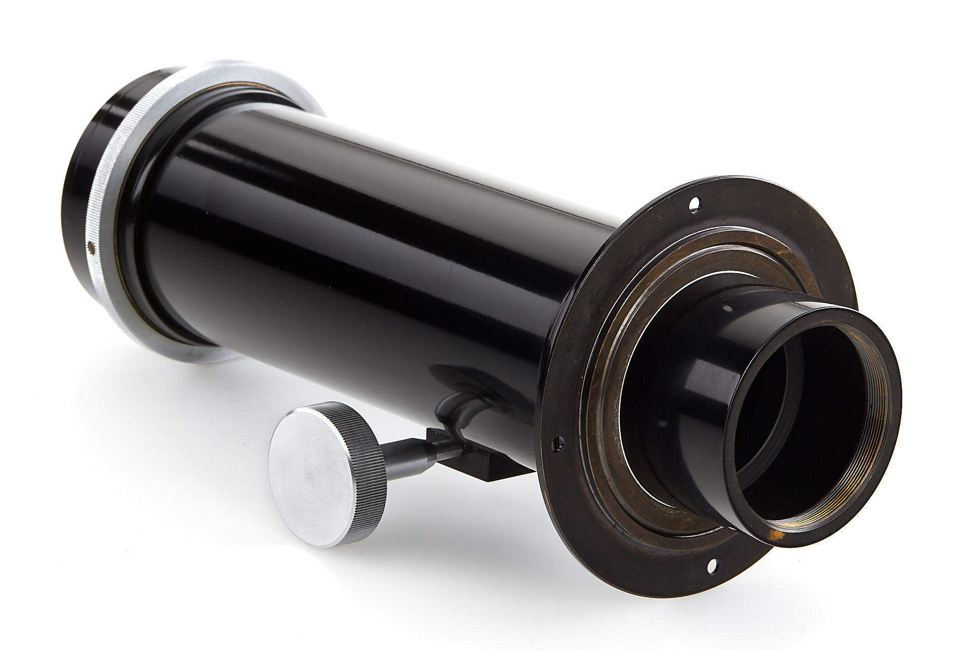 near mint tele lens with 3 exchangable focal lenght lenses (100,120 and 150mm, clean optics), in black paint and with chrome fittings, with two filters in maker's red outfit box with black velvet inside (slightly worn)