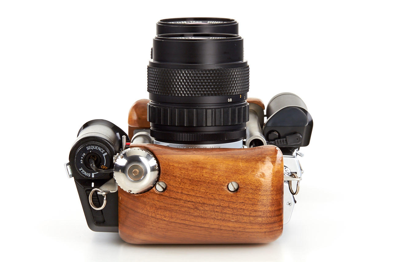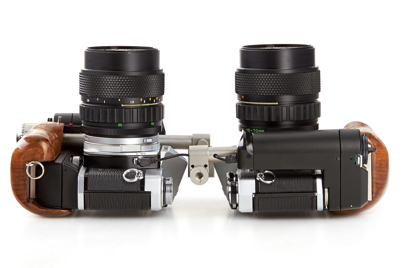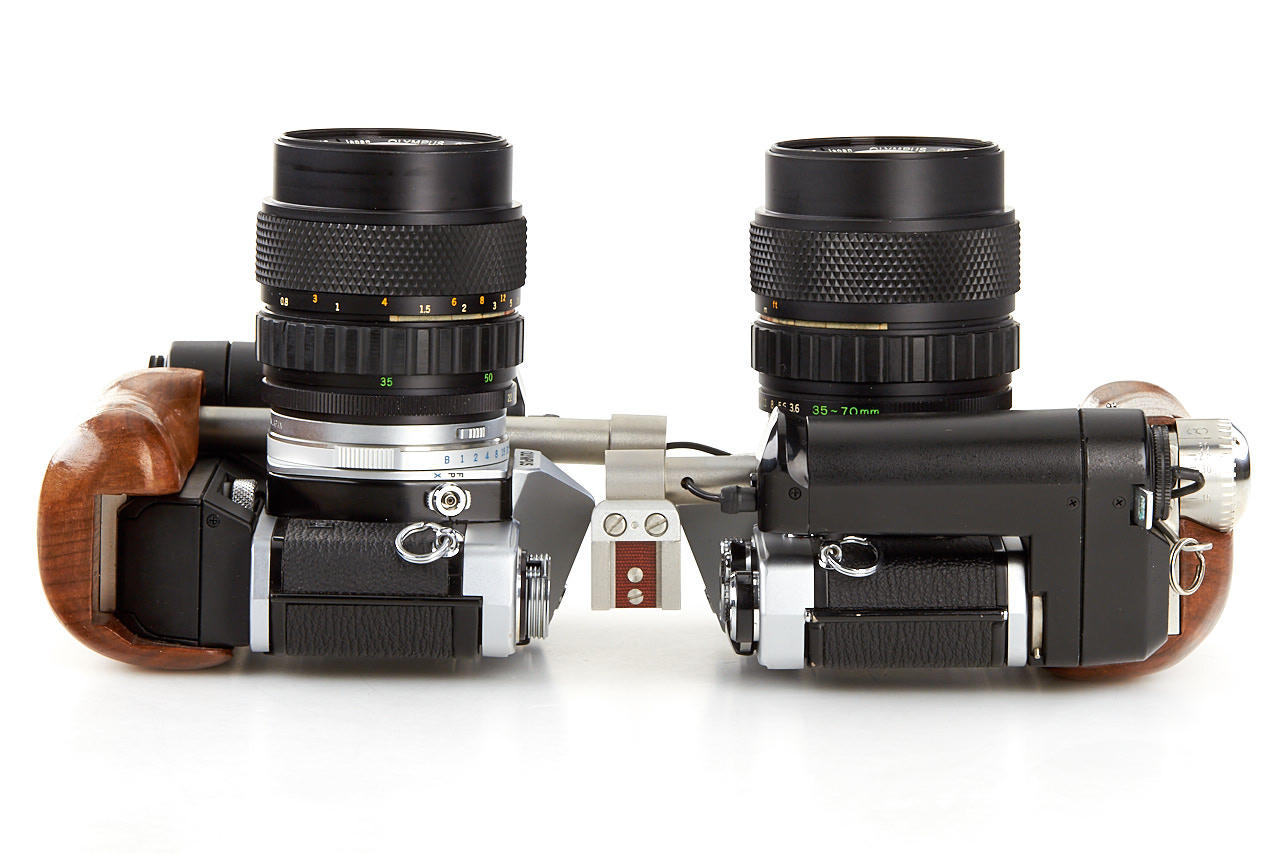 custom made stereo bracket for two Olympus OM-1 cameras to use them as a stereo outfit, equipped with comfortable wooden grips and connection to the motors, the angle of the cameras can be adjusted to exact distance with a knob on the left grip, incl. two OM-1n cameras with motor drives, two Zuiko Auto-Zoom 3.6/35-70mm no.202247 and 221837 (with front caps and hoods), a very interesting and high quality assembly