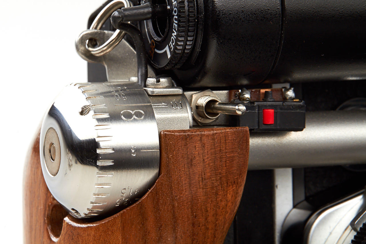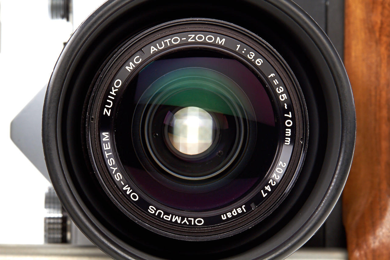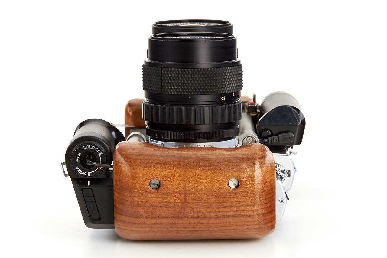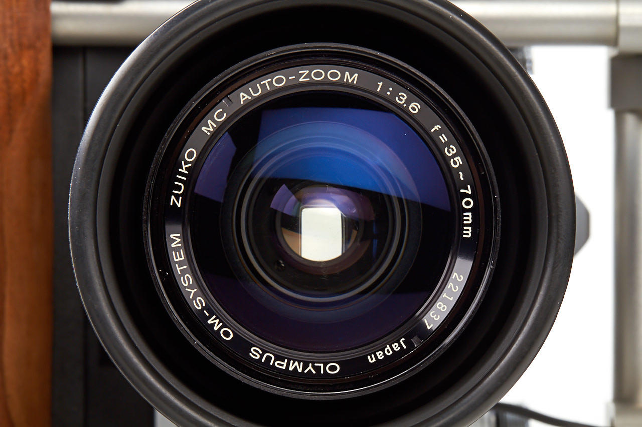 custom made stereo bracket for two Olympus OM-1 cameras to use them as a stereo outfit, equipped with comfortable wooden grips and connection to the motors, the angle of the cameras can be adjusted to exact distance with a knob on the left grip, incl. two OM-1n cameras with motor drives, two Zuiko Auto-Zoom 3.6/35-70mm no.202247 and 221837 (with front caps and hoods), a very interesting and high quality assembly