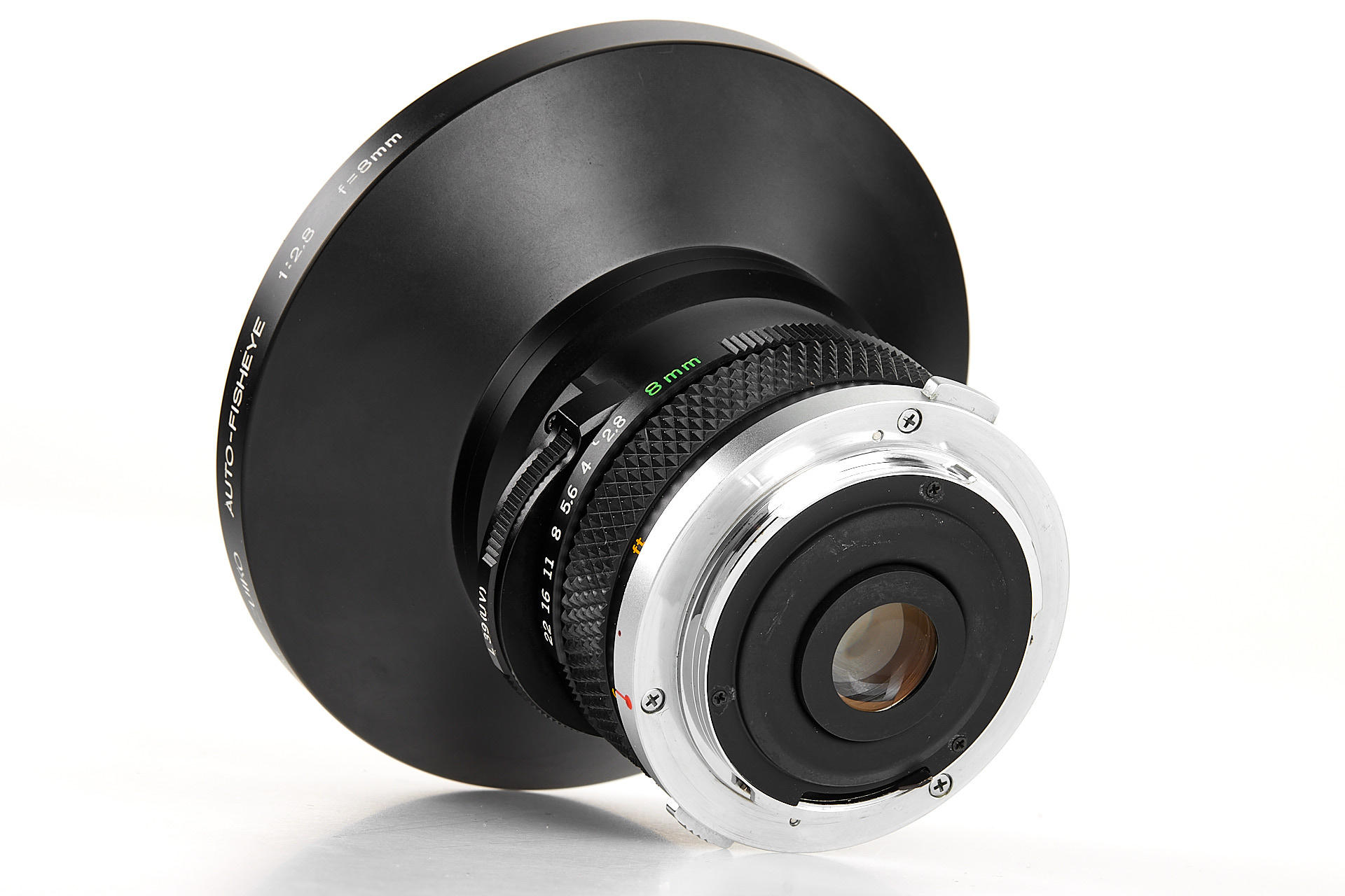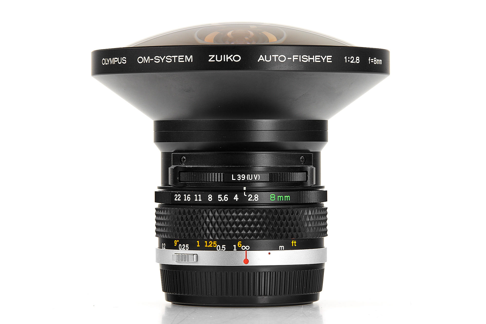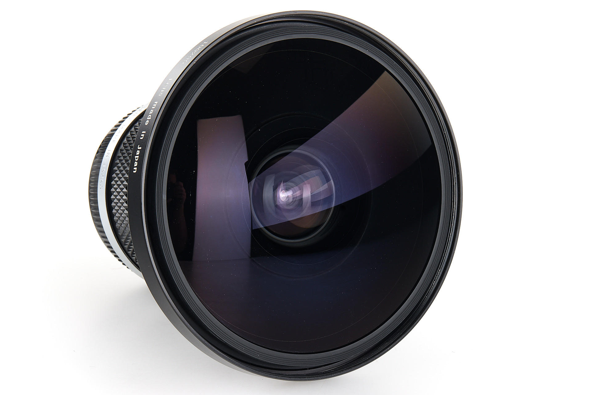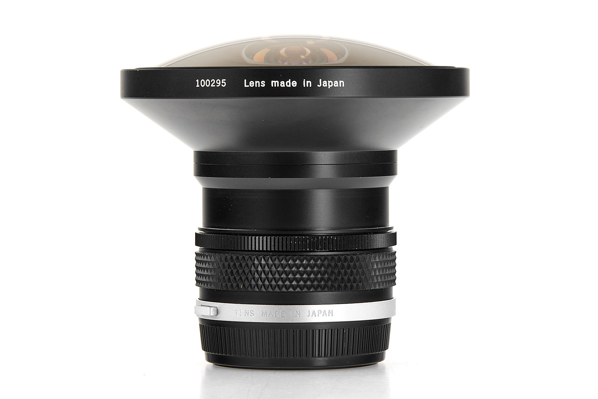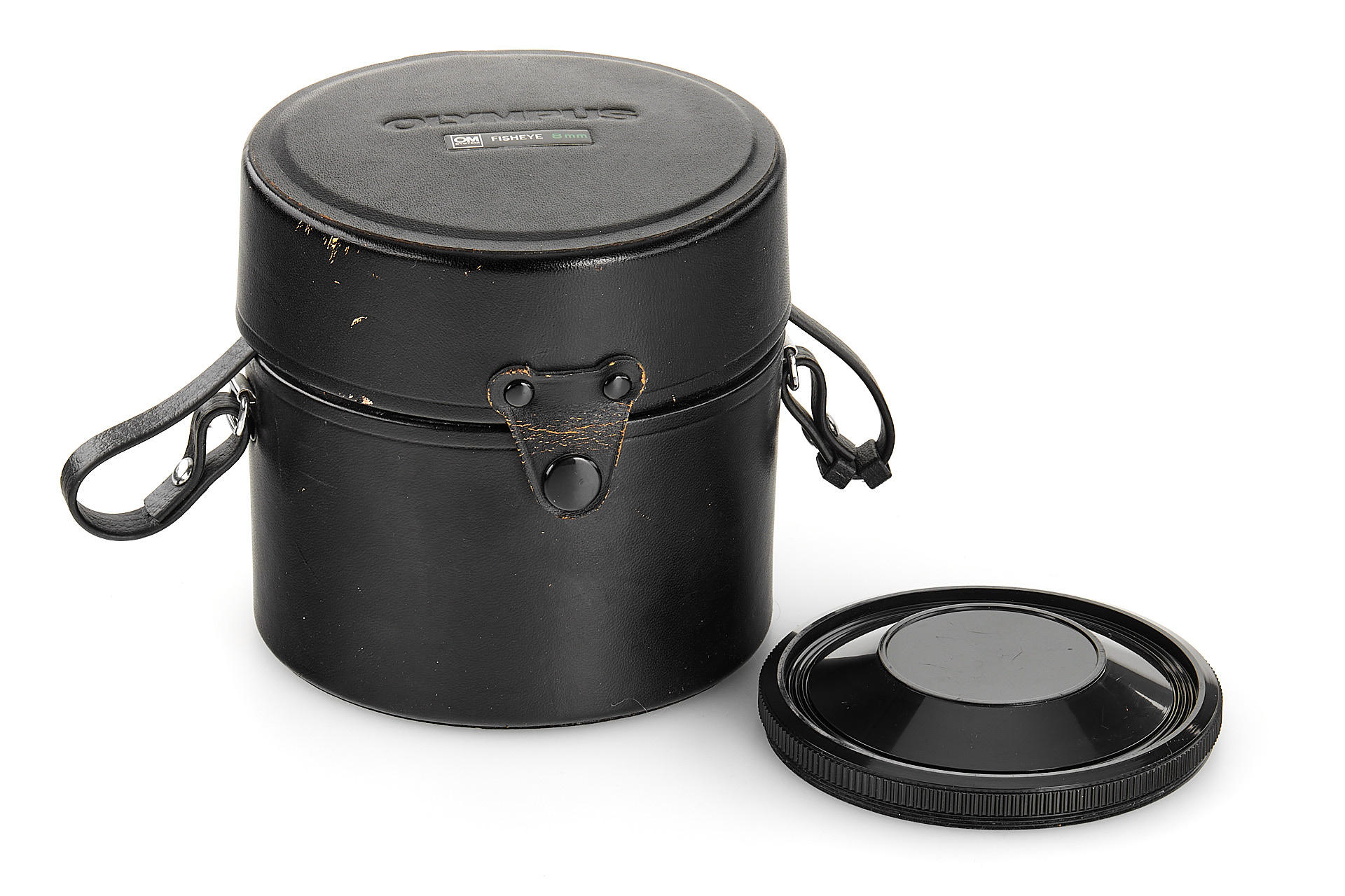 Rare and very fast fisheye lens covering an angle of view of 180°, in near mint condition, (very good lenses), with both front and rear caps and leather keeper