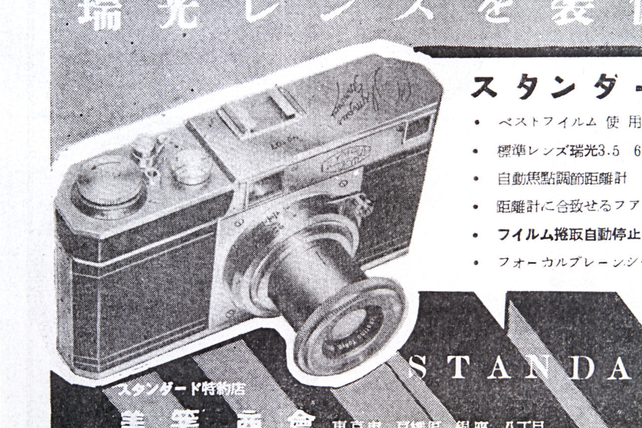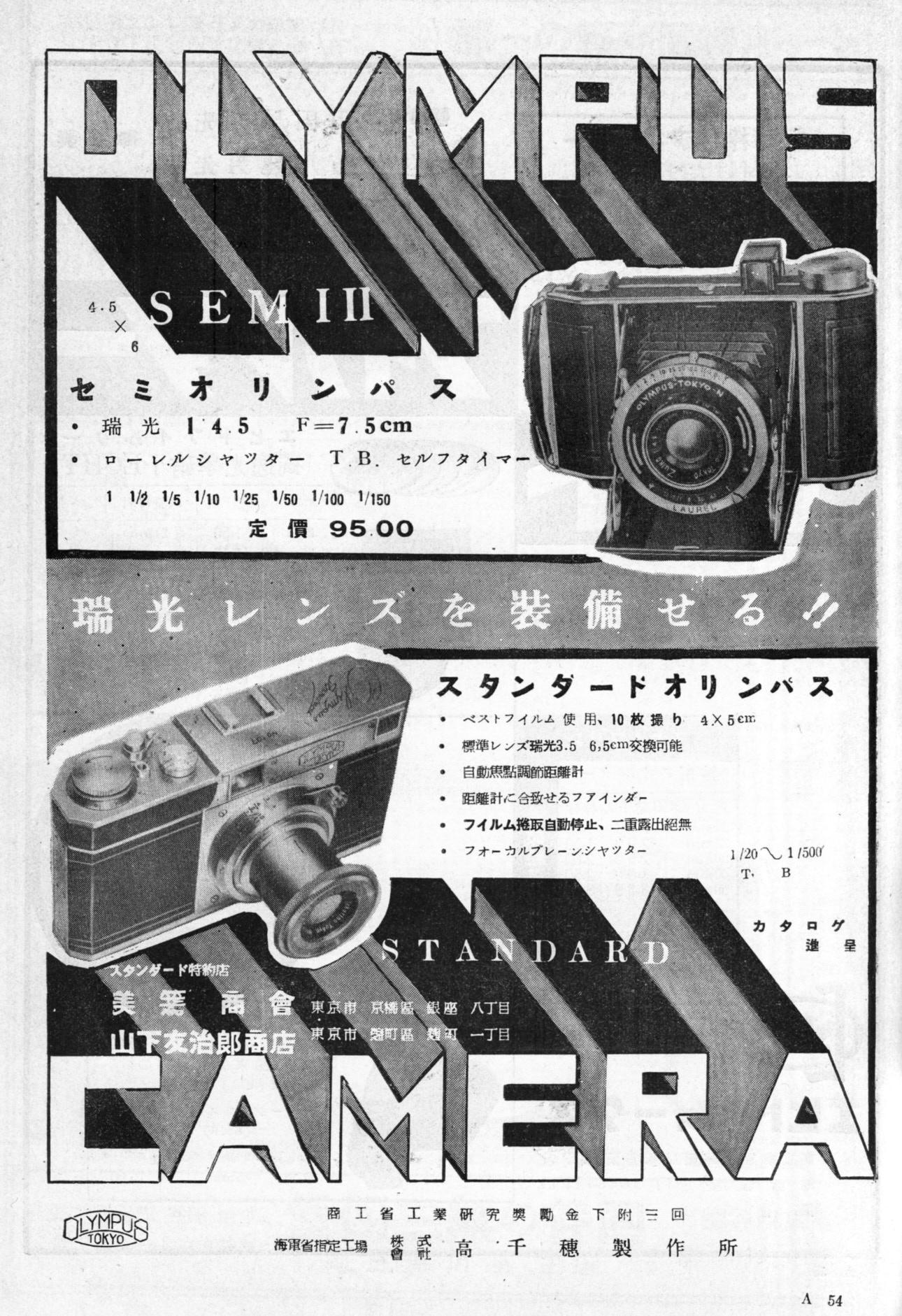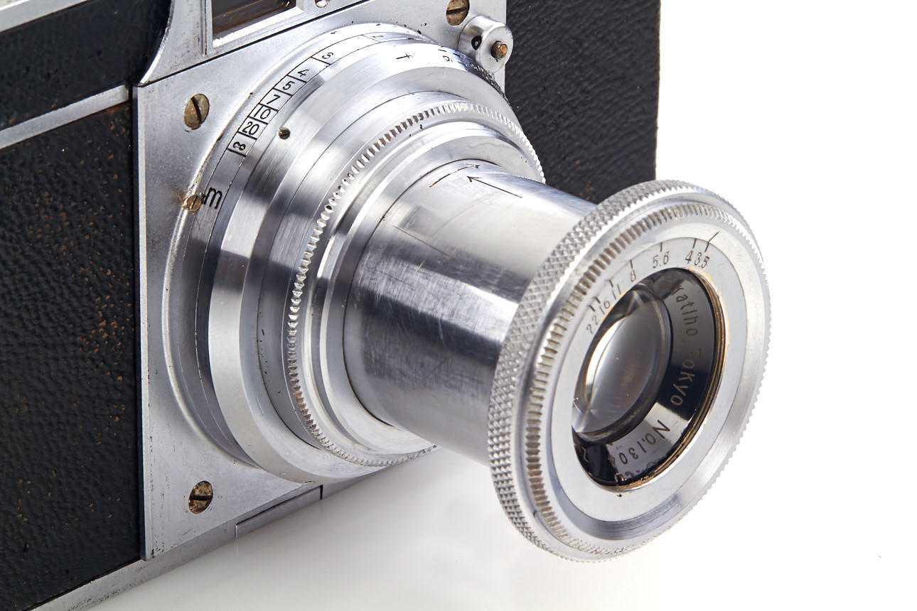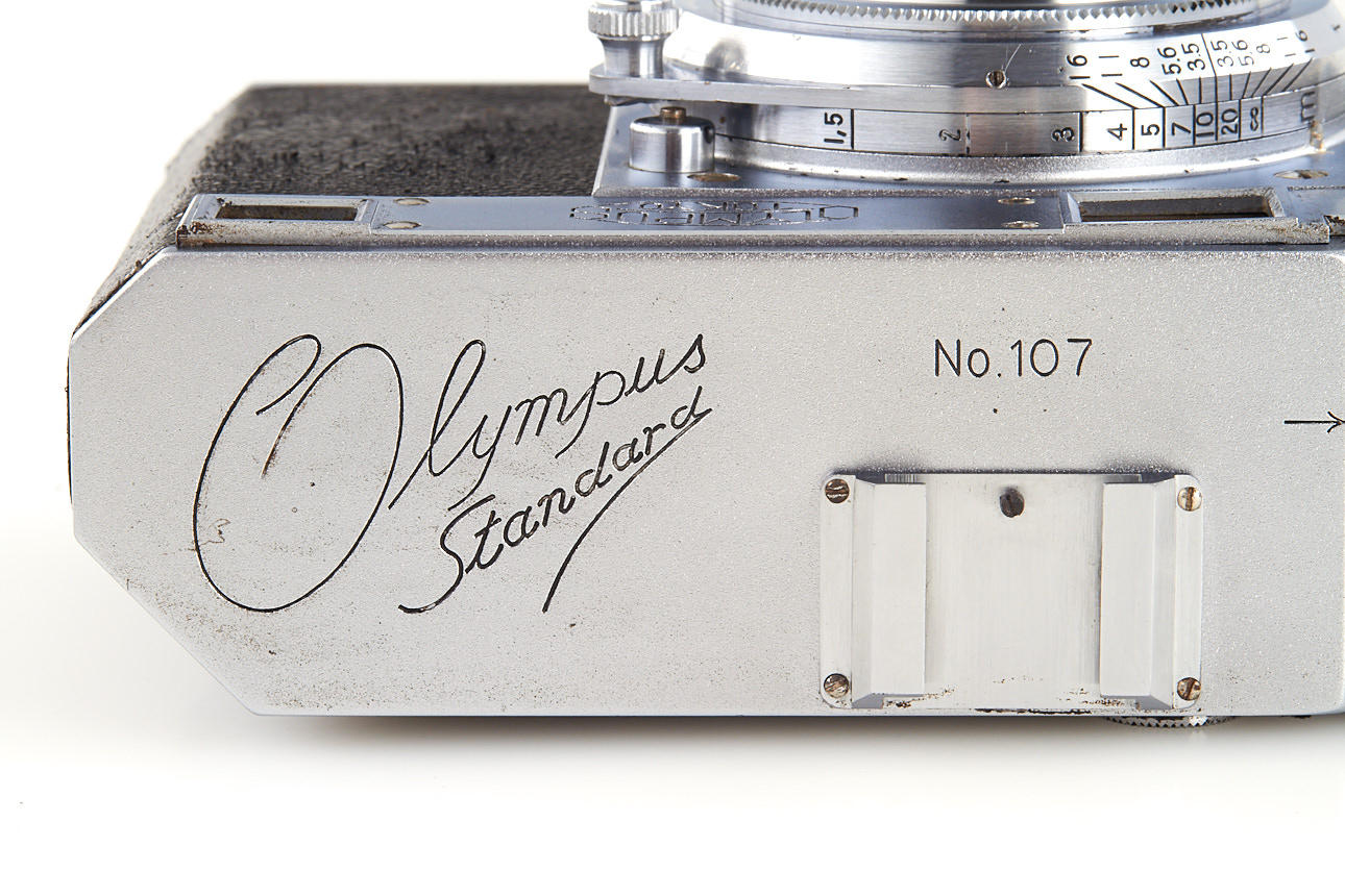 Sensational discovery of the first Olympus camera: Only 10 of these Prototypes were made (nos.101-110), only three are known to exist (nos.102, 107, 110). Exactly this camera no.107 was used to advertise the new Olympus product in Asahi Camera magazine from November 1937. It comes with the matching interchangeable Takatiho Tokyo 3.5/65mm no.1304. The Olympus Standard (オリンパス・スタンダード) is a rangefinder camera, made in 1937 by Takachiho (predecessor of Olympus) at prototype level. It takes 4×5cm pictures on 127 film. It has a coupled rangefinder combined with the viewfinder, and a focal plane shutter with T, B, 20–500 speeds. The advance knob is at the right end of the top plate, as seen by the photographer. It simultaneously advances the film and winds the shutter, and its base is surrounded by an exposure counter. There is a red window at the left of the back, protected by a sliding cover and used to set the first exposure. The back is opened by a key under the camera, and is removable together with the bottom plate. There is a plate under the camera at the center, that slides forward to act as a support leg. Inside the back, the camera has a removable pressure plate, said to be made of aluminium. On the top plate, immediately to the left of the advance knob, there is a hole for a distant release connection. The shutter release itself is just behind, combined with a two-position selector, marked T and I. It is said that this selector is used for film loading, to disconnect the film advance from the shutter operation. When set on the T position, the coupling mechanism is disengaged and the film is freely wound until the number 1 appears in the red window, then the exposure counter is manually reset to zero and the selector is switched to the I position for normal operation. (It is possible that the same selector is also used for T exposures, hence the T and I indications.) To the left of the distant release hole is the shutter speed selector, with the following positions: B, 20, 30, 50, 100, 200, 500. Just to the left there is a step in the top plate, corresponding to the viewfinder window, with a small arrow engraved to indicate the selected shutter speed. The accessory shoe is slightly offset to the left, and the serial number is engraved just in front of it: No 107. The left end of the top plate is engraved Olympus Standard in cursive script. The rangefinder window is at the left end of the body. Between the two windows is an OLYMPUS TOKYO logo. The same logo is also embossed in the back leather, on the right. The Olympus Standard has an interchangeable lens, screwed to the front of the focusing helical. The helical itself is attached to the body and does not come off, the same as on the Contax. It is driven by a tab and has an infinity lock. Quite unusually, the distance scale is fixed and the depth-of-field indications are on the rotating part. No other lens mount is visible, and it is unclear how the tele and wide angle lenses would have been focused or coupled to the rangefinder. The standard lens is a Zuiko 65mm f/3.5, with an all chrome finish. It is collapsible, with an internal three-lug bayonet to maintain the extended position. The aperture ring is on the front and the aperture scale goes from 3.5 to 22. The lens bezel is black, with the following marking in white: Takatiho Tokyo No.1304 Zuiko 1:3.5 f=65mm.