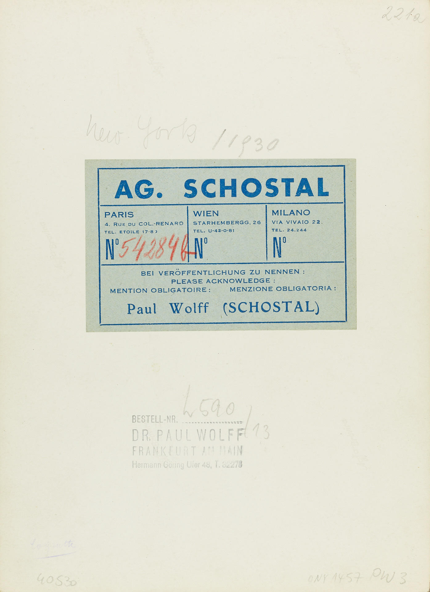 Vintage silver print 23,9 x 17,4 cm Photographer’s “DR. PAUL WOLFF, FRANKFURT AM MAIN” stamp with his handwritten order number on the reverse, agency label and several handwritten notations in pencil on the reverse
