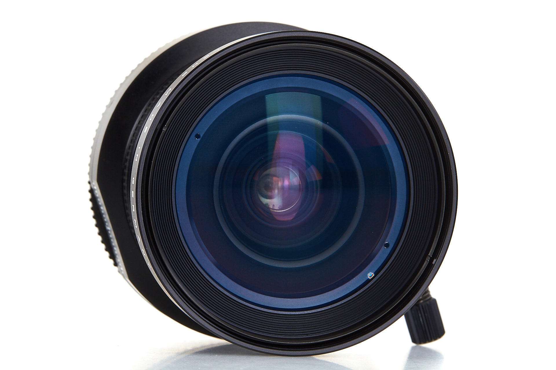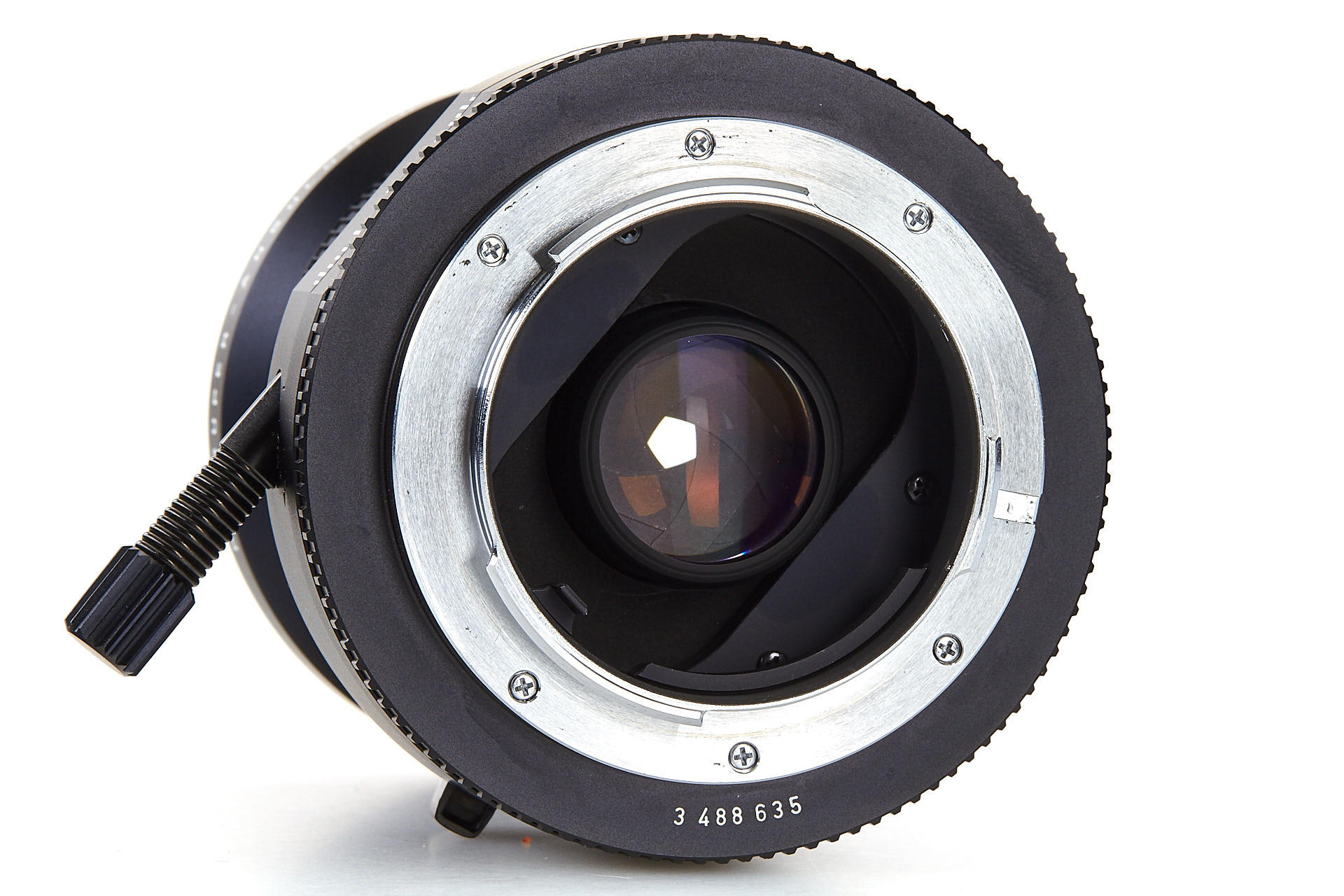 high-quality perspective correction lens in near mint condition, clean lenses but an approx. 2mm coating defect on the outer edge of the front element, with hood, leather keeper and maker's box