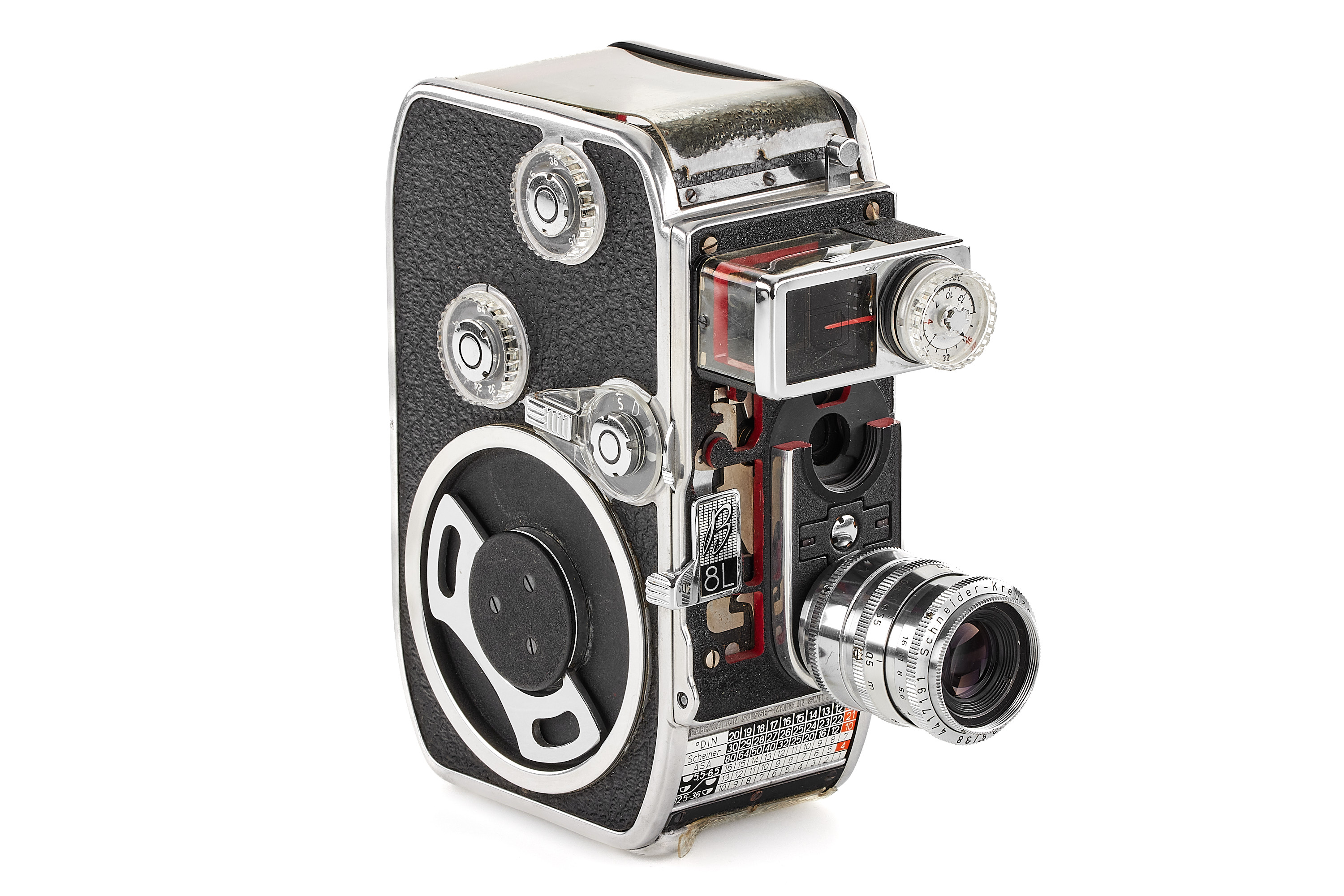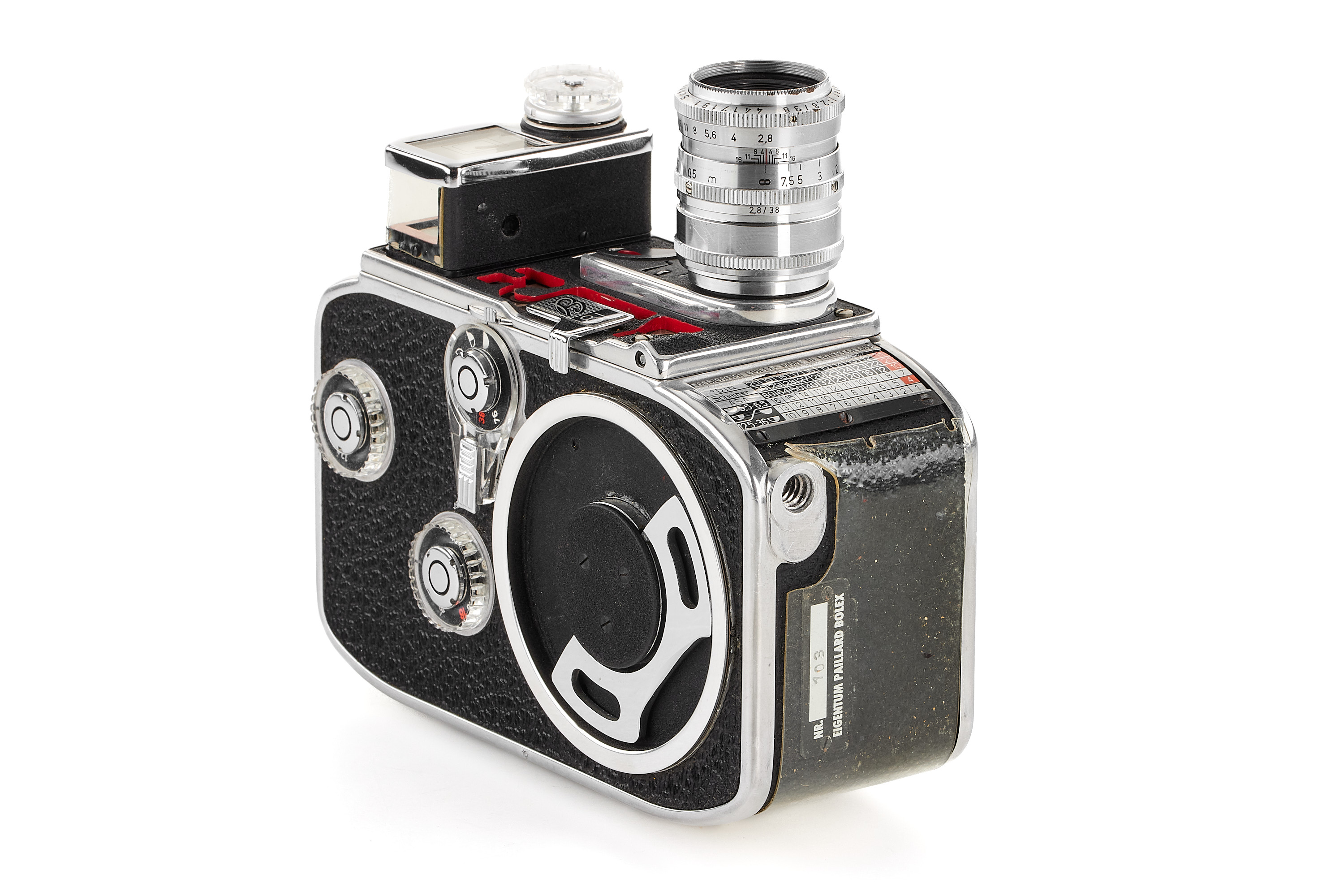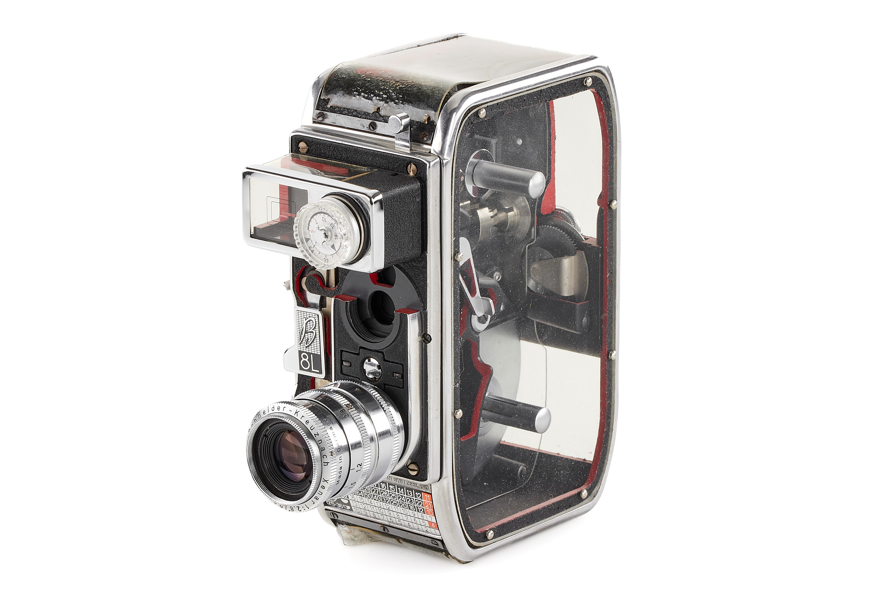 Very interesting and rare display model of the S8 film camera B 8L with large cut-outs showing the mechanism, in near-mint condition and working order, plate with 'Eigentum Paillard Bolex' (property of Paillard Bolex), with D-mount Xenar 2.8/38mm no.4417191 (hazy).