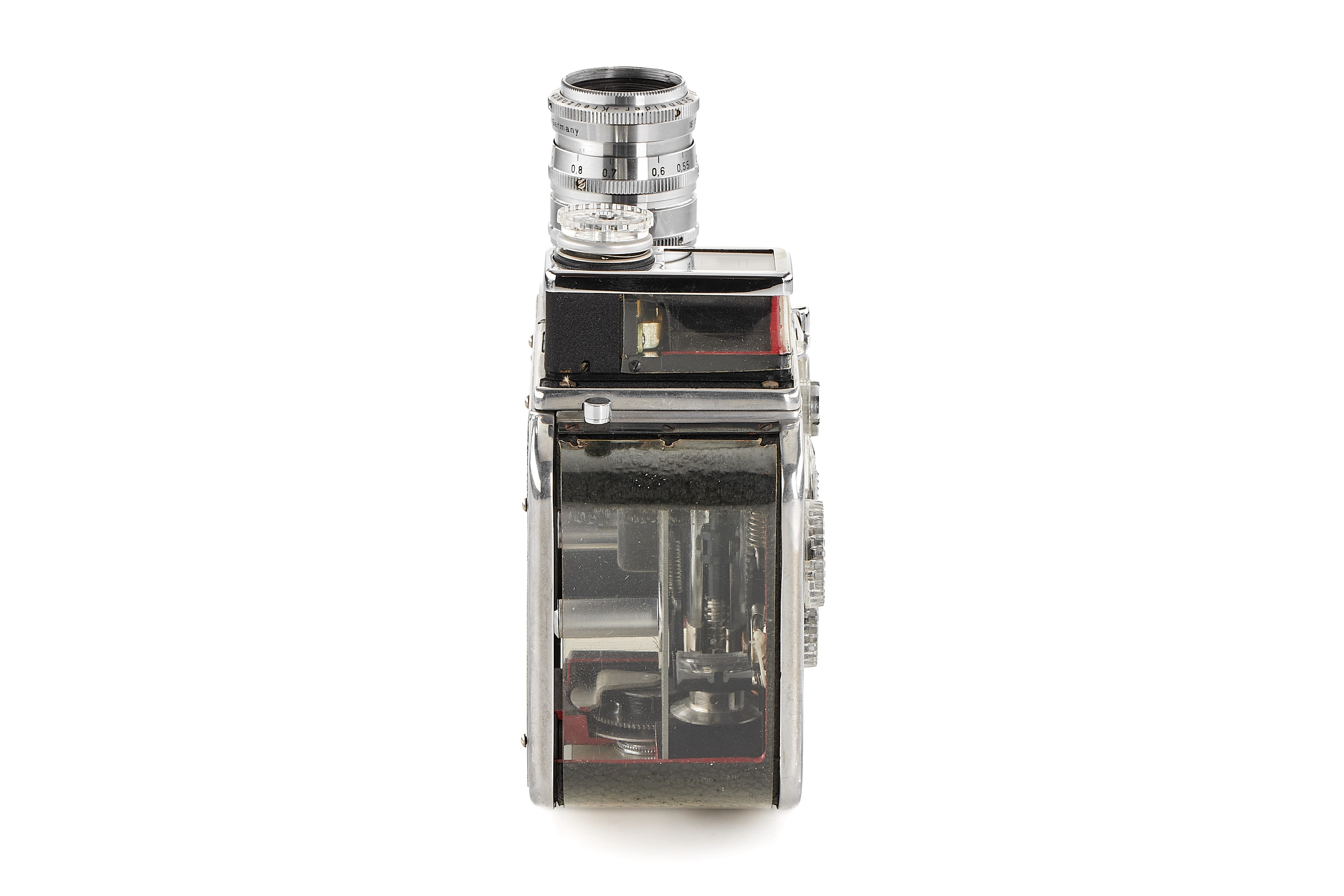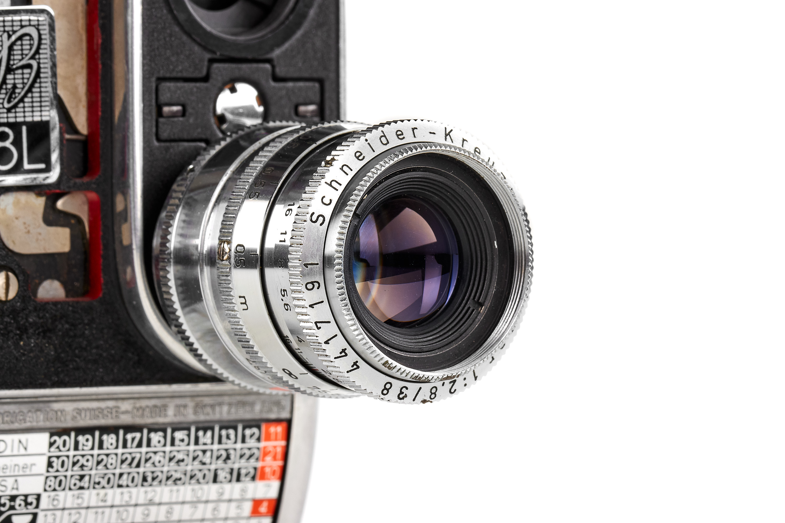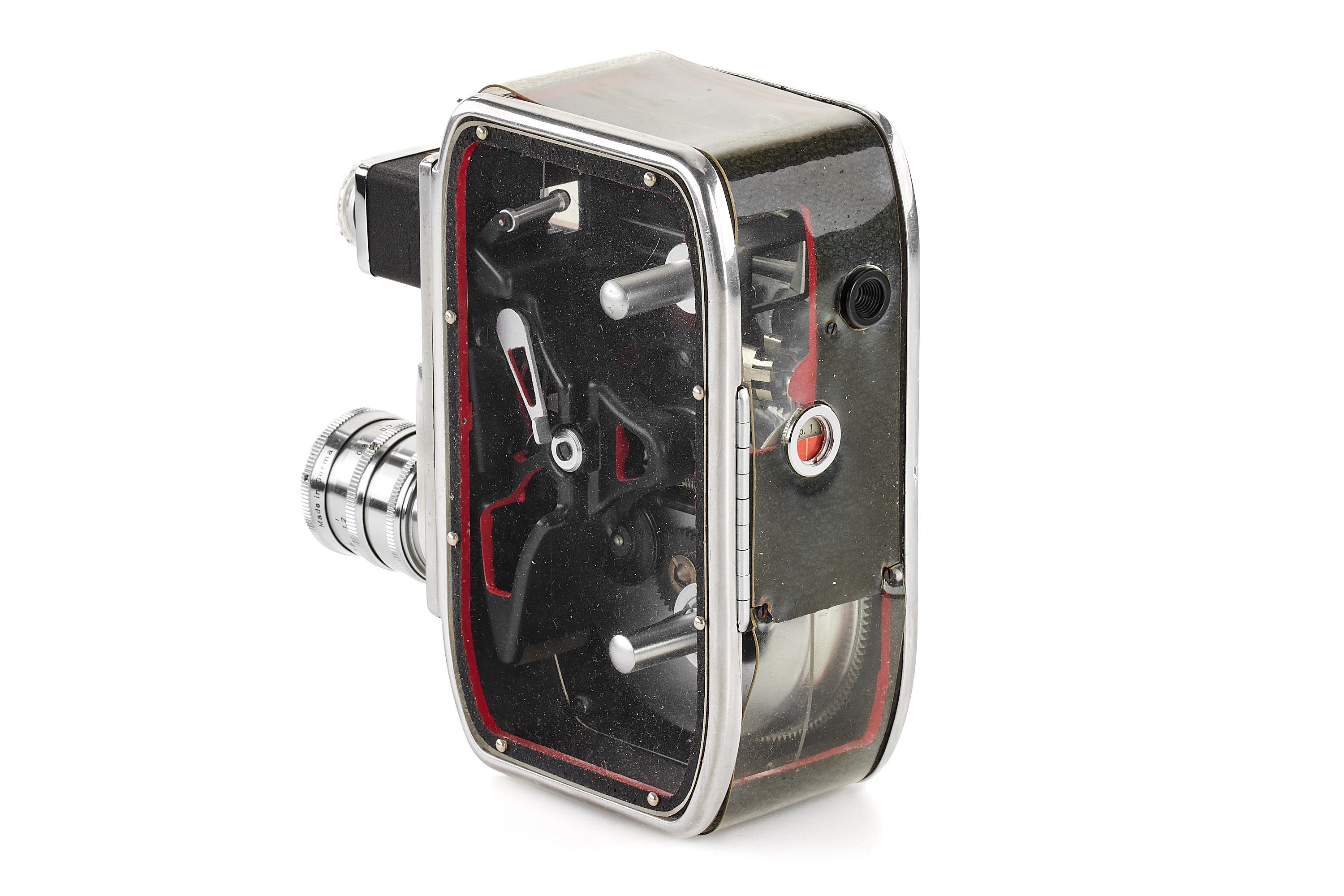 Very interesting and rare display model of the S8 film camera B 8L with large cut-outs showing the mechanism, in near-mint condition and working order, plate with 'Eigentum Paillard Bolex' (property of Paillard Bolex), with D-mount Xenar 2.8/38mm no.4417191 (hazy).