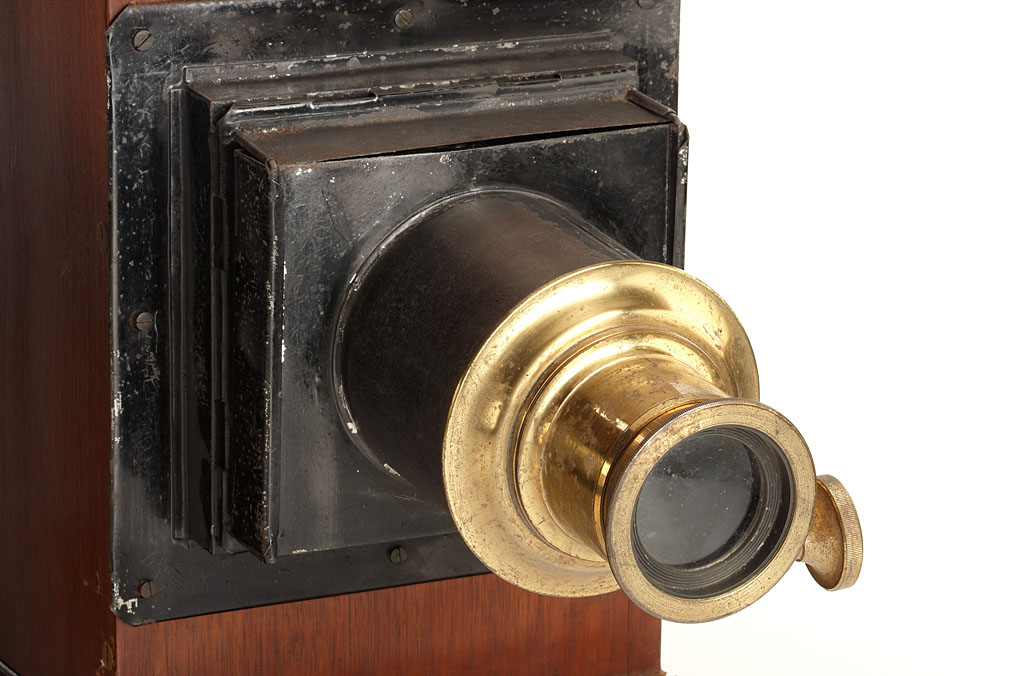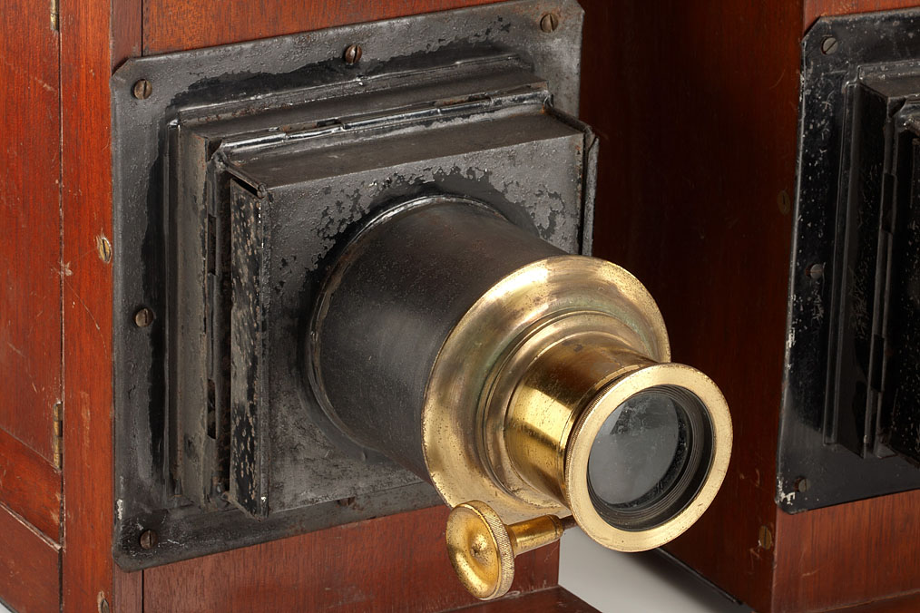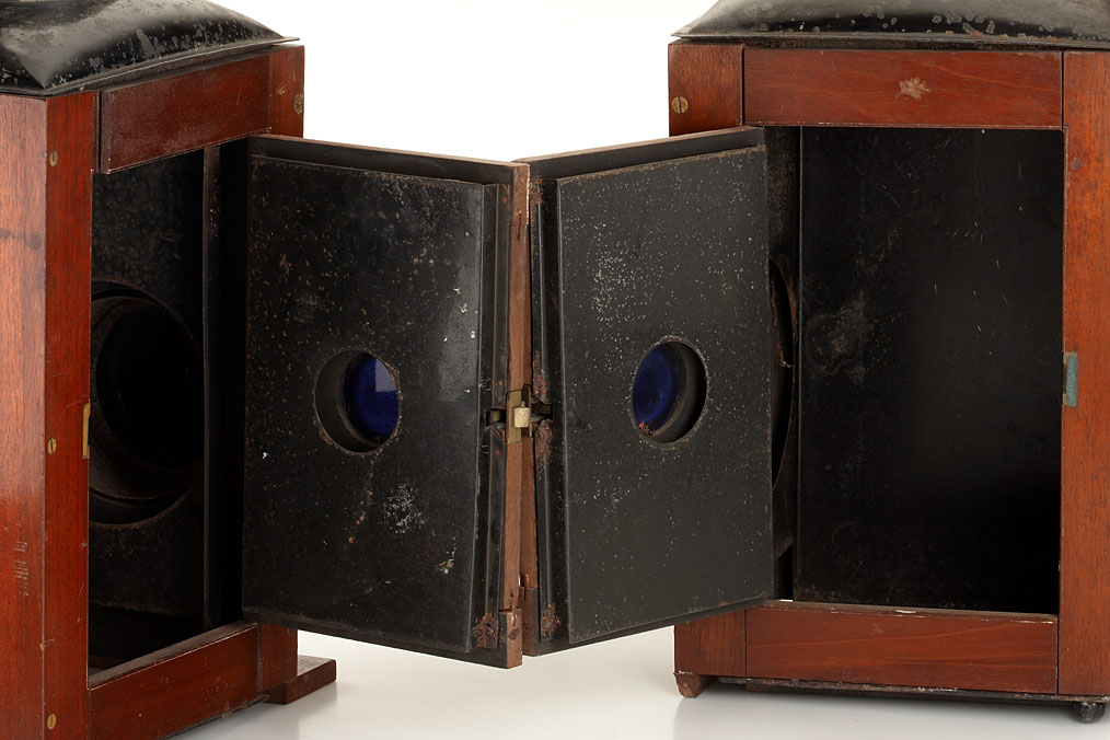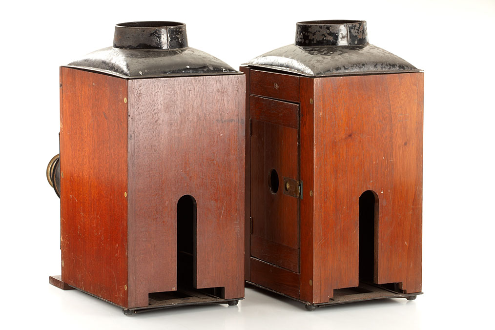 a pair of large professional lanterns, wooden body with tin made roofs and lens holders, lens with rack and pinion focus, one lantern has the door an the left, the other one on the right side, both doors have a brass locker and a round window with dark blue glass in order to control the arc-light, one lantern carries a bone-made makers label engraved 'IMPROVED DISSOLVING VIEW APPARATUS – STEREOSCOPIC COMPANY – OPTICAL & PHILOS.L. INS.T. DEP.T – 110 & 108 REGENT ST. W', although both lanterns would need some restoration, this is still a rare and interesting lot. Ex-Abring Collection