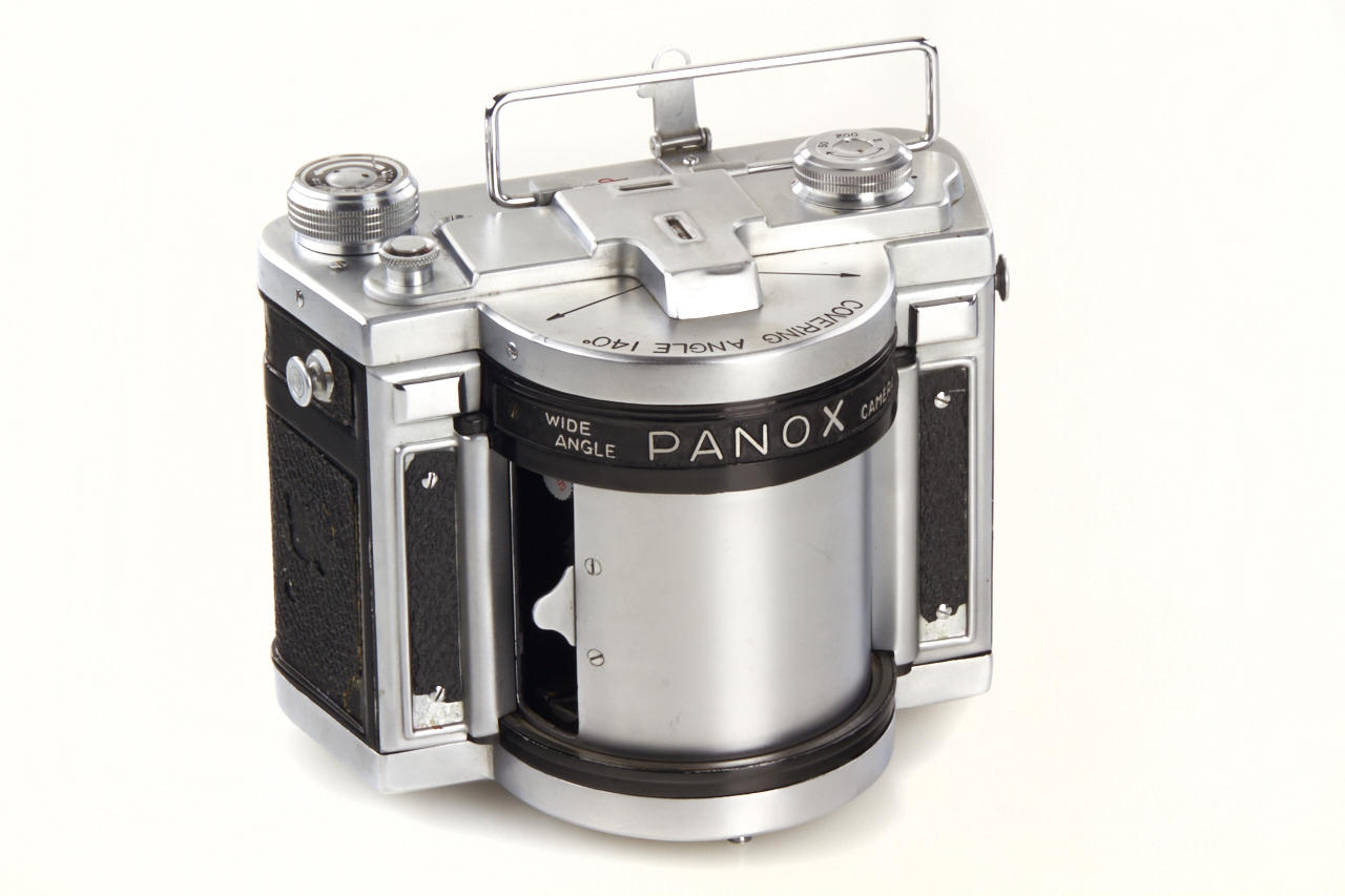 very rare wide angle camera for 140° exposures on 120 film, in very good working condition (missing parts of the vulcanite on the right side and on front), Panox 2.8/50mm no.33158, with everready case and maker's box