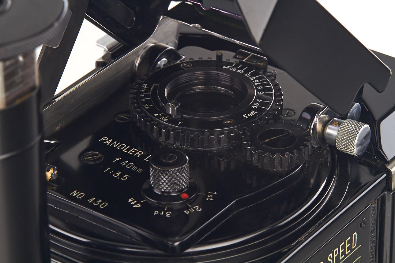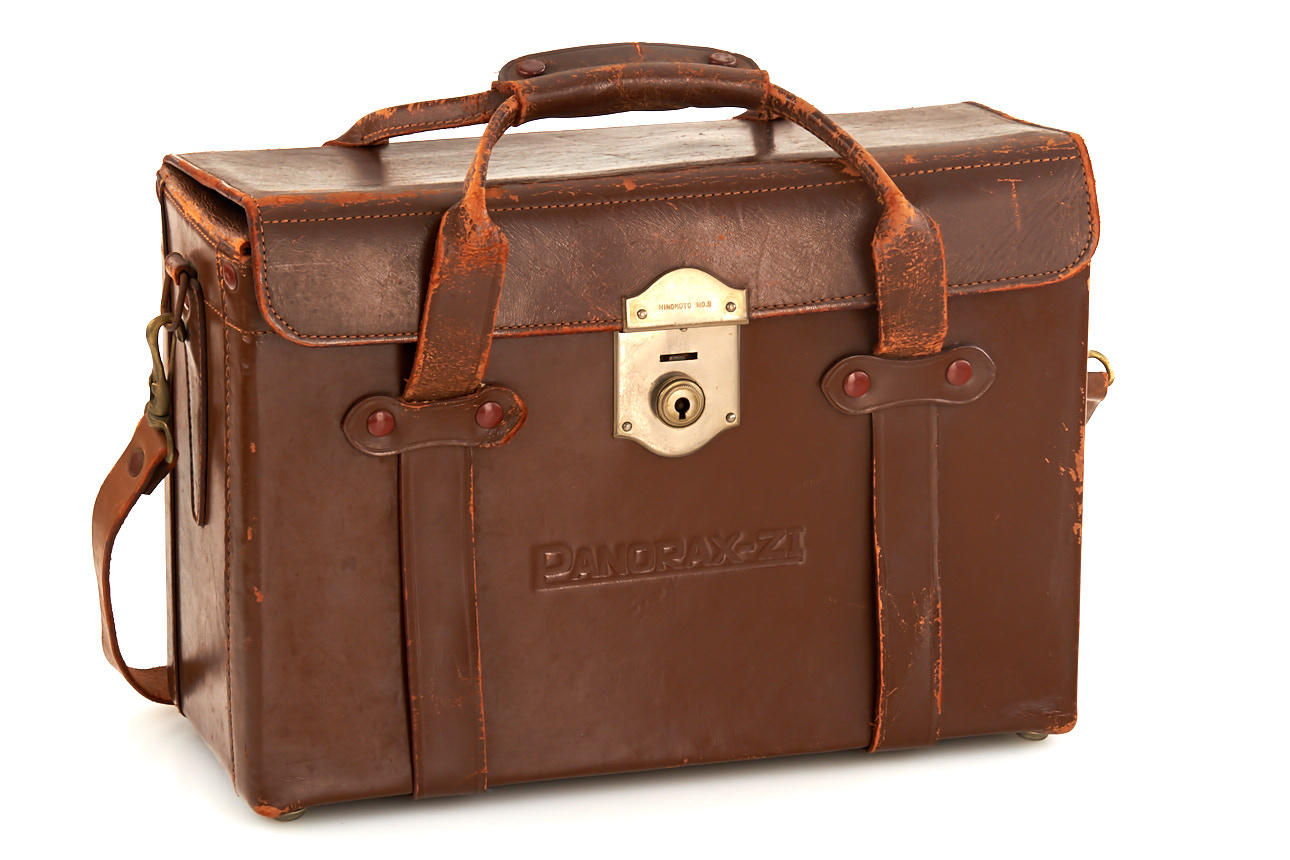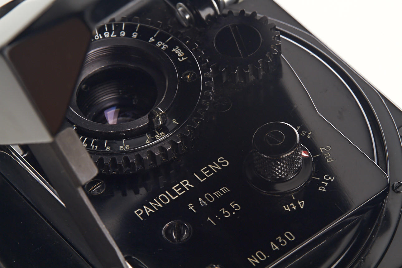 Japanese panoramic camera for 45° - 360° exposures (24x245mm) on 35mm film, Panoler lens 3.5/40mm no.430, very rare, complete with cap, periscope finder, all accessories, original fitted maker's leather case - all in perfect condition