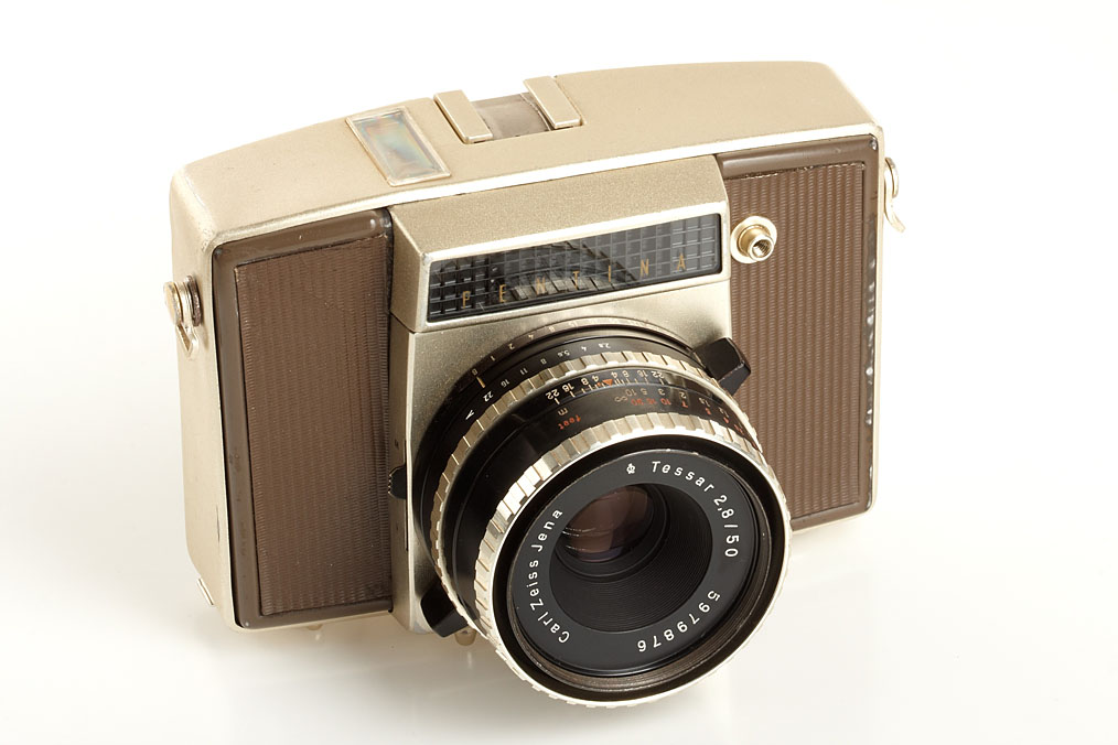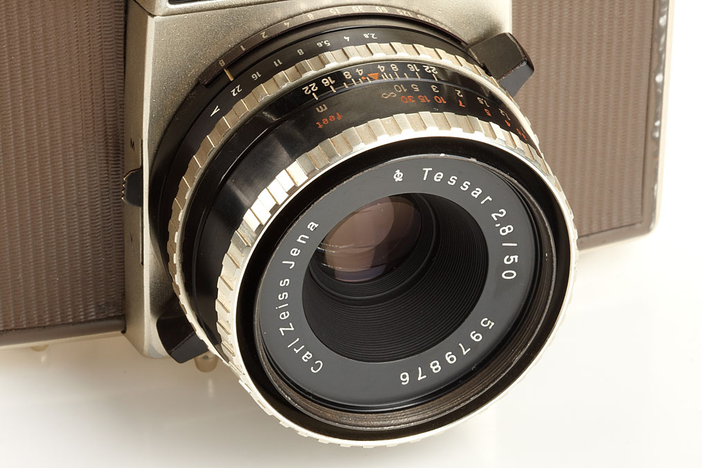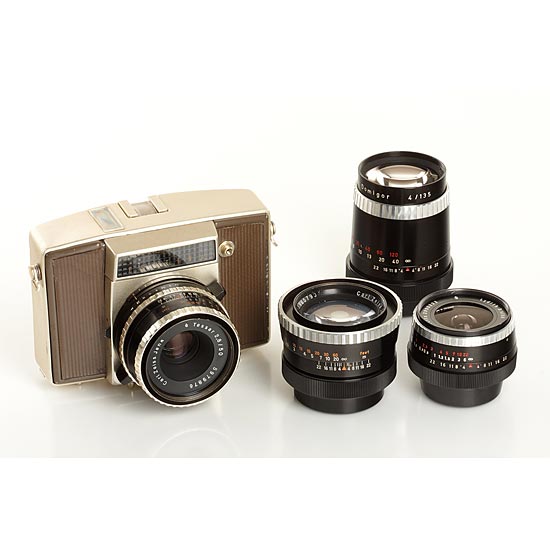 gold/brown body in working order with selenium meter, Tessar 2.8/50mm no.5979876, everready case, Lydith 3.5/30mm no.2990222 (caps, keeper), Cardinar 2.8/85mm no.5965799 (caps, keeper), Domigor 4/135mm no.3280973 (caps, keeper)