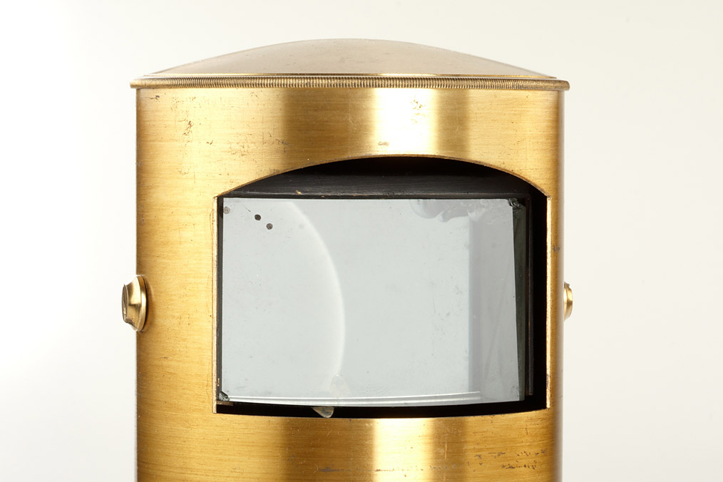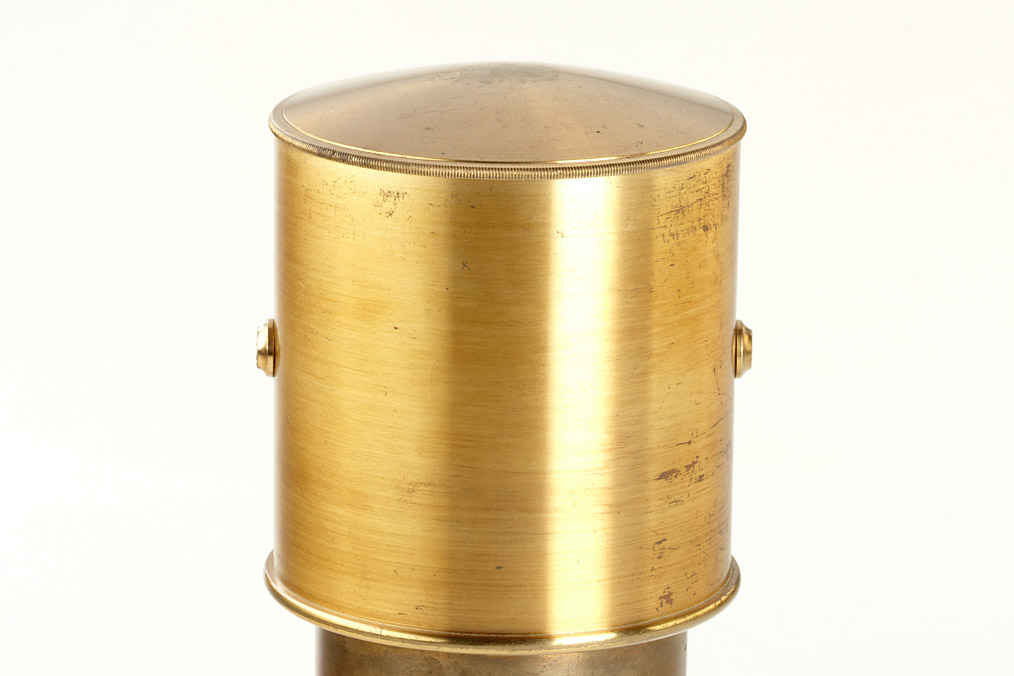 brass-made camera obscura for tent use with adjustable glass prism. This kind of device was commonly used by painters in the 18th and 19th century. Fitted to the top of a lightproof tent made of black cloth, the prism would direct refracted light inside onto a paper surface therefore allowing an artists to trace the outside scene. The prism shows some minor chipping otherwise in very good condition. Height: 19cm. Ex-Naylor Collection.
