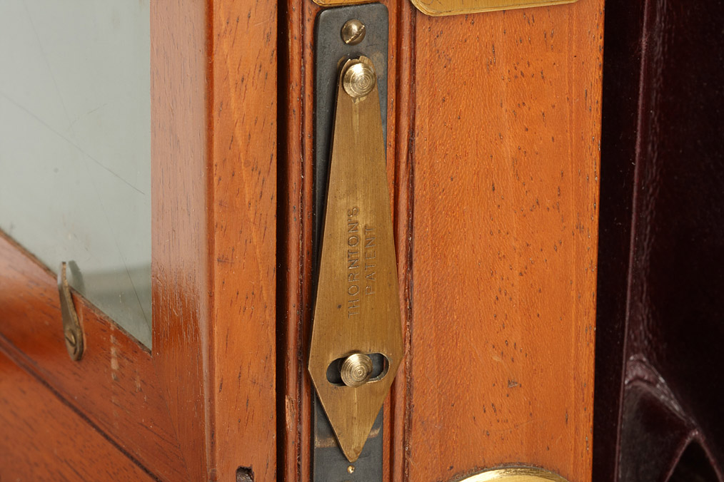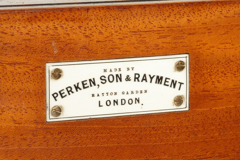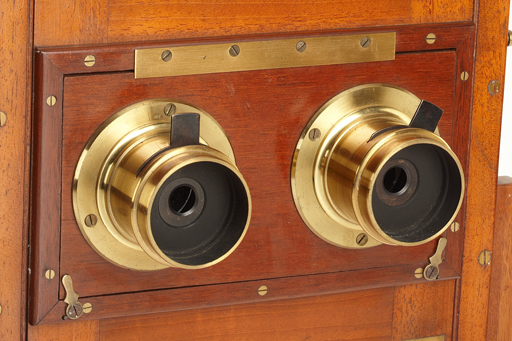 13x18cm, very decorative British stereo tailboard camera in very fine original condition, red/brown bellows, two unmarked lenses with waterhouse stops, the plaque on front marked: Made by PERKEN, SON & RAYMENT Hatton Garden LONDON
