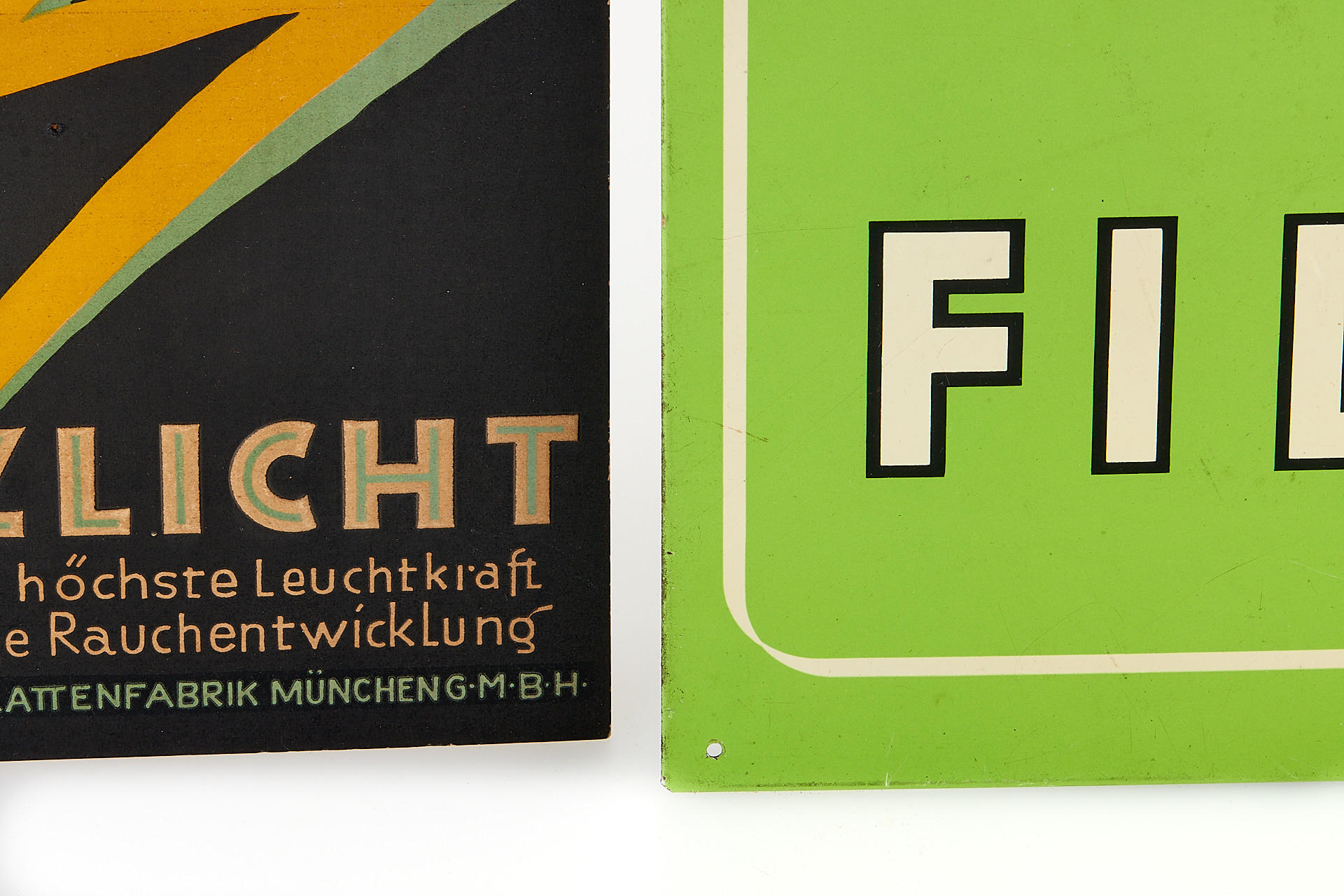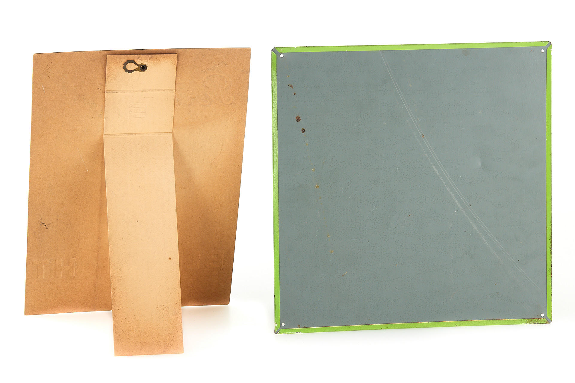 An early Perutz advertising counter plate made of embossed cardboard (18x26cm) in almost mint condition and a painted metal advertising sign (24x25cm) in very good condition