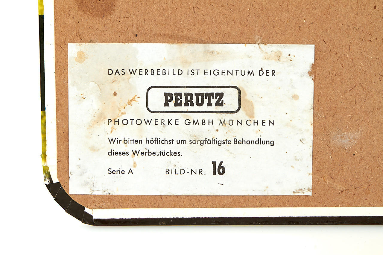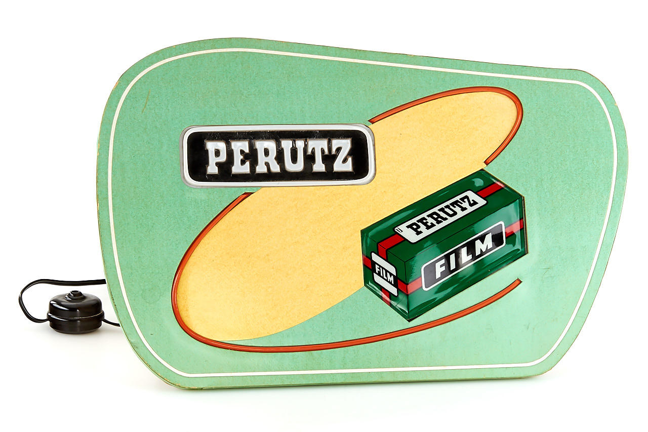 original Perutz vintage advertising: a 'Perutz Film' lightbox c.45cm long, with original cable, and a 46x61cm poster mounted on plywood, both in excellent condition