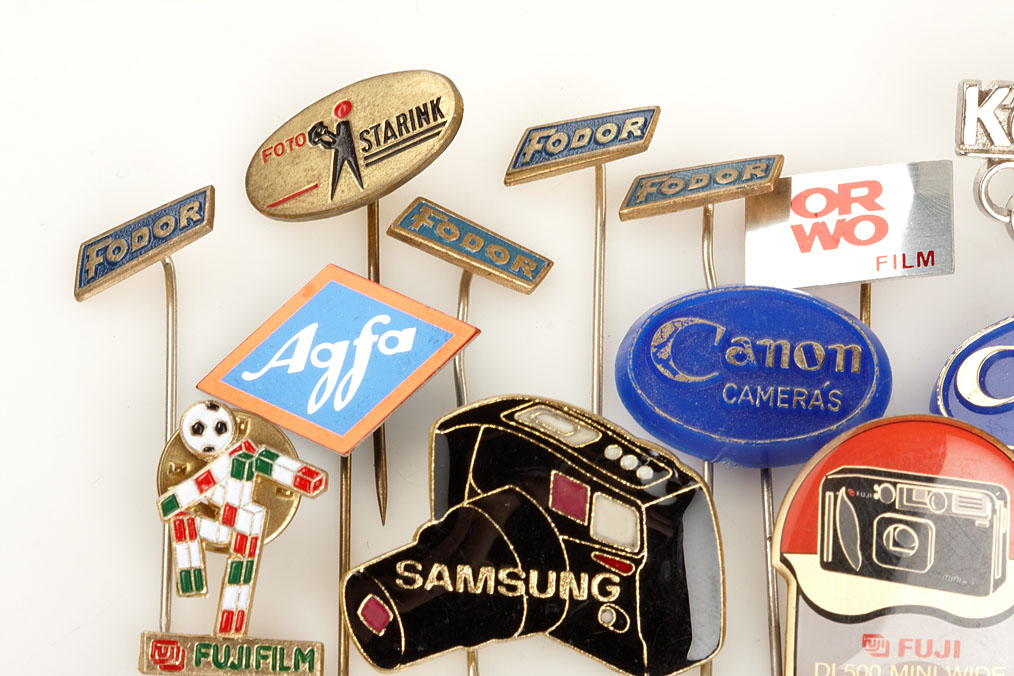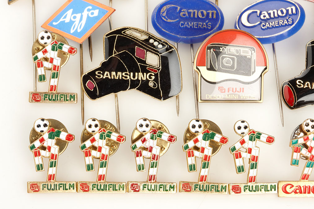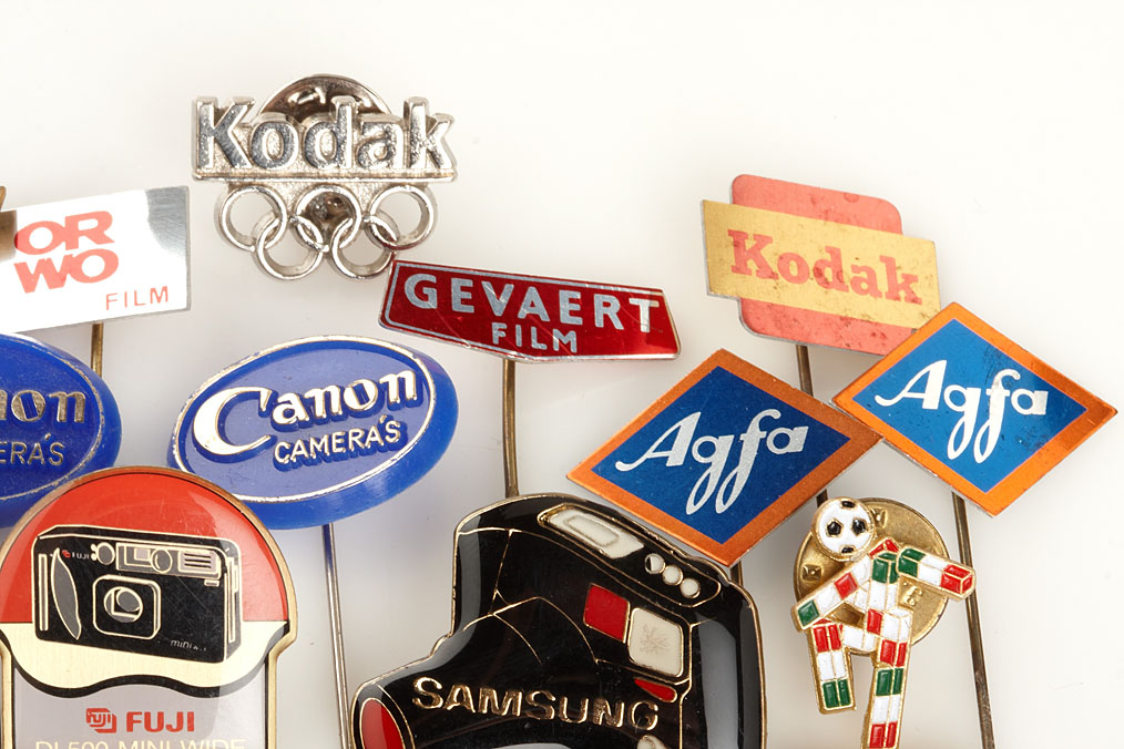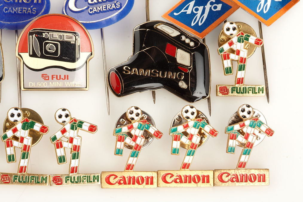collection of 27 pins of various brands (Canon, Orwo Film, Kodak, Agfa, Gevaert, Fodor, Samsung, Fuji etc.) (27)