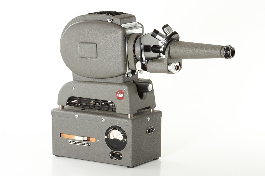 two Leitz projectors in good condition with accessories, (1) Prado 66 with Colorplan 2.5/90mm (with condenser and slider) and Elmaron 2.8/150mm (with slider and cap), papers, in case, (2) Prado 500 no.144736 with voltage regulator, Dimaron 2.8/15cm, Hektor 2.5/12cm, sliders, cables, papers, large micro attachment with 3 lenses in maker's box - a very rare and complete outfit