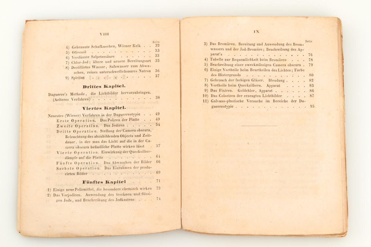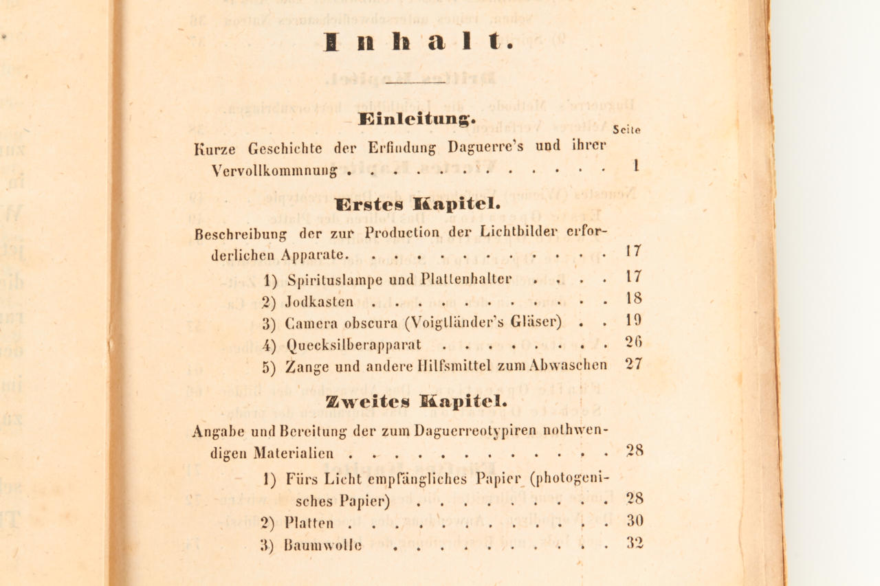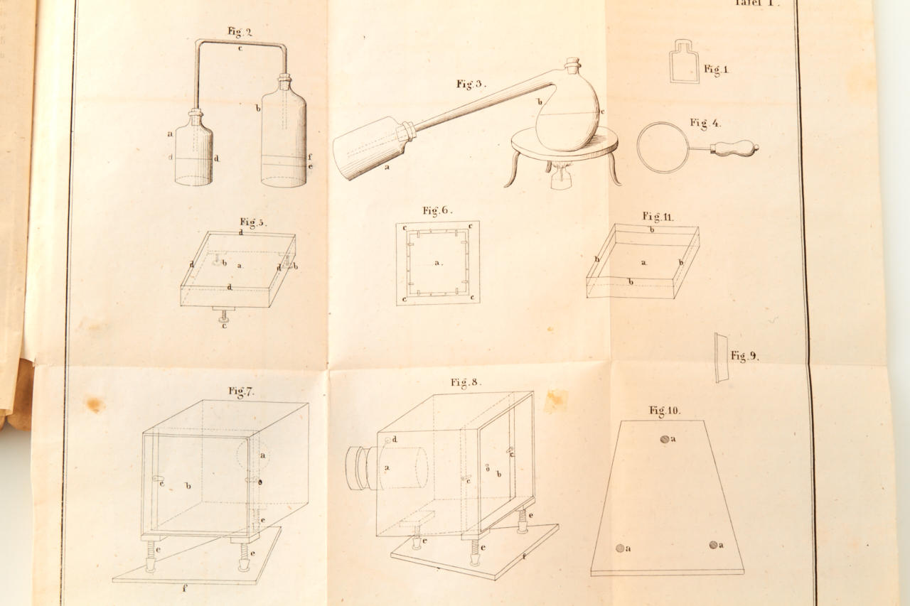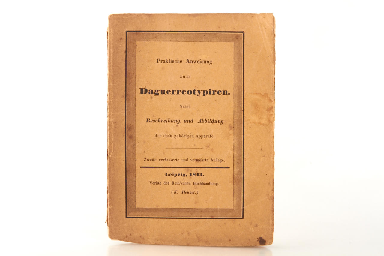 Very early and historically important German instructions for daguerreotyping 'Praktische Anweisung zum Daguerreotypiren Nebst Beschreibung und Abbildung der dazu gehörigen Apparate' - 'Practical instructions for Daguerreotyping with description and pictures of the needed instruments'. Published in Leipzig 1843 by 'Verlag der Rein'schen Buchhandlung'. Second, extended edition in good original condition (only few pages loose, spine torn). c.11x15cm, 100 pages with soft cover incl. 21x25cm inlet with drawings of sliding-box daguerreotype camera and processing instruments.
