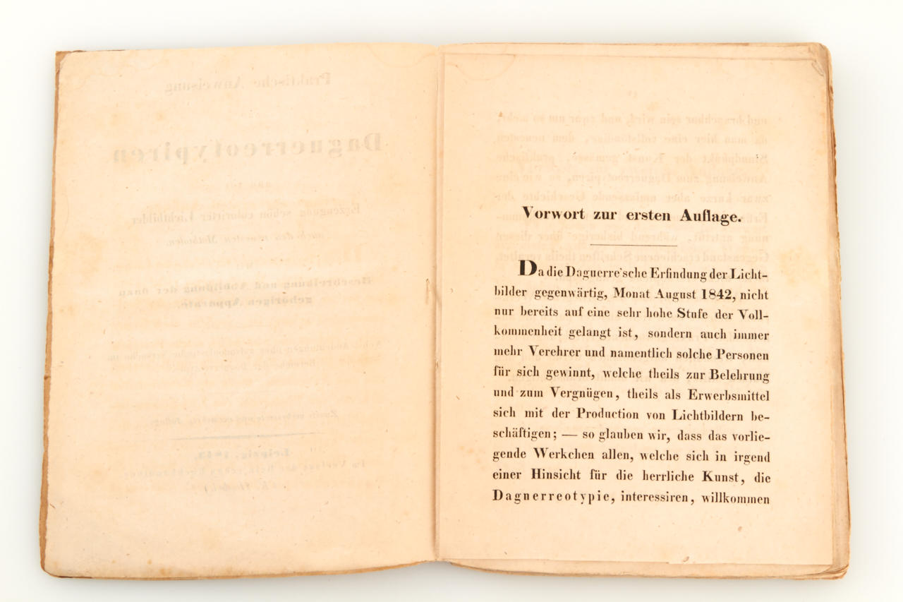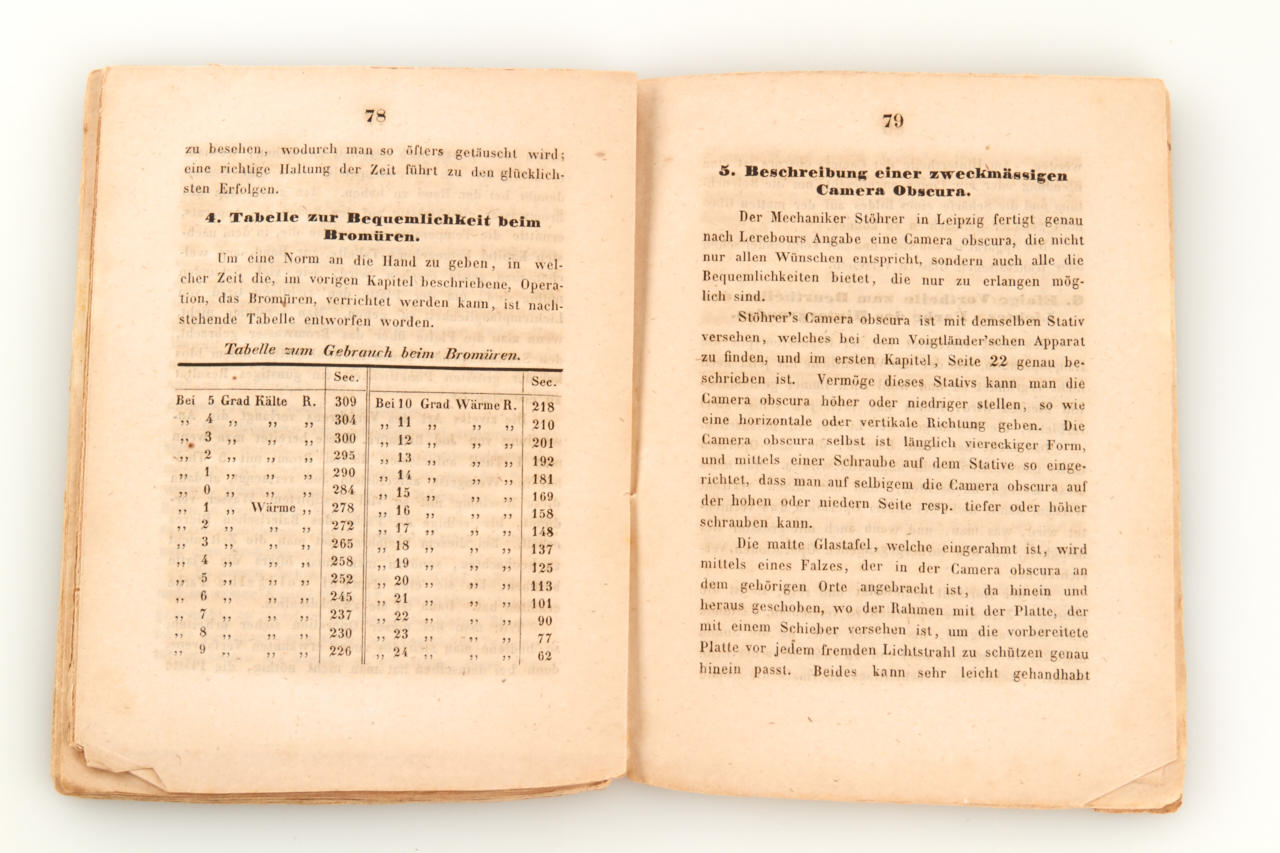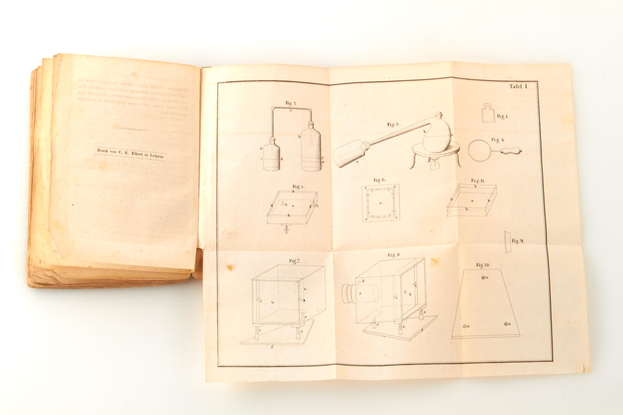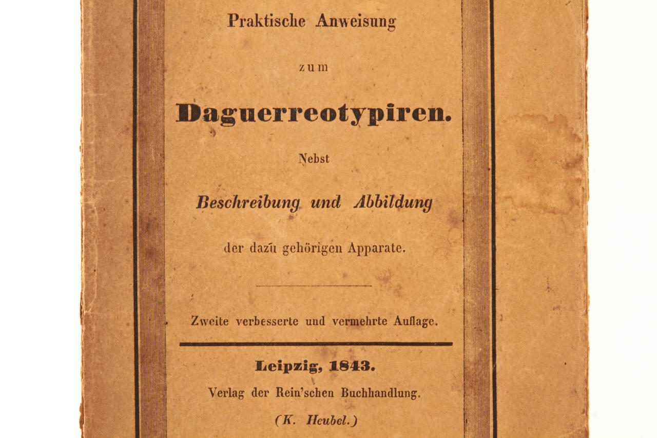 Very early and historically important German instructions for daguerreotyping 'Praktische Anweisung zum Daguerreotypiren Nebst Beschreibung und Abbildung der dazu gehörigen Apparate' - 'Practical instructions for Daguerreotyping with description and pictures of the needed instruments'. Published in Leipzig 1843 by 'Verlag der Rein'schen Buchhandlung'. Second, extended edition in good original condition (only few pages loose, spine torn). c.11x15cm, 100 pages with soft cover incl. 21x25cm inlet with drawings of sliding-box daguerreotype camera and processing instruments.
