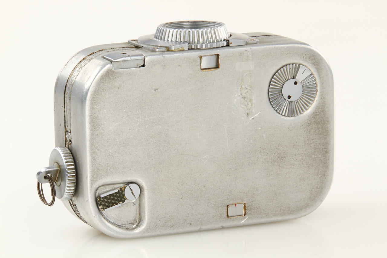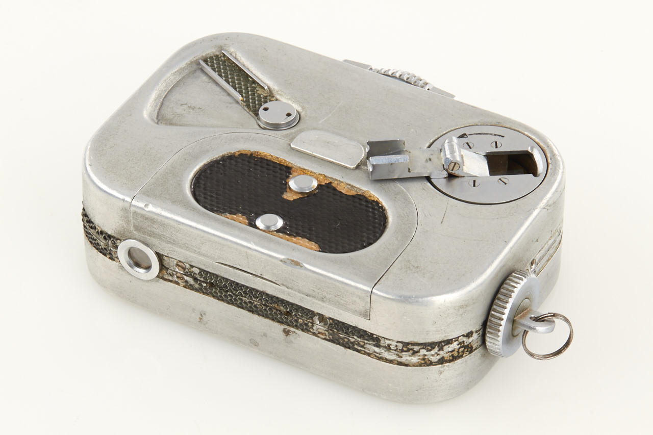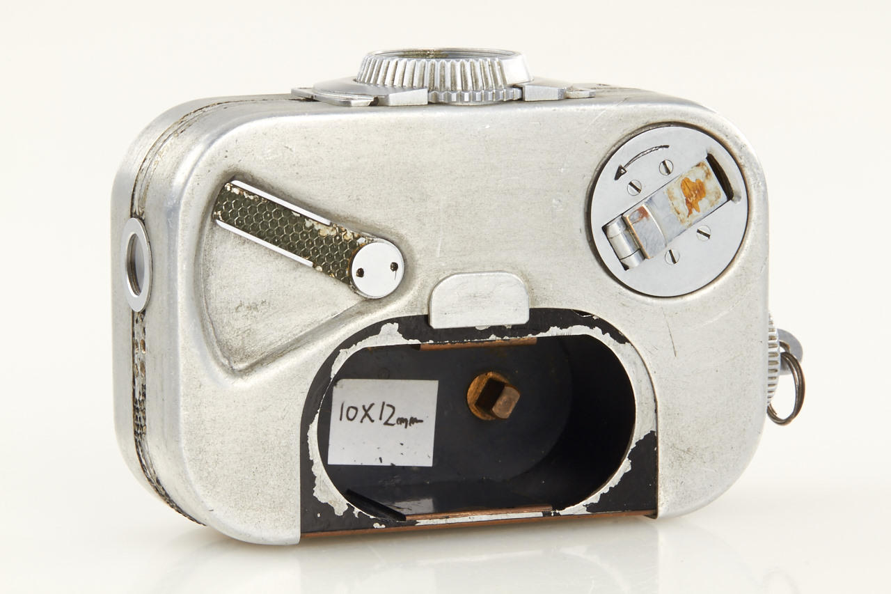 probably unique prototype of a spring-driven miniature camera for 10x12mm exposures on 16mm film in special cartridges, unmarked lens, aluminium housing