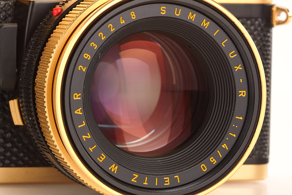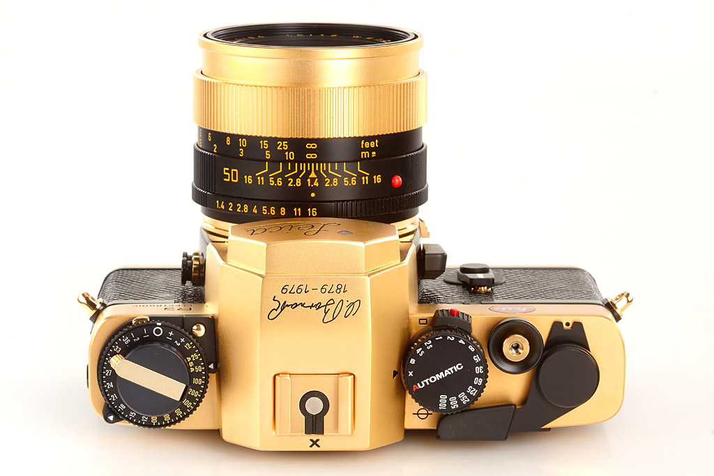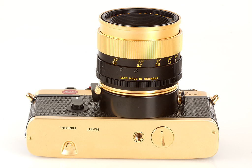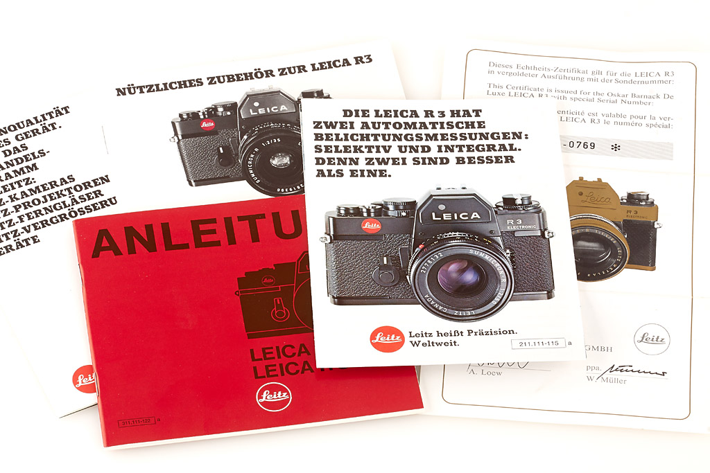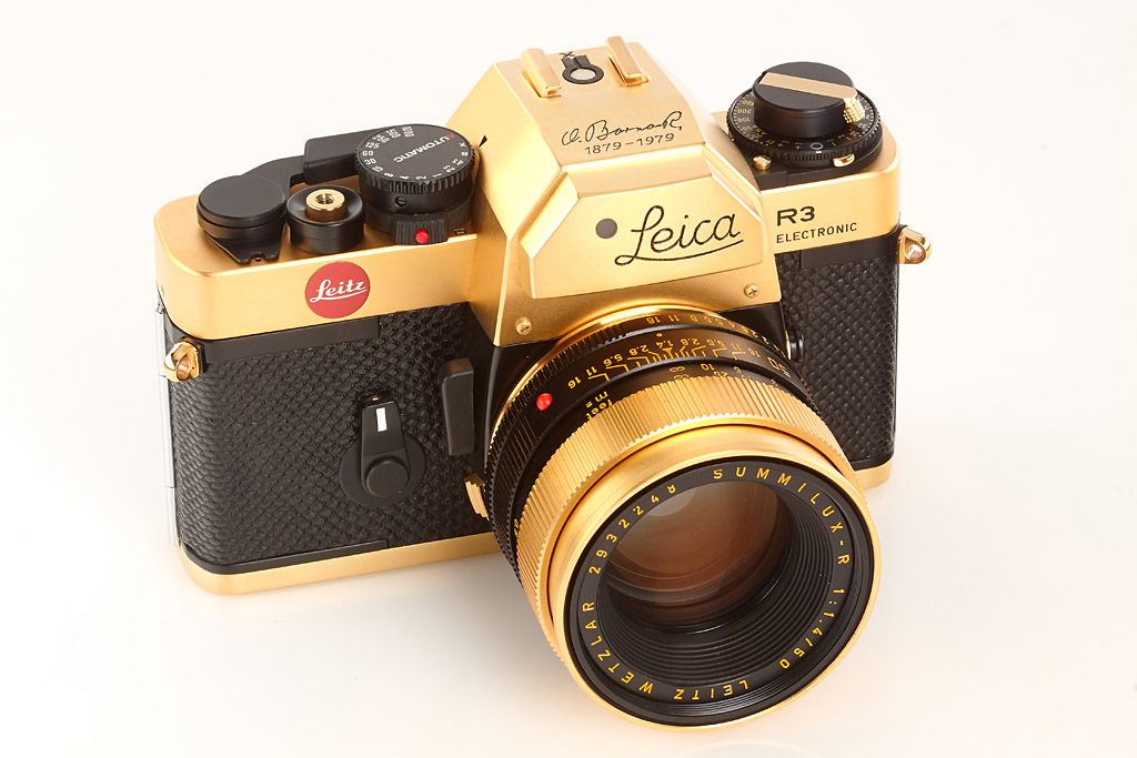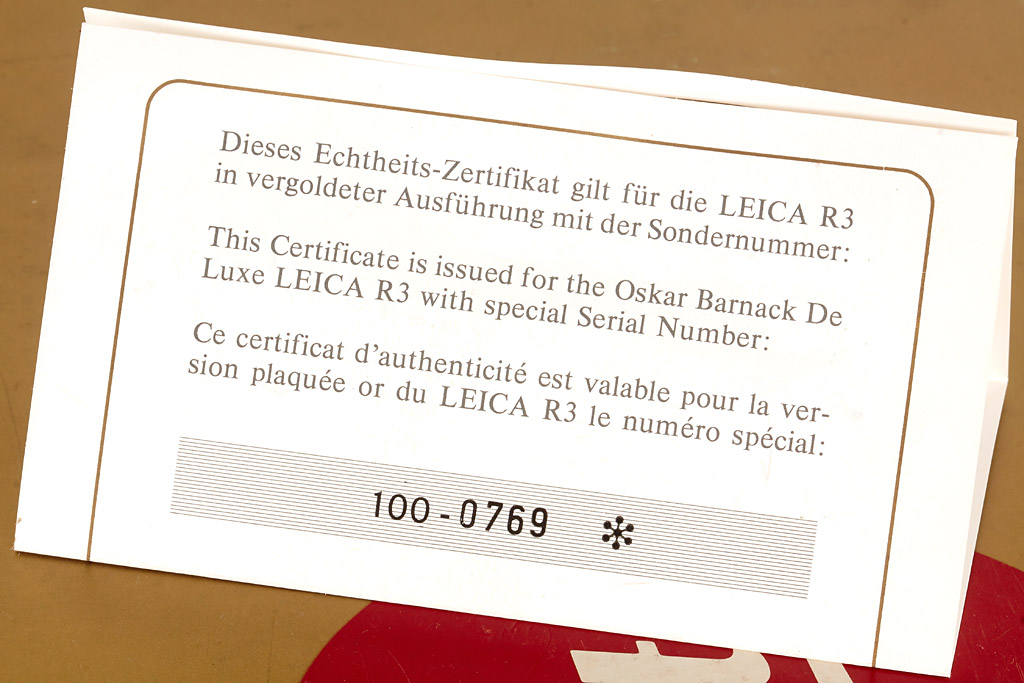 24 carat gold-plated R3 for the 100th anniversary of Oskar Barnack (special number 100-769), gold plated Summilux-R 1.4/50mm no.2932248, caps, papers, wooden box and original maker's box, in new condition