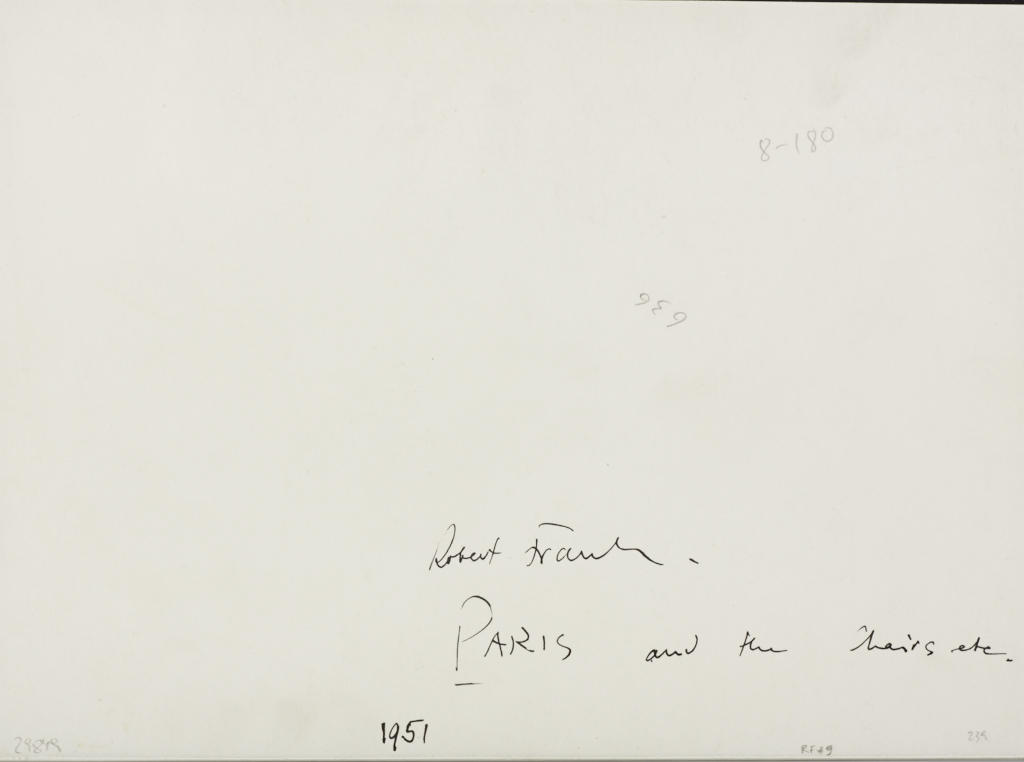 Vintage silver print 13 x 25,2 cm (5.1 x 9.9 in) Signed, titled and dated (print date “1951”) by the photographer in ink on the reverse PROVENANCE Sotheby's New York, Lot 41, 15.10.2008 Houk Friedman Gallery, New York LITERATURE Tom Maloney (ed. ) U. S. Camera Annual 1951 (New York, 1950), p. 142; Speaking of Pictures: A Photographer in Paris Finds Chairs Everywhere, Life, 21 May 1951, pp. 26-28; Robert Frank, Black White and Things, Washington 1994, p. 20; Robert Frank, Paris, Göttingen 2008, unpaginated (variant cropping); Sarah Greenough (ed.), Looking in. Robert Frank's The Americans, Göttingen 2009, p. 101.
