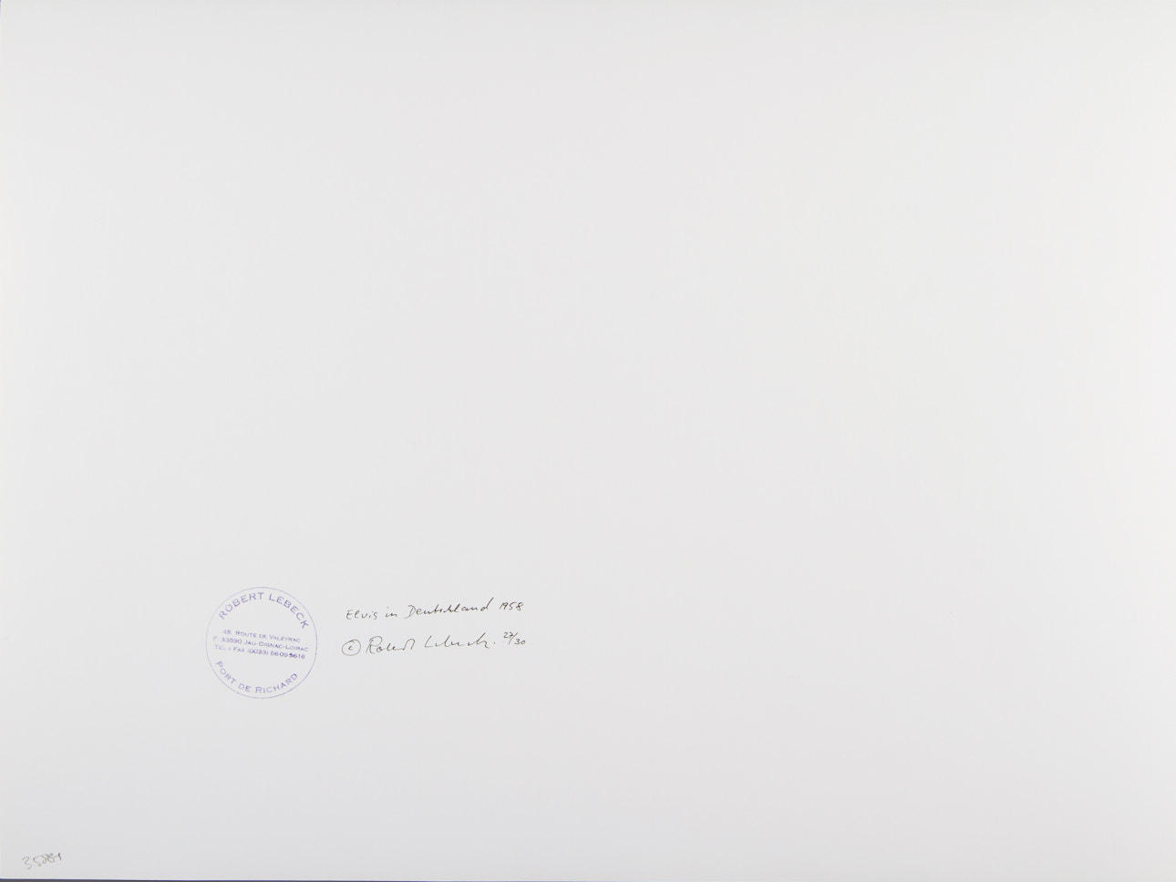 Gelatin silver print, printed in the 1990s 25,8 x 38,4 cm Signed, annotated and numbered by the photographer in ink on the reverse, edition no. 27/30 Elvis Presley als er in Friedberg in Hessen als Soldat stationiert war / Elvis Presley as a soldier, when he was based in Friedberg in Hessen LITERATURE Augenzeuge. Robert Lebeck, Munich 1984, p. 32.