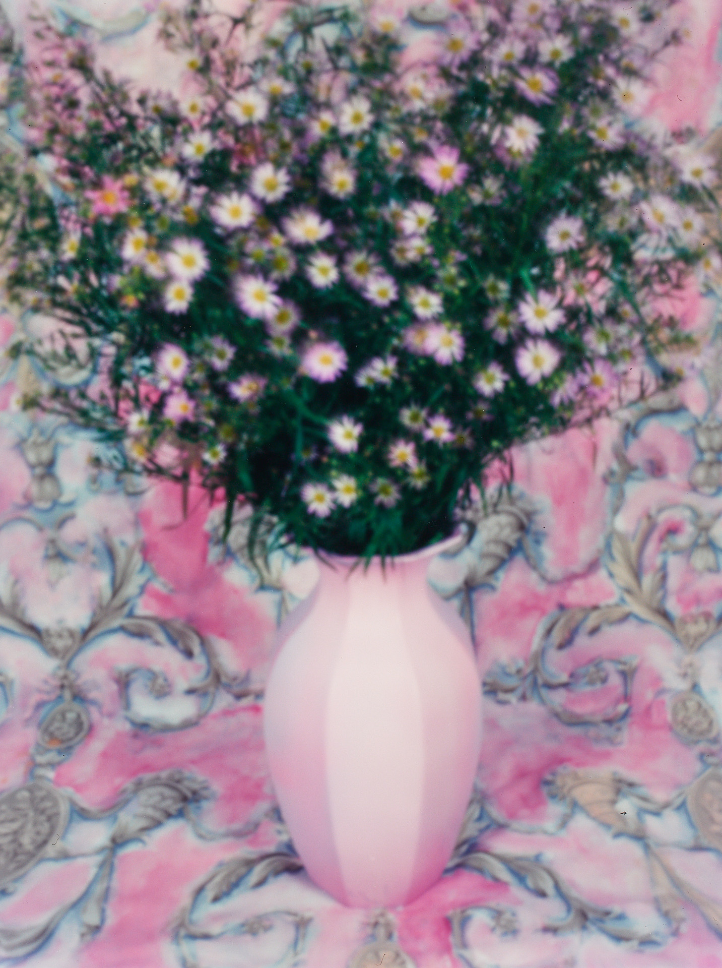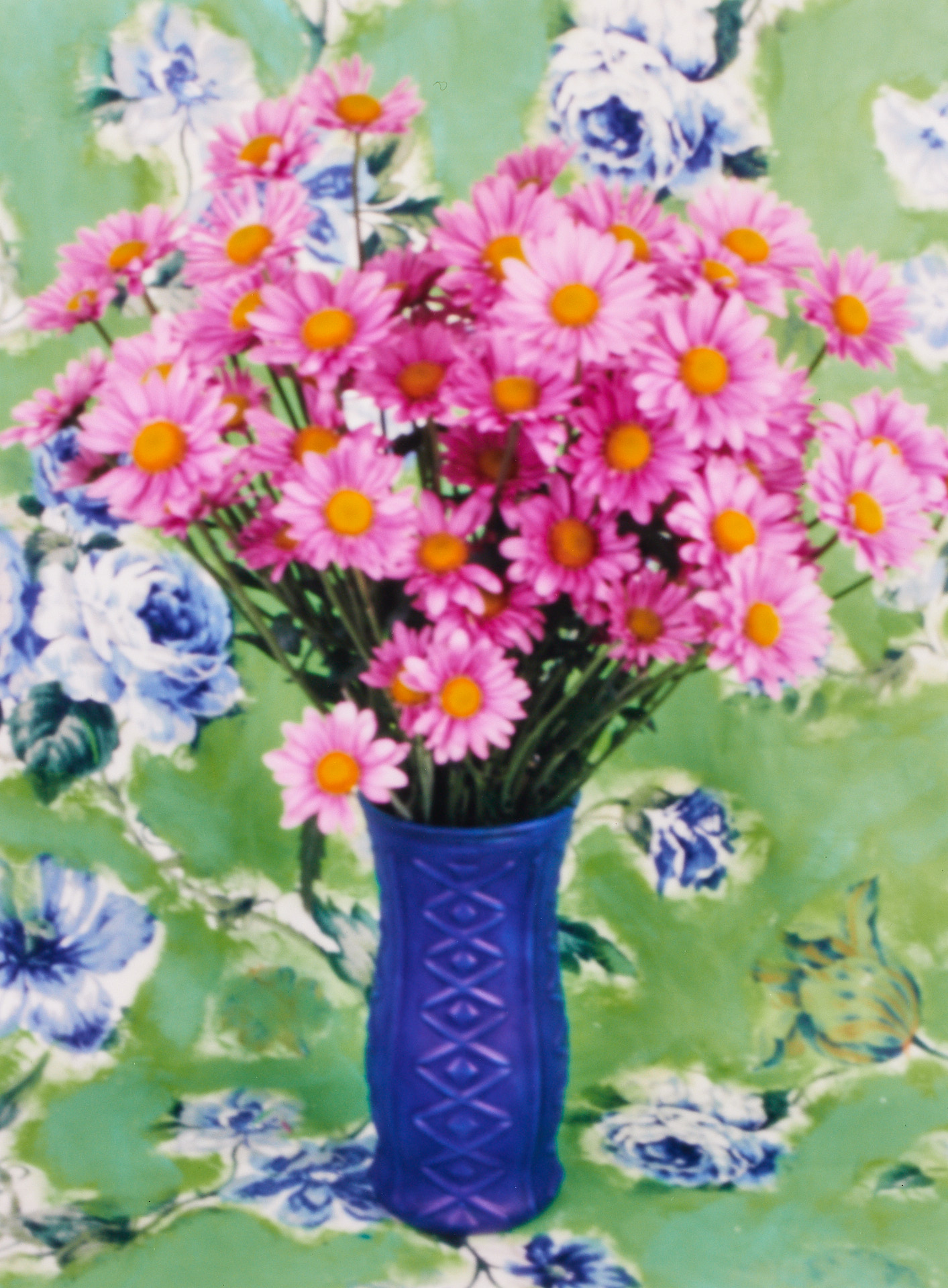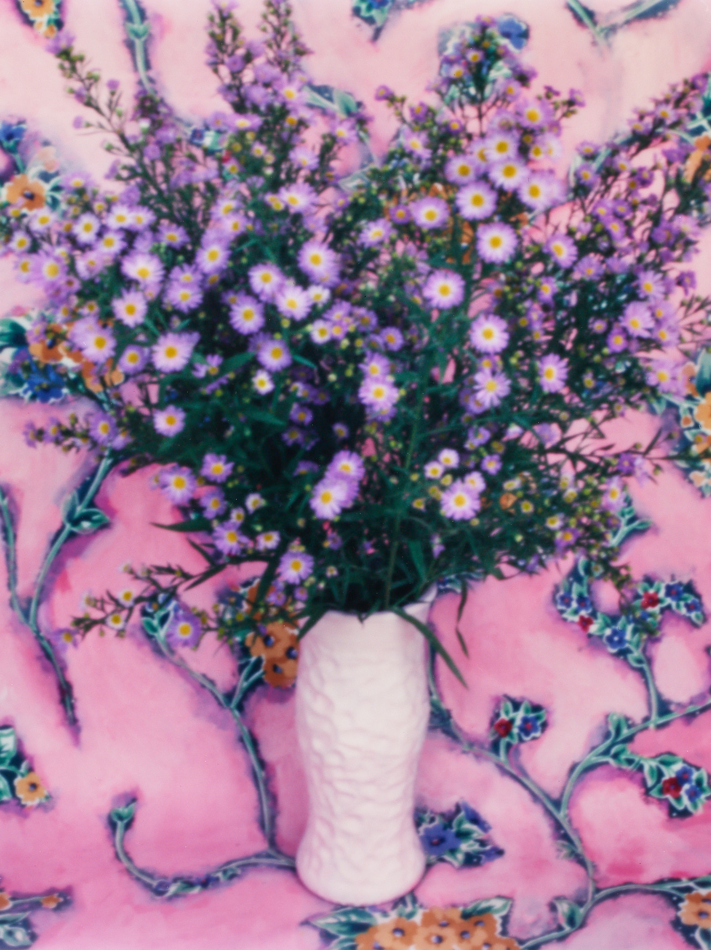 “The flowers are from a series I made slowly from 1995-1997. I had just finished college and had a 4 X 5 camera body with no lens. I also had no money, so I made a pinhole lens. The backgrounds are modified textiles, cheap fabric the patterns of which I ‘edited’ with acrylic paint. I bought the vases at a thrift store, painted them, and then would go to the farmers market and buy the cheapest flowers. I was really into the Becher school and anything ‘German photography’ at the time, but I was also into Matisse. I think I was trying to make a Matisse.” (Roe Ethridge, Interview in Artit Magazine, 2009)