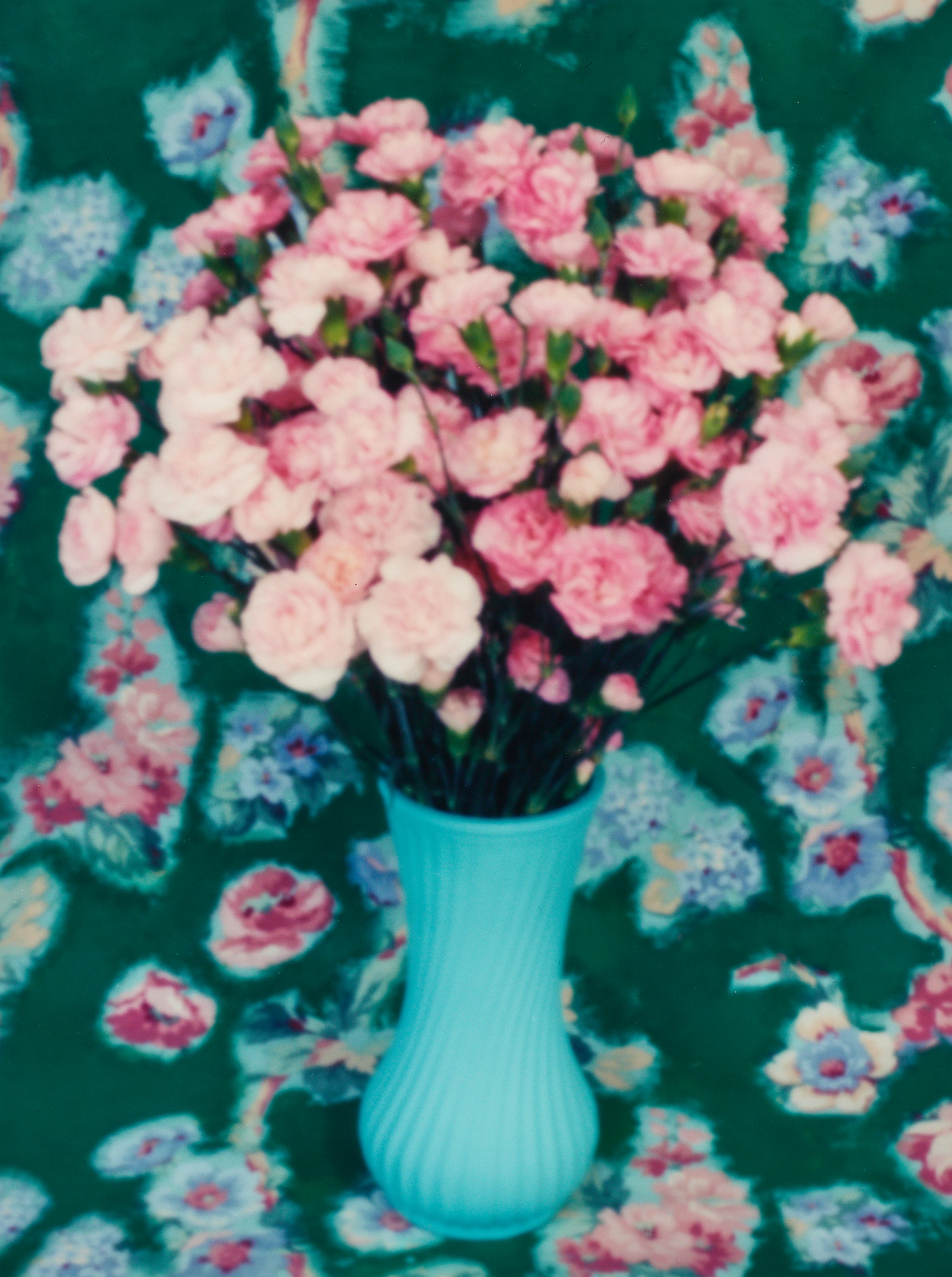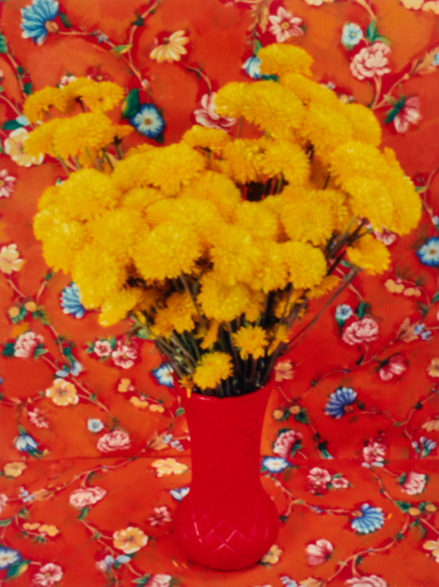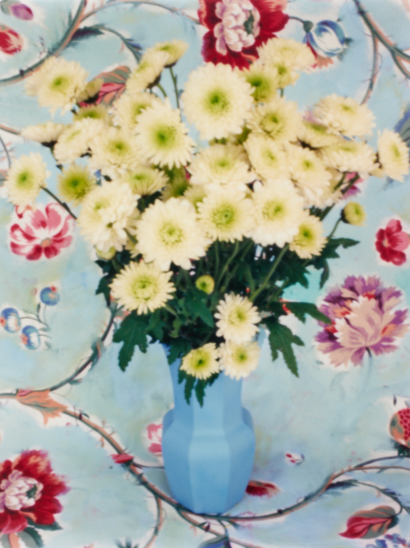 “The flowers are from a series I made slowly from 1995-1997. I had just finished college and had a 4 X 5 camera body with no lens. I also had no money, so I made a pinhole lens. The backgrounds are modified textiles, cheap fabric the patterns of which I ‘edited’ with acrylic paint. I bought the vases at a thrift store, painted them, and then would go to the farmers market and buy the cheapest flowers. I was really into the Becher school and anything ‘German photography’ at the time, but I was also into Matisse. I think I was trying to make a Matisse.” (Roe Ethridge, Interview in Artit Magazine, 2009)