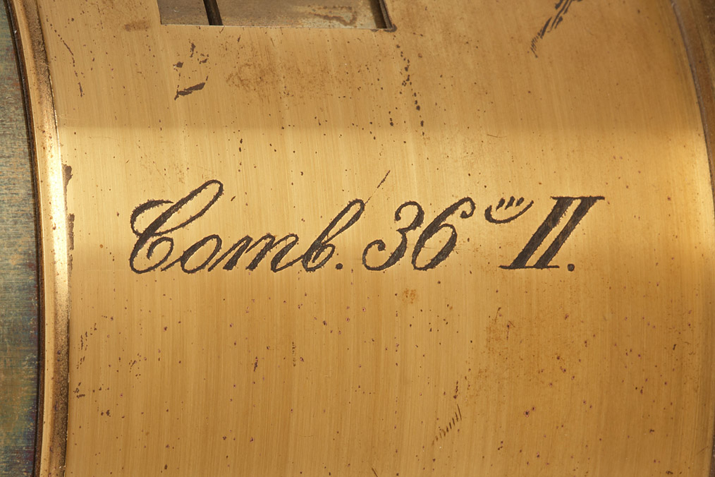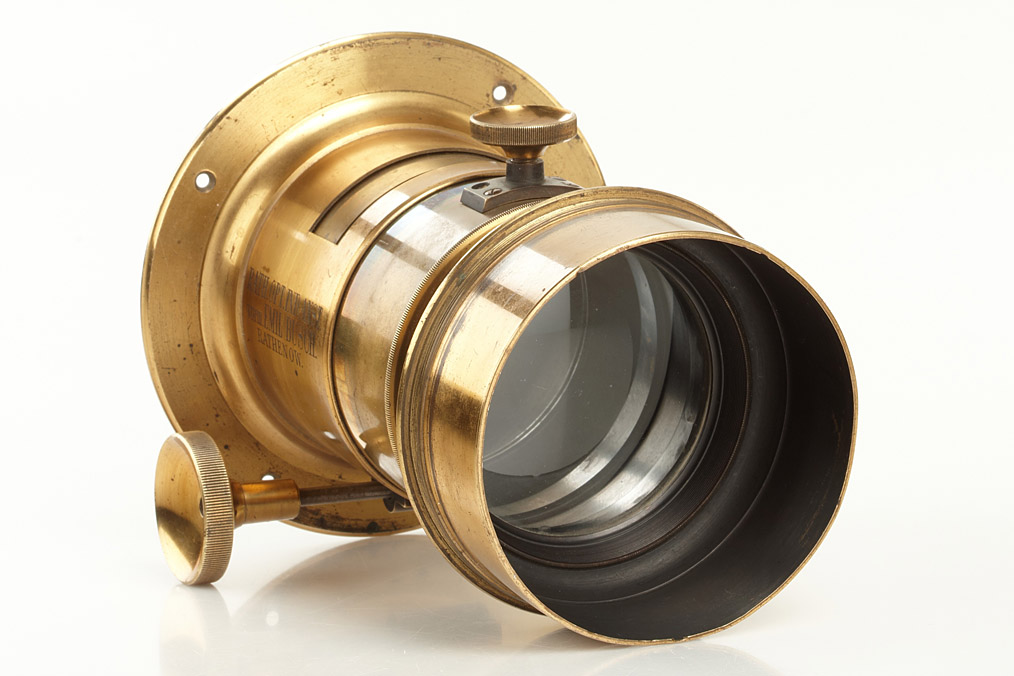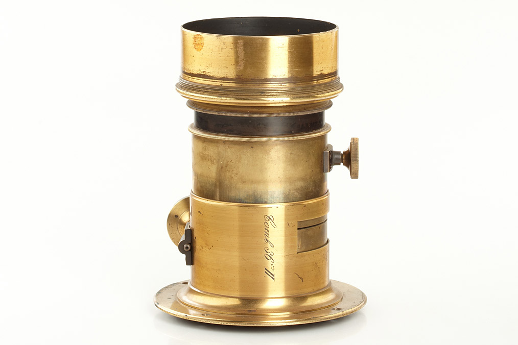 fine brass lens with waterhouse stops, approx. 36cm focal length, rack and pinion focusing, mounting ring