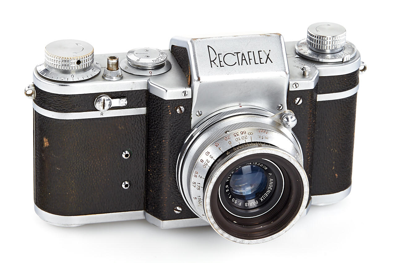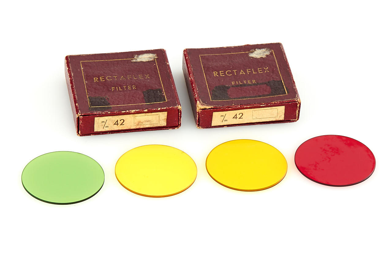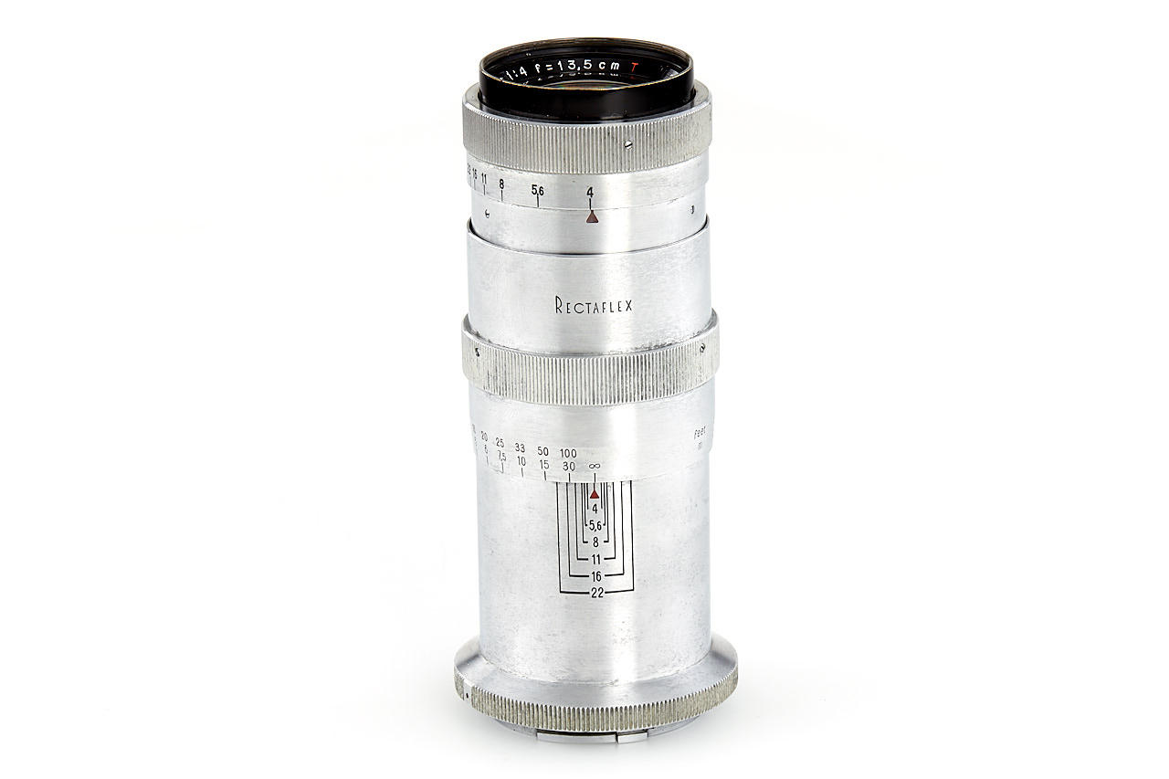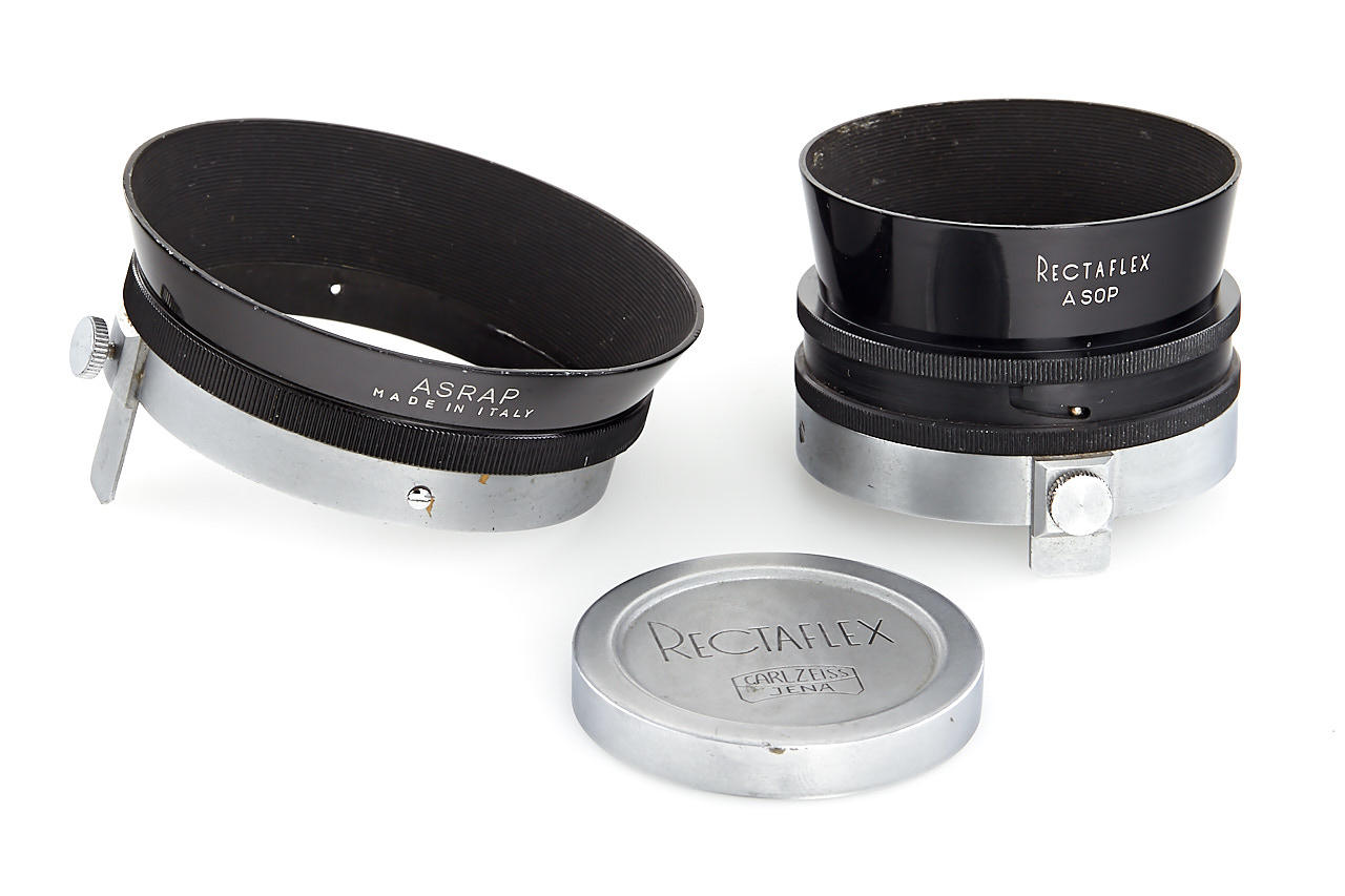 body in fine condition and in working order, with Angenieux Type Z2 2.9/50mm no.152208 (cond. B, slight cleaning marks), very rare Triotar T 4/13.5cm no.3319132 (engraved on the barrel 'Rectaflex', with original front cap engraved with Zeiss and Rectaflex logo, good condition), four filters in worn boxes, ASOP hood, ASRAP hood, leather case