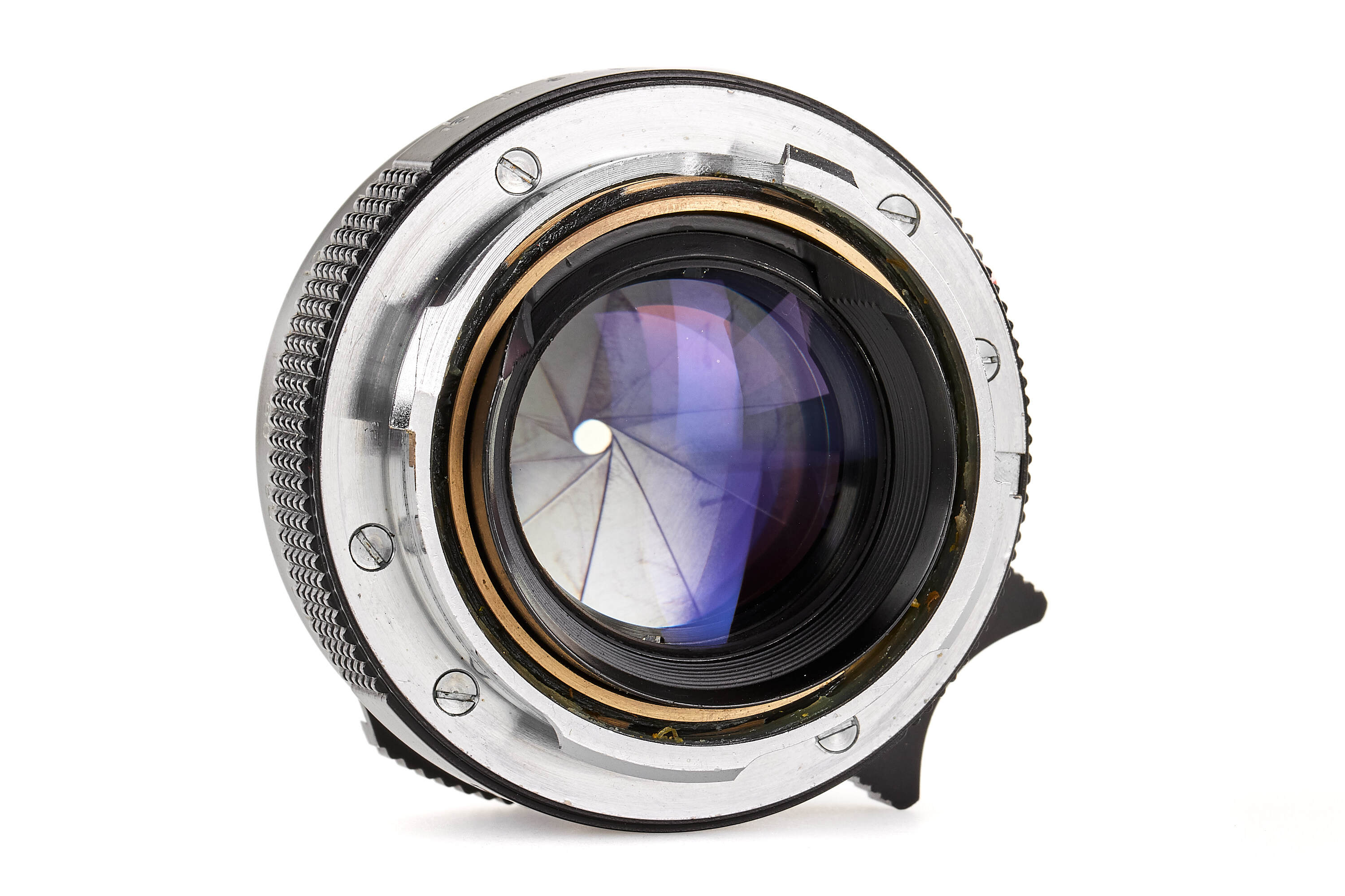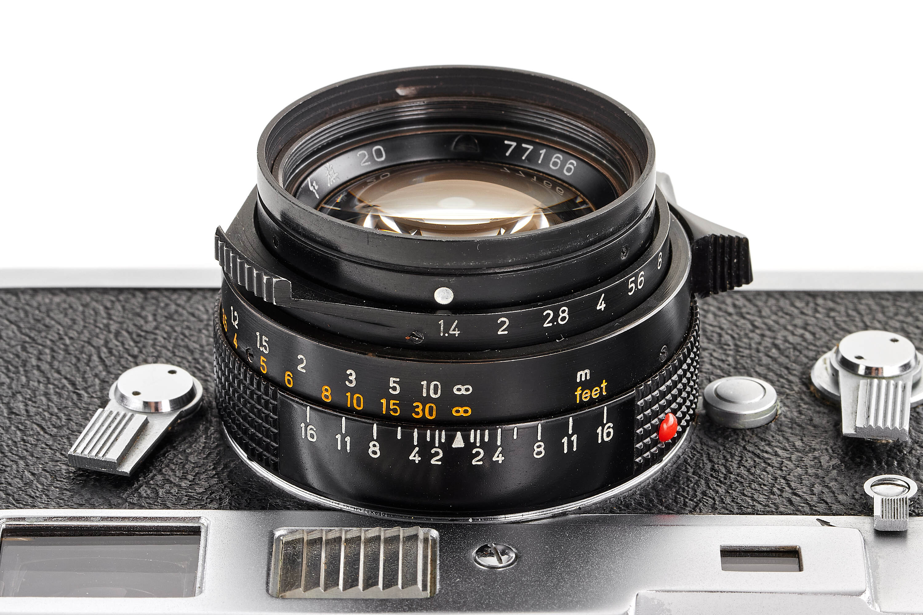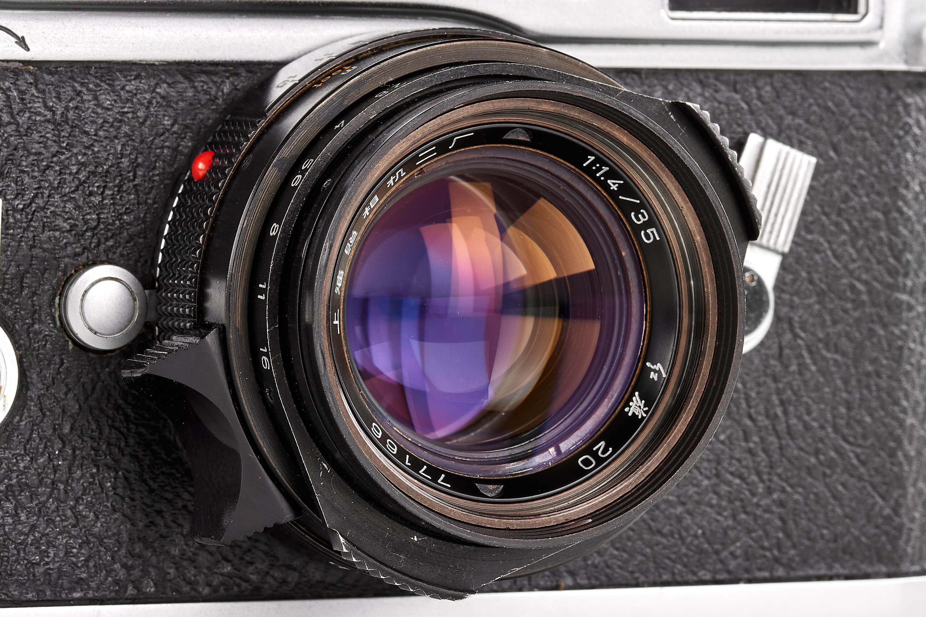 The example offered here is one of the most complete and best-preserved outfits known to exist. It includes the camera body number 770191 with a 50mm f/1.4 lens no. 77066, an exact copy of the Leitz black paint Summilux, complete with hood and front cap; 35mm f/1.4 lens no. 77166, closely modelled after the Summilux, with hood and original lens keeper; and 90mm f/2 lens no. 760045, a faithful copy of the Summicron, with front cap and lens keeper. All components are in excellent condition and in perfect working order, with the lenses displaying exceptionally clean glass.
