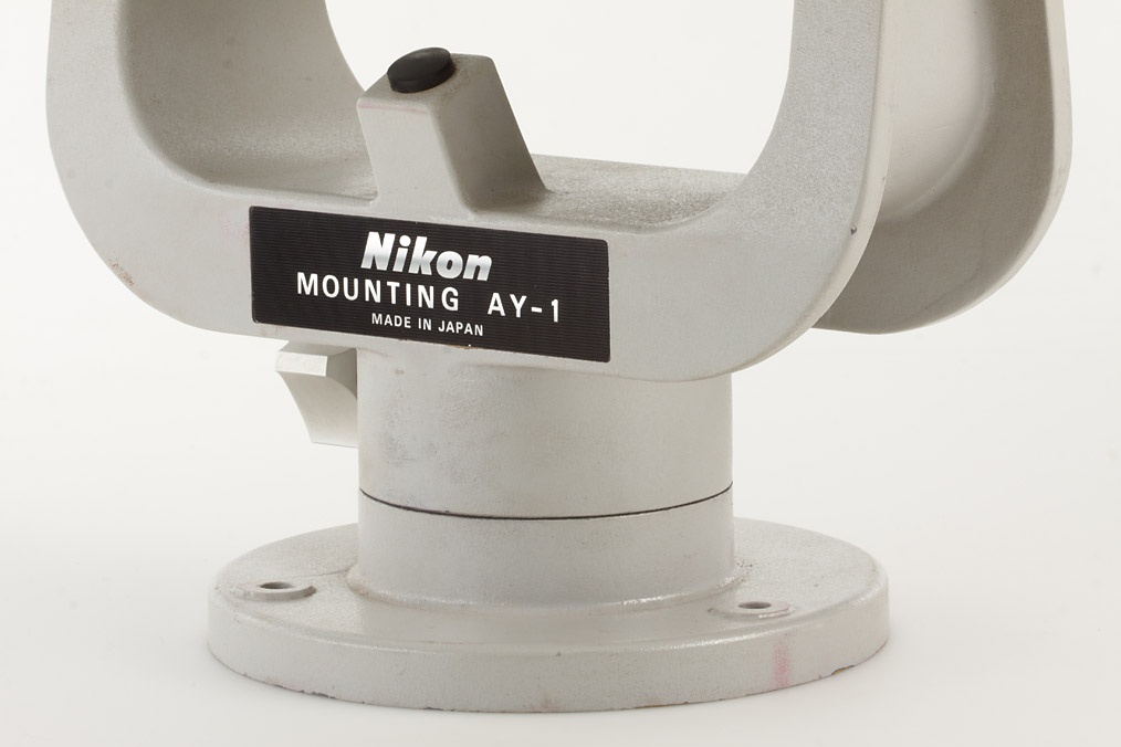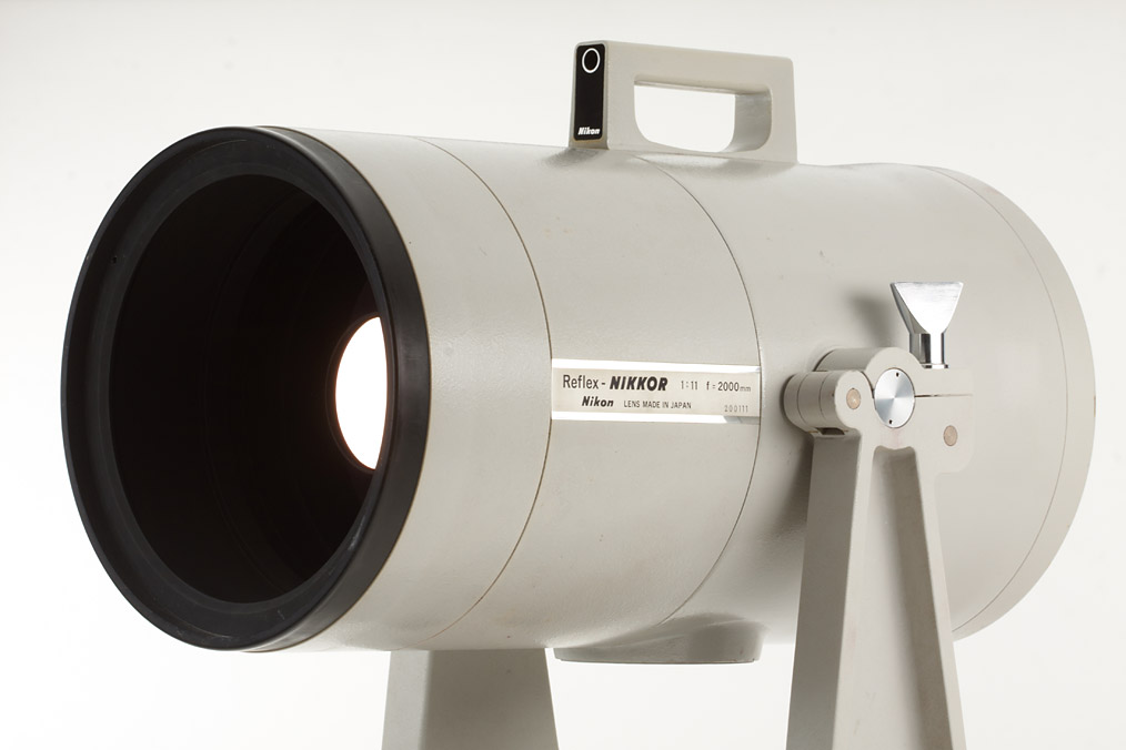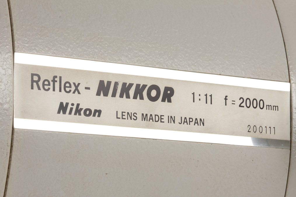 the very first produced Reflex-Nikkor of this very rare 2000mm lens, the largest ever built Nikkor for 35mm, built-in L37c filters, in very fine condition with both original caps and AV-1 tripod mounting unit, this lens (total weight 25kg) was shown at Photokina 1970 by Nikon for the first time, wooden carrying case for tripod mount and metal carrying case for lens