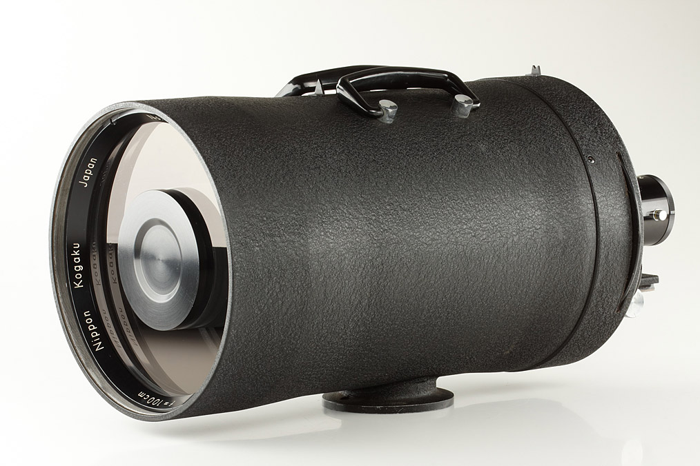 extremely rare 100cm mirror lens with original Nikon rangefinder mount (only approx.10 lenses are known to exist), black version in top condition with hood, N-F adapter, matching grey metal case (lens no.100635 is illustrated in Rototloni 'The Complete Nikon Rangefinder System' p.394)