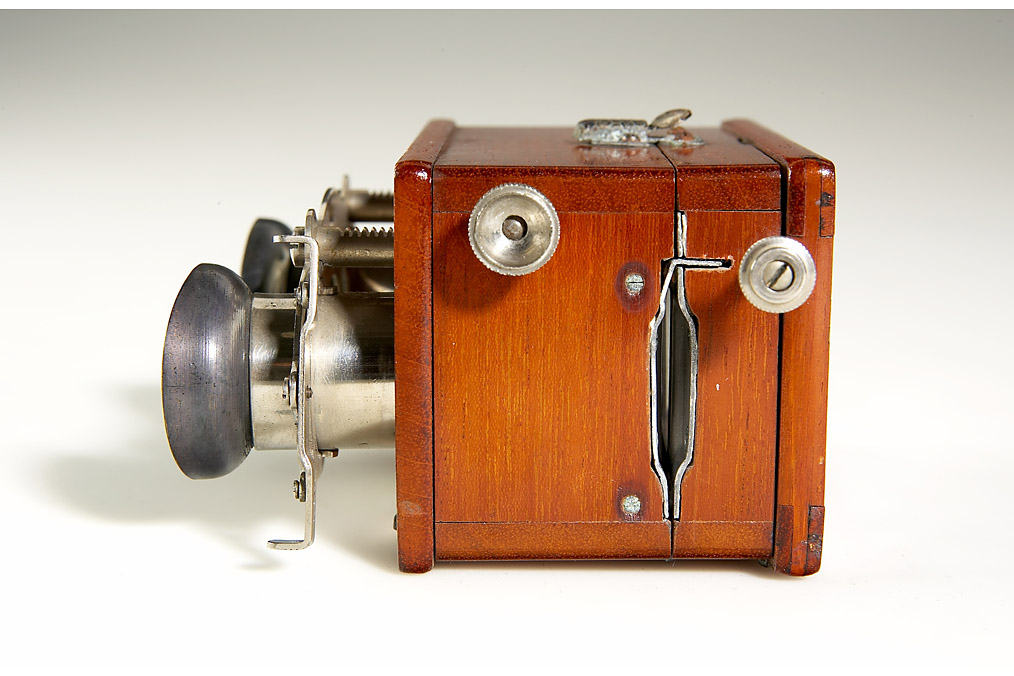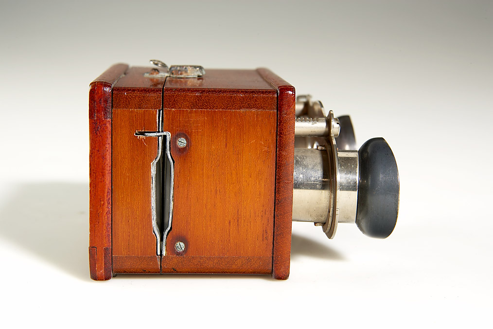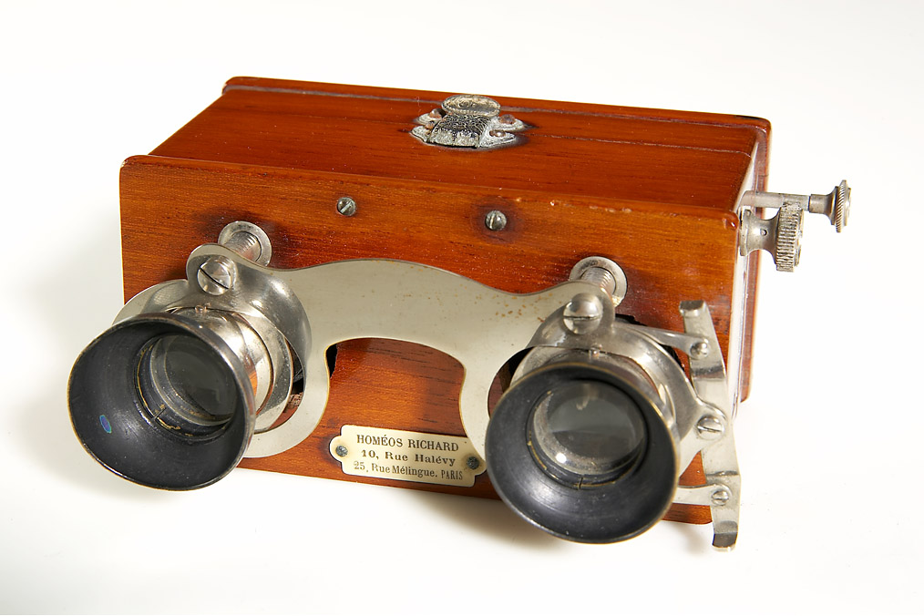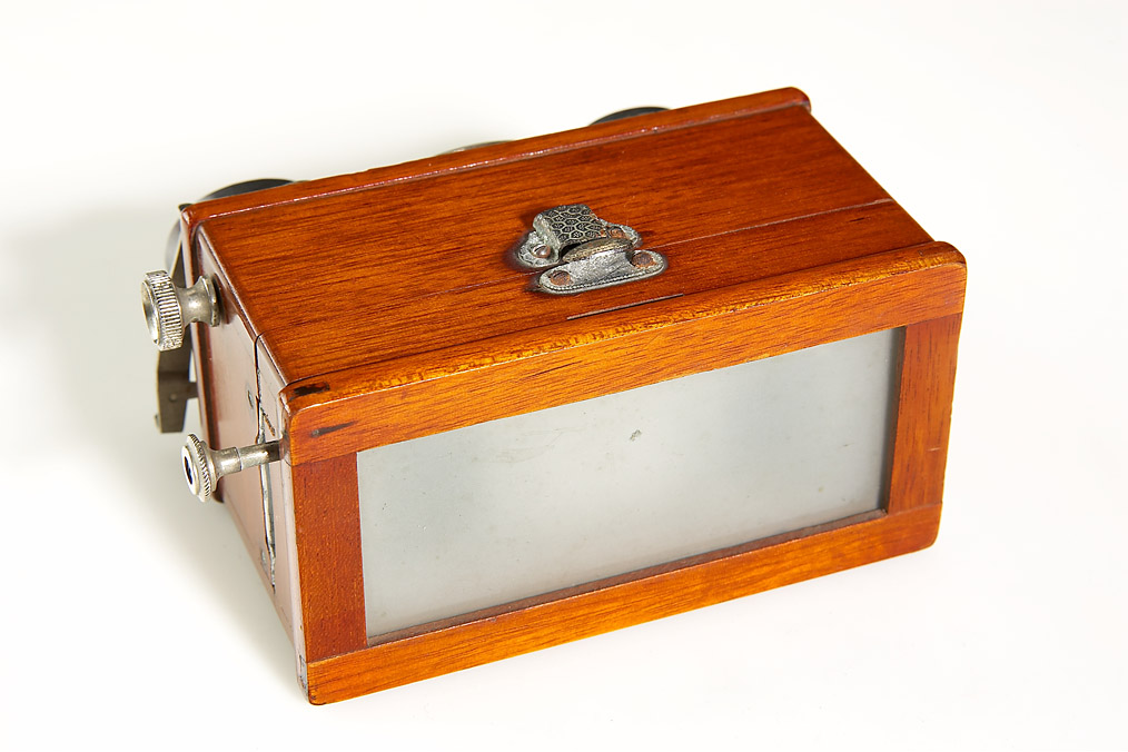 rare French viewer for half-frame stereo images on uncut and perforated 35mm standard film (it is the viewer for Homeos camera, an important Leica forerunner which was the first camera to use perforated cine film), box-shaped wooden body, all metal parts chrome-plated, rack and pinion focus and adjustable eye base, the film is transported with a movie camera like movement, in good original condition, comes with its original cardboard box.