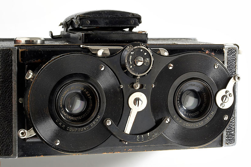 45x107mm, rare Kosmo-Clack stereo outfit with 6.8/65mm Sextar lenses, original stereo-viewer conversion kit, Rietzschel packfilm holder