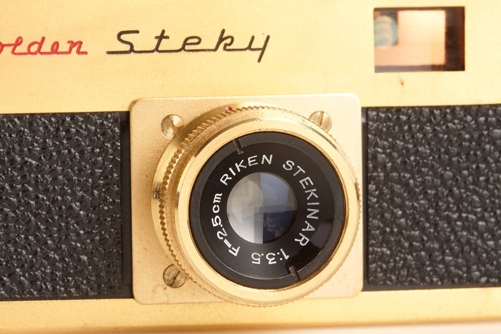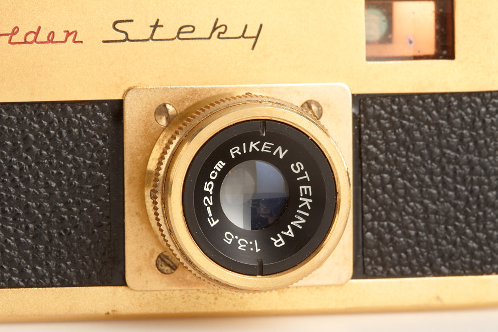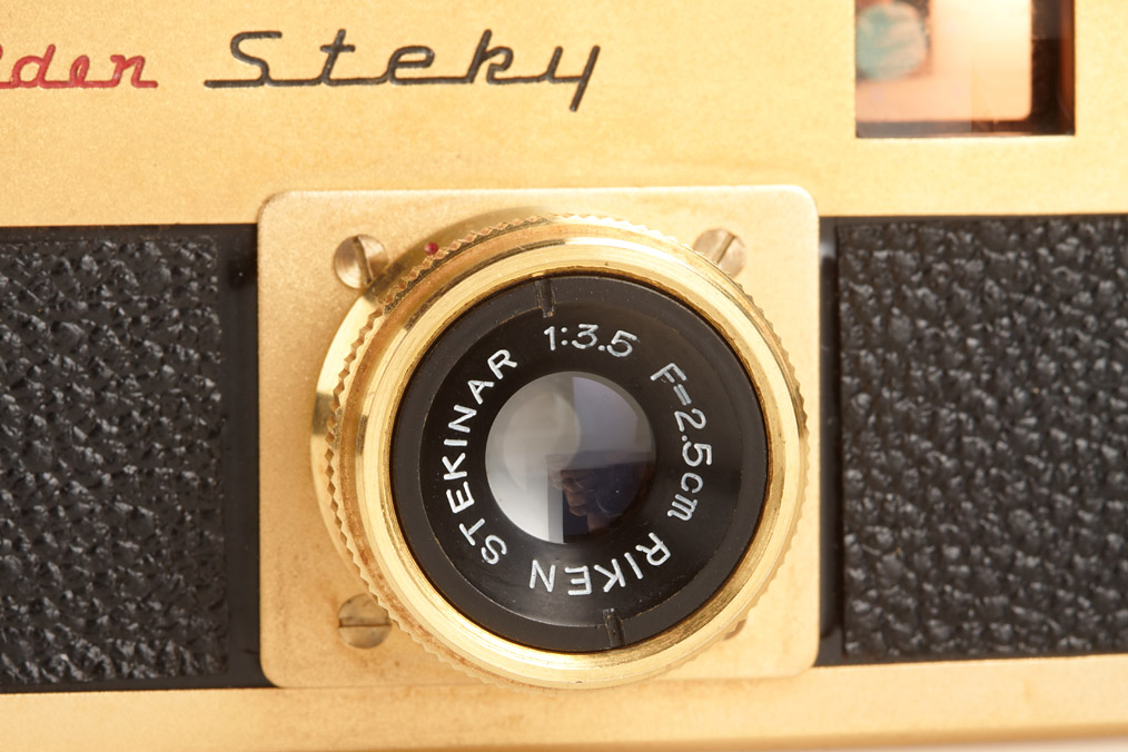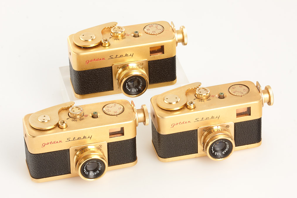 three Golden Steky with Stekinar 3.5/25mm, two caps, one yellow filter, three cases, one maker's box (3)