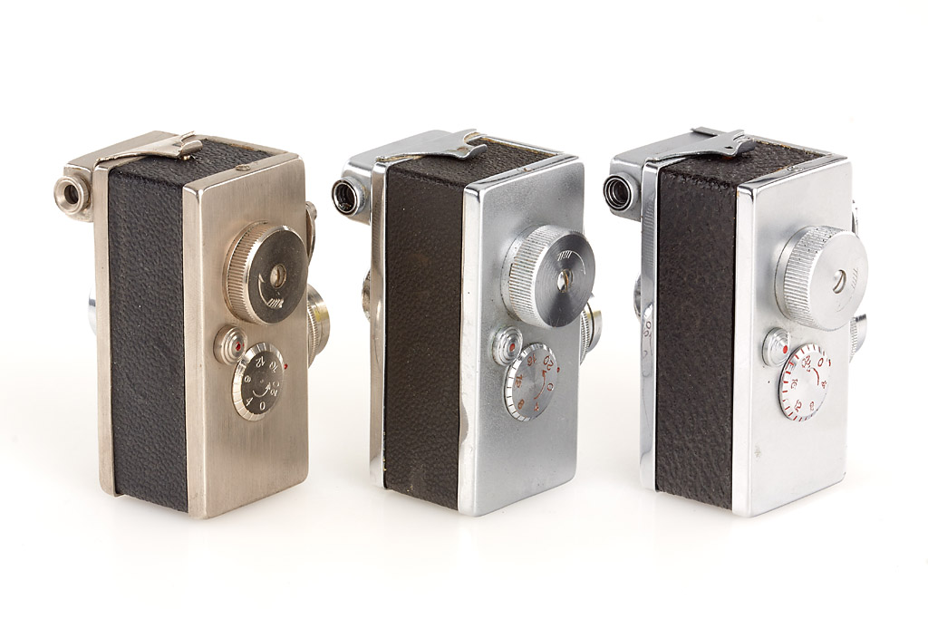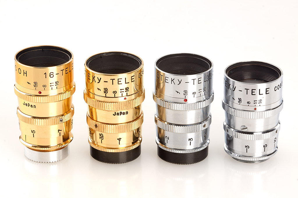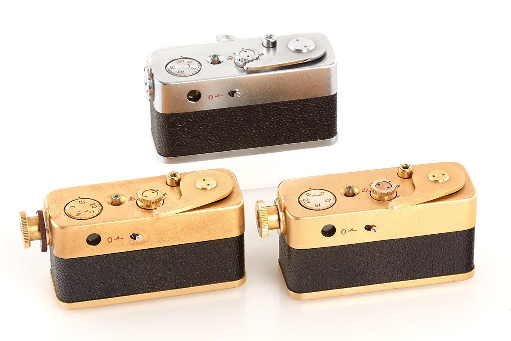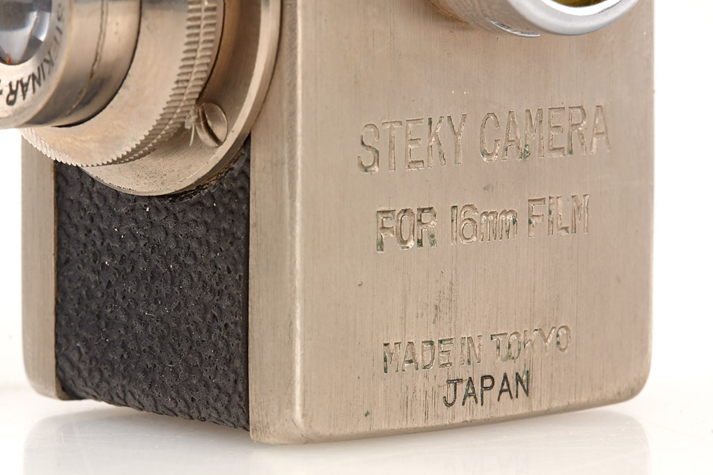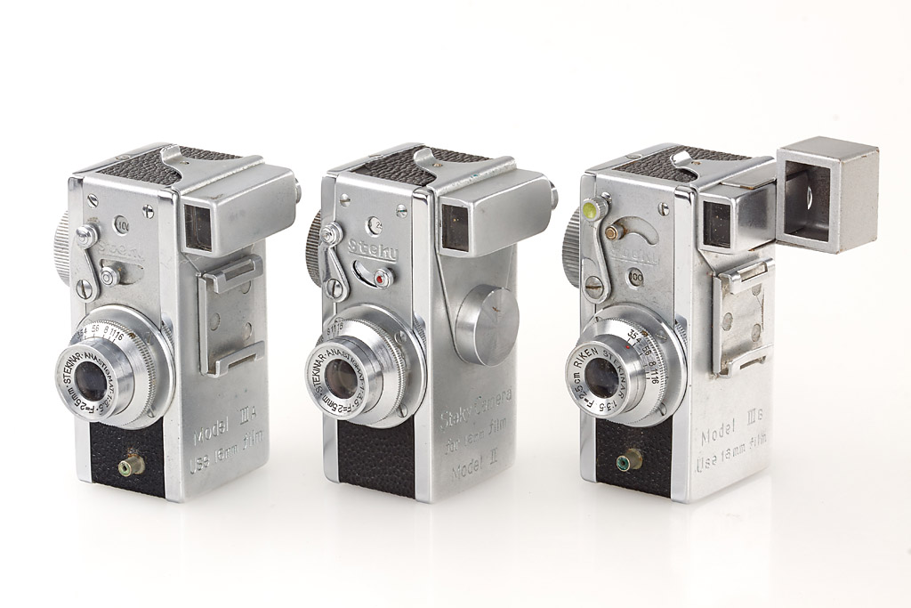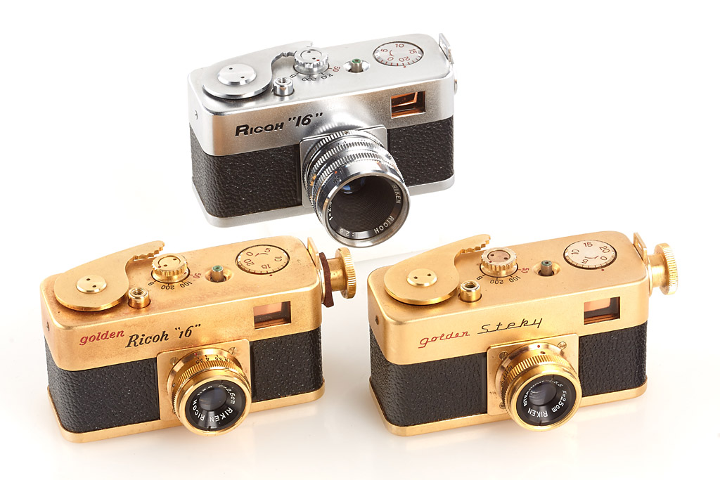 extensive and almost complete collection of 9 cameras, lenses and accessories, (1) rare nickel Steky with 'MADE IN TOKYO JAPAN' engraving (cap, case), (2) Steky II engraved 'Mod. II' (cap, yellow filter, case), (3) Steky II engraved 'Model II' (yellow filter, case), (4) Steky III in outfit case (with case, Stekaton wide-angle converter, Steky-Tele 5.6/40mm, finder, spools and hood), (5) Steky IIIA (cap, case, papers, blue velvet maker's box), (6) Steky IIIB (case, finder, wooden maker's box, Steky-Tele 5.6/40mm and Stekaton wide-angle converter in wooden maker's box), (7) Golden Steky with Stekinar 3.5/2.5cm (yellow filter, case) and golden Steky-Tele 5.6/40mm (case), (8) chrome Ricoh "16" with Ricoh 2.8/2.5cm (cap, case), (9) Golden Ricoh "16" with Ricoh 3.5/2.5cm (cap, yellow filter, case, papers, maker's box and golden Ricoh 16-Tele 5.6/40mm with case) (9)