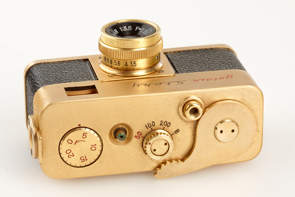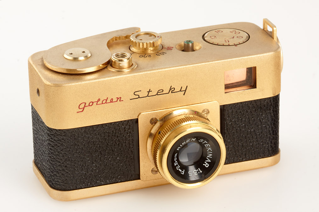 (1) Steky Model III with Stekinar 3.5/25mm, cap, yellow filter, case, (2) Steky Model IIIB with Stekinar 3.5/25mm, cap, strap, case, film, instructions, maker's box, chrome Steky-Tele 5.6/40mm with cap, case, maker's box, (3) Golden Steky with Stekinar 3.5/25mm, cap, yellow filter, case, papers, maker's box, golden Steky-Tele 5.6/40mm with cap, case, maker's box (cond. B) (3)