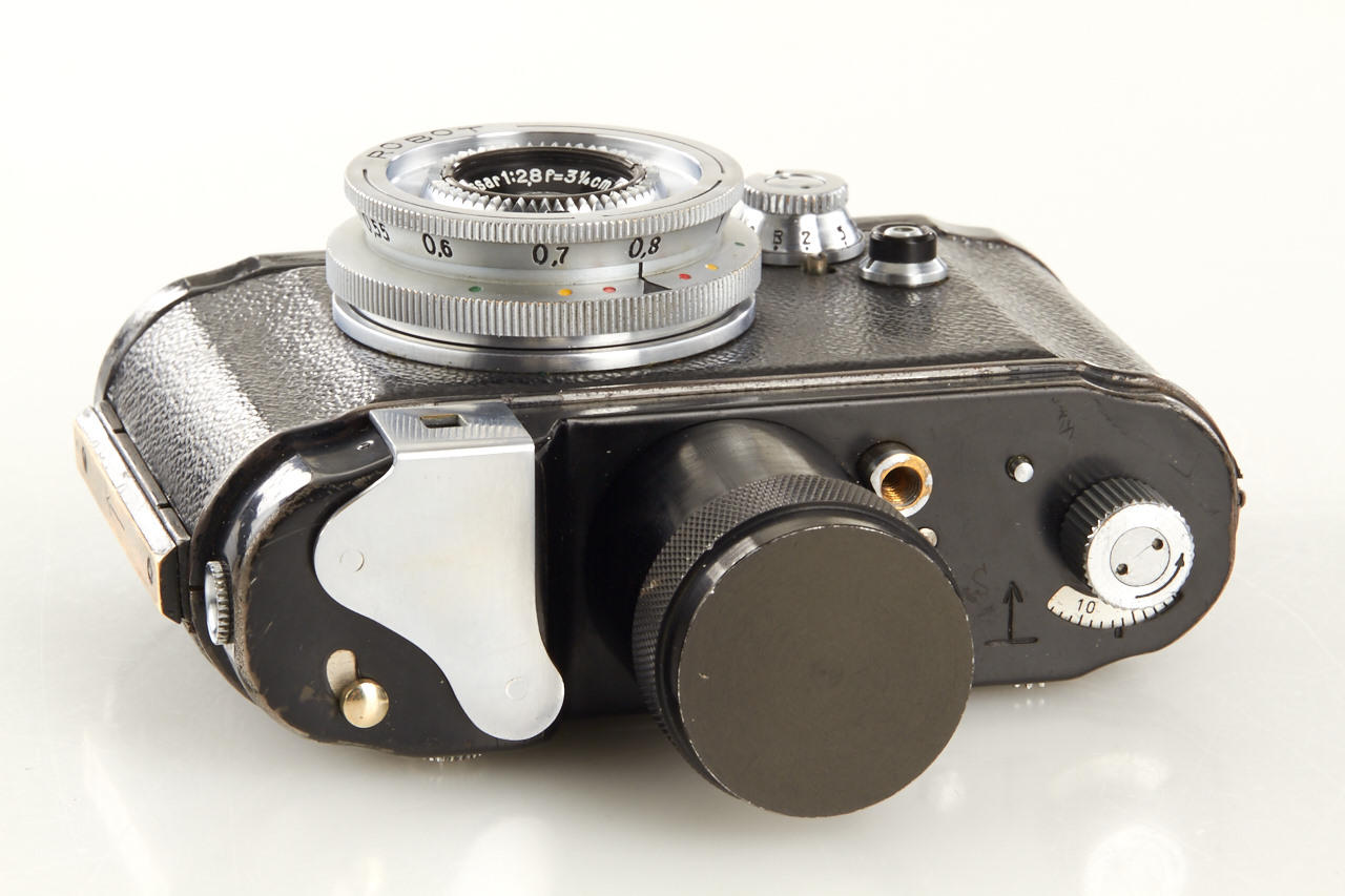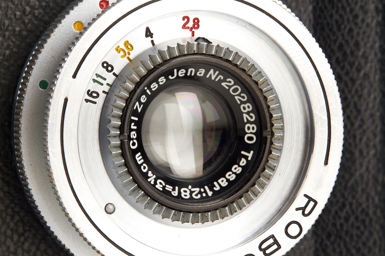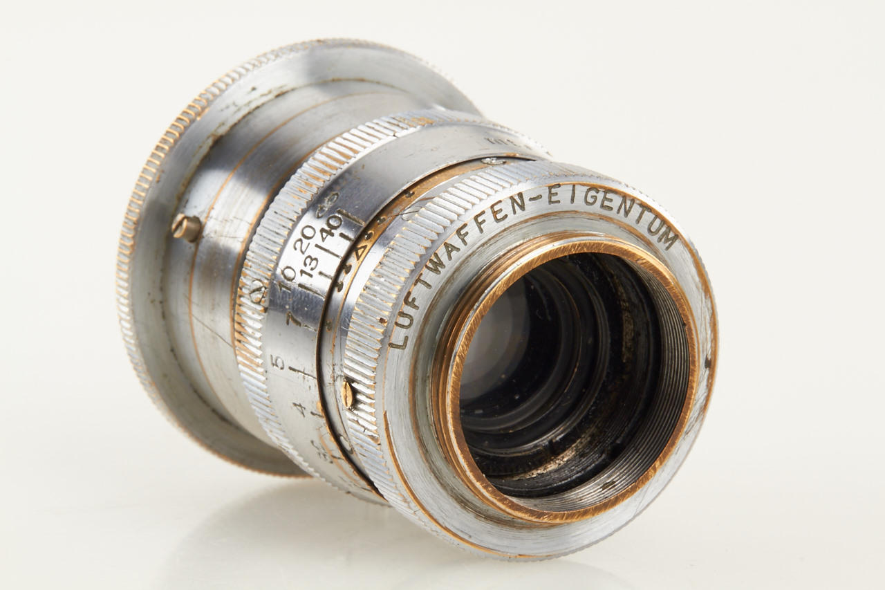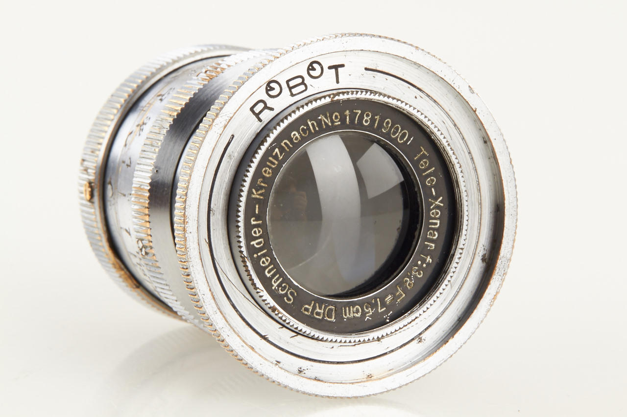 black painted Robot with high double spring for use in air fighters in WWII, Schneider Tele-Xenar 3.8/7.5cm engraved 'Luftwaffen-Eigentum' on rear with finder mask and Tessar 2.8/3 1/4cm - all in original and good working condition