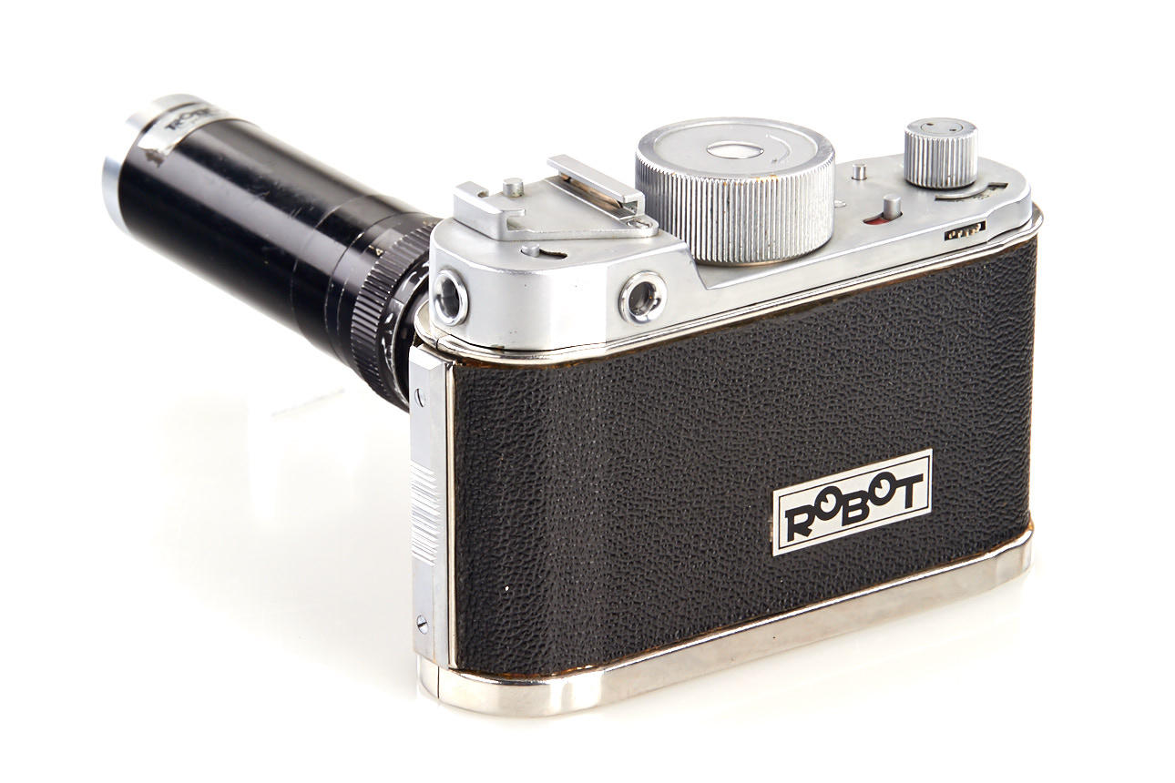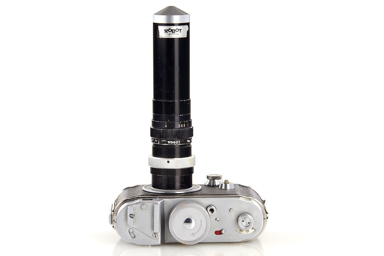 near mint Robot II camera in good working order, with special Robot 4/9mm surveillance lens no.53-649, the lens provides a wide angle view from a tiny, 3mm opening at the end - produced for German Secret Services (see Claude Bellon 'Robot Collection' page 117 and 118 for similar lenses), this is the only example of this lens we've seen in this form, an untypical serial number suggest it might be a prototype