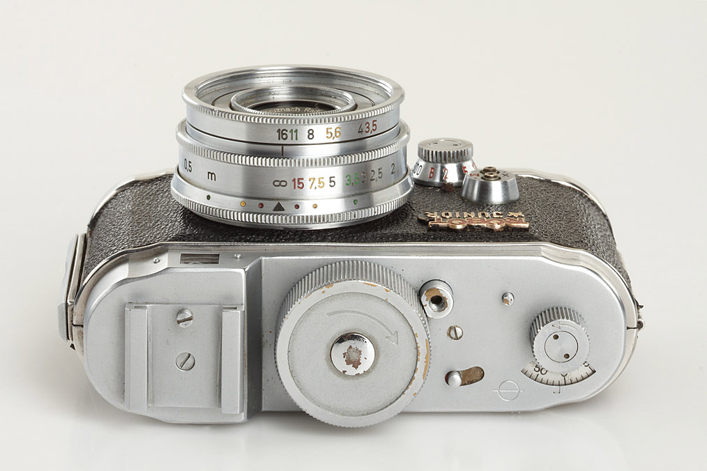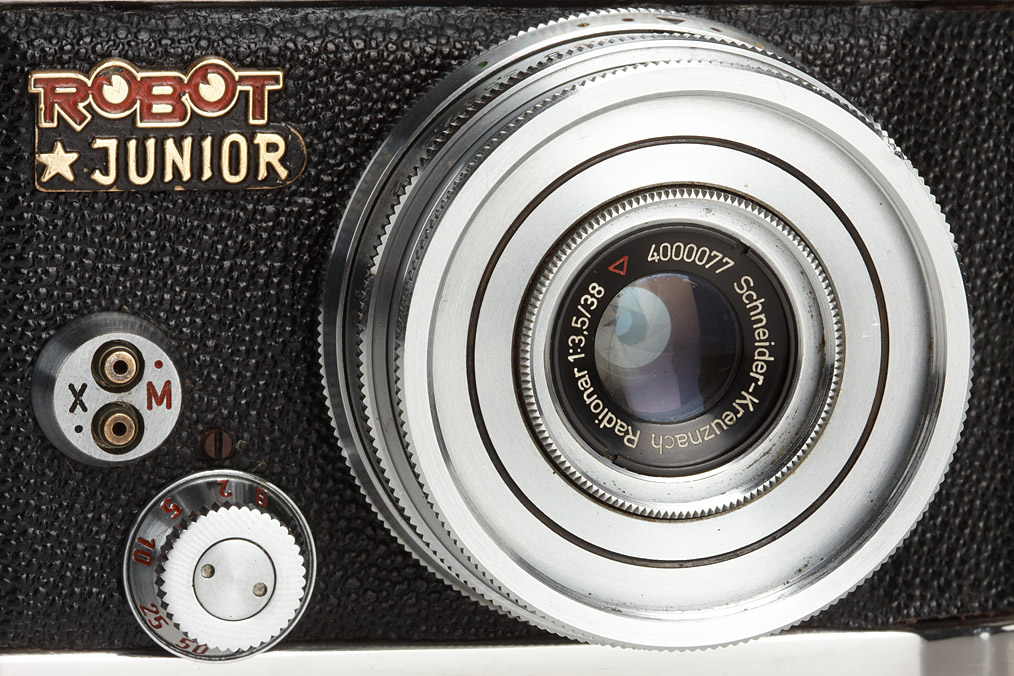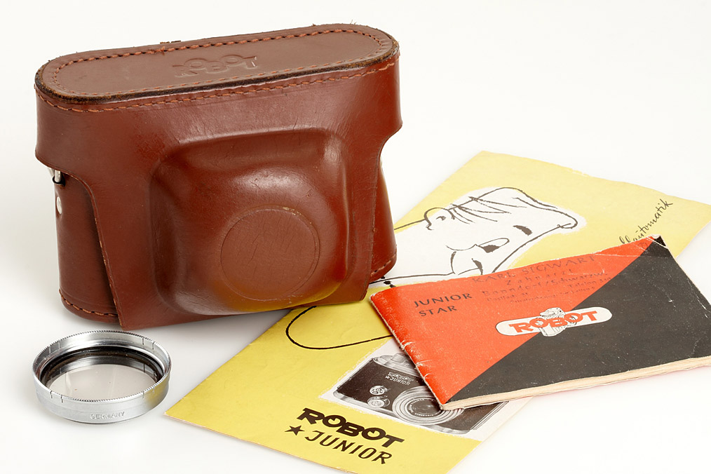 very early first type Robot Junior (X.M flash contact, 24 exposures) in near mint condition and perfect working order, Radionar 3.5/38mm no.4000077, UV filter, both spools (T cartridge and N winder), original instruction book and brochure, everready case