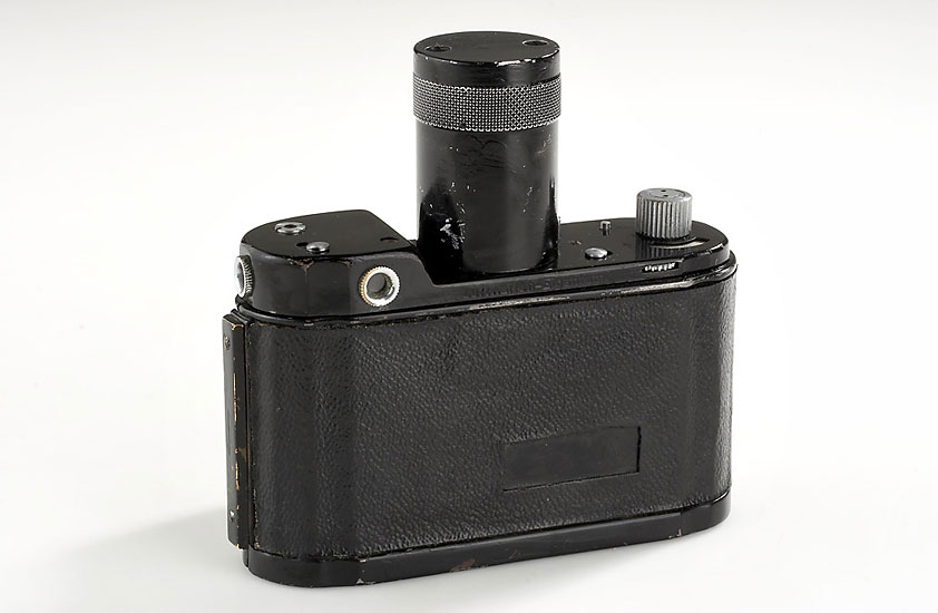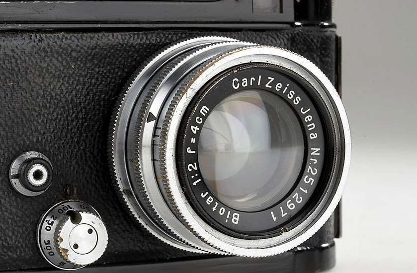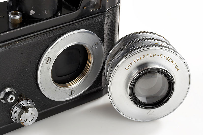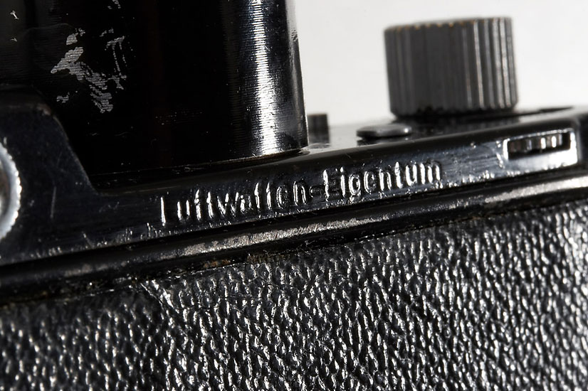 all black camera in working order with long winder for 48 exposures, viewfinder, engraved: Luftwaffen-Eigentum, matching Biotar 2/4cm no.2512971 engraved: LUFTWAFFEN-EIGENTUM
