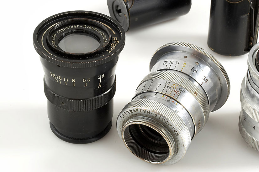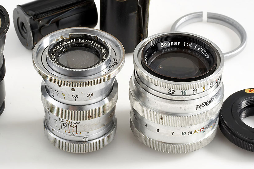 Tele-Xenar 3.8/7.5cm no.1695090 engraved: LUFTWAFFEN-EIGENTUM (chrome heavy weight, condition B/C), Tele-Xenar 3.8/7.5cm no.1819284 (all black, light weight, Luftwaffen-Eigentum engraving defaced, condition B), Sonnar 4/7.5cm no.2753103 (alloy body, condition B/C), 2 Robot film-spools, 2 adapters (7)