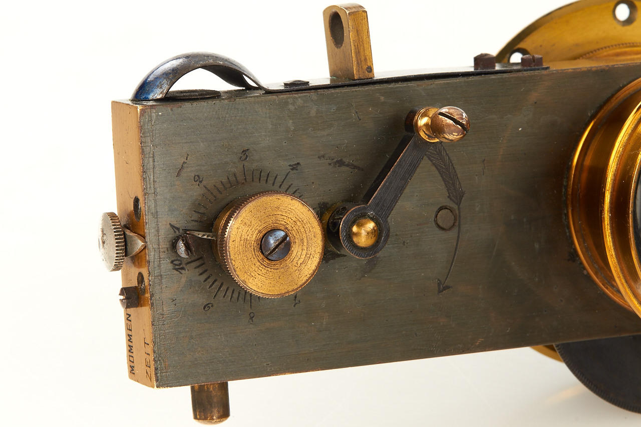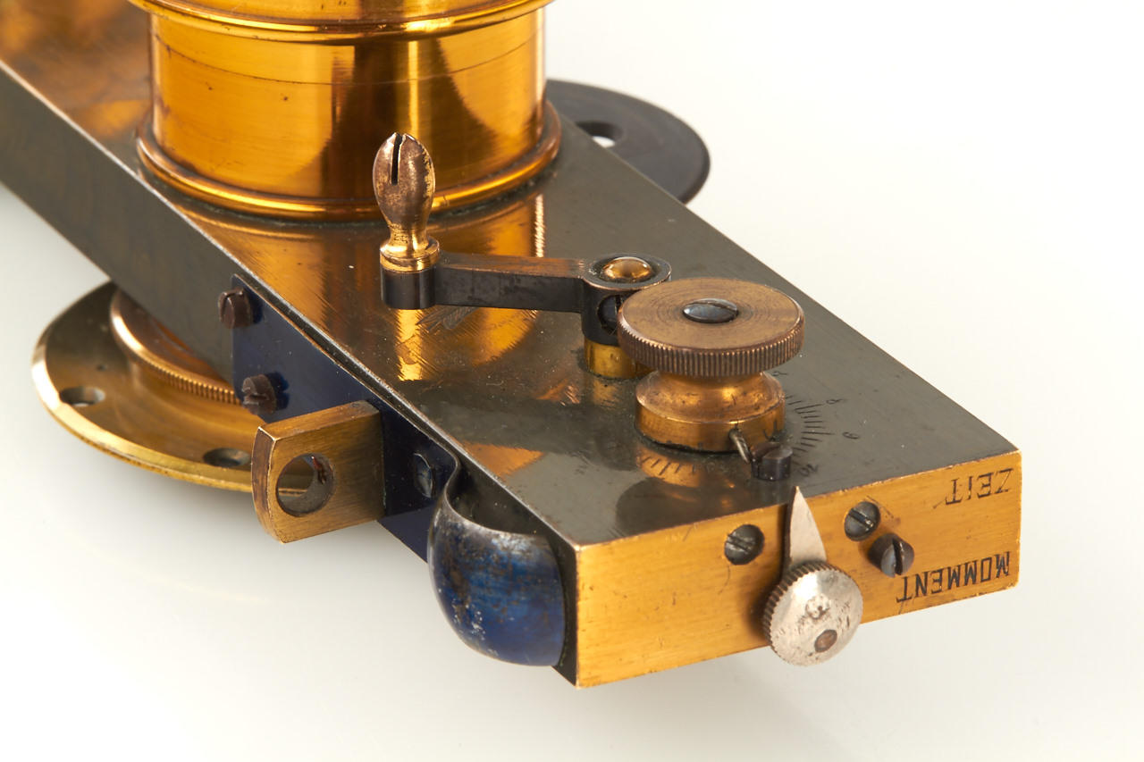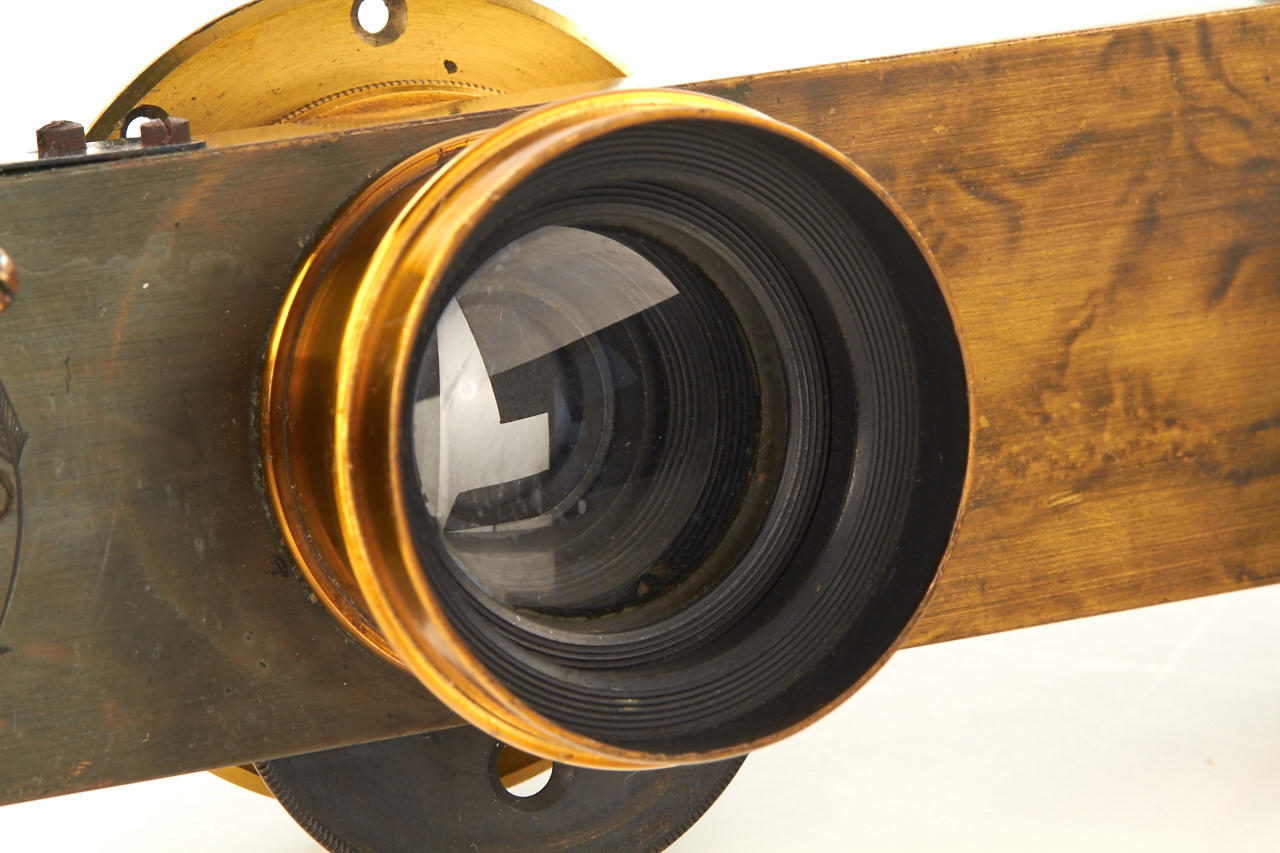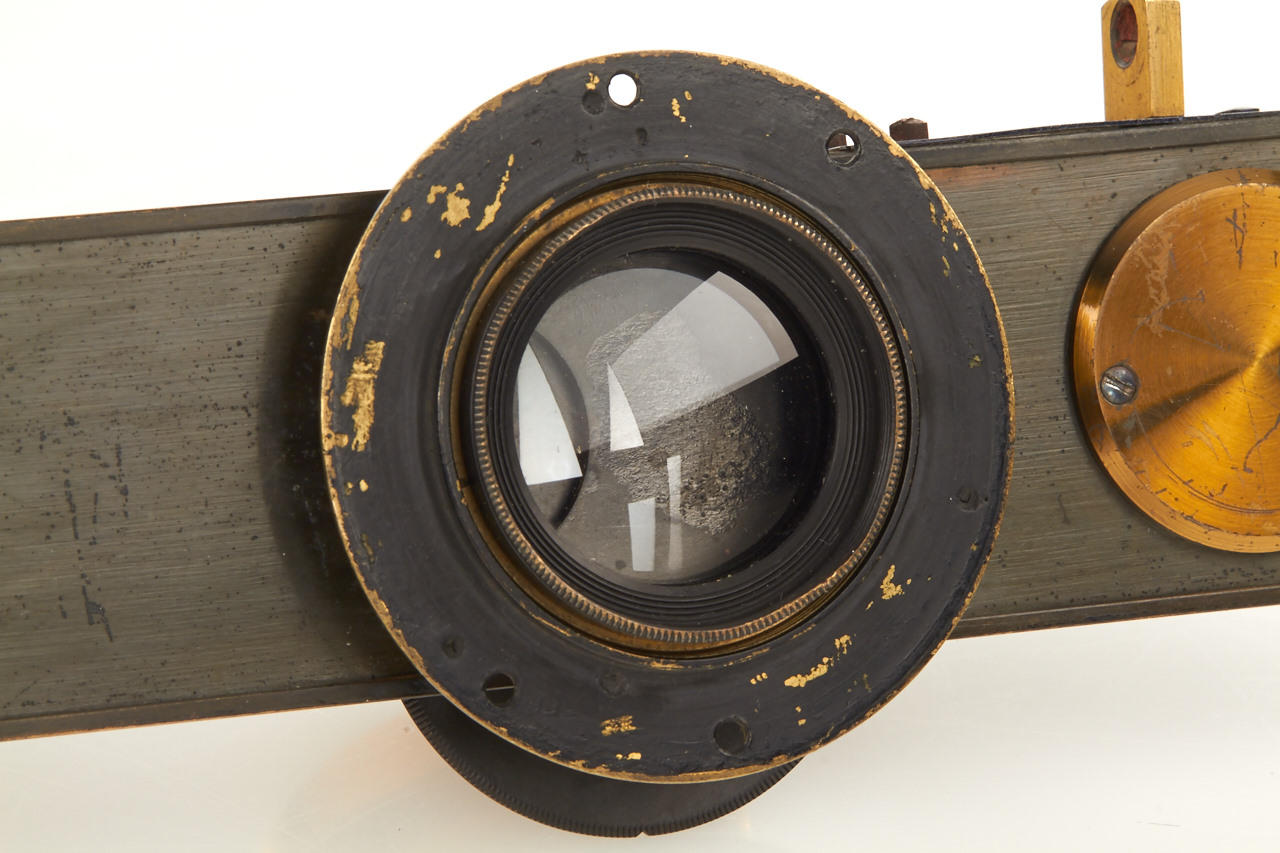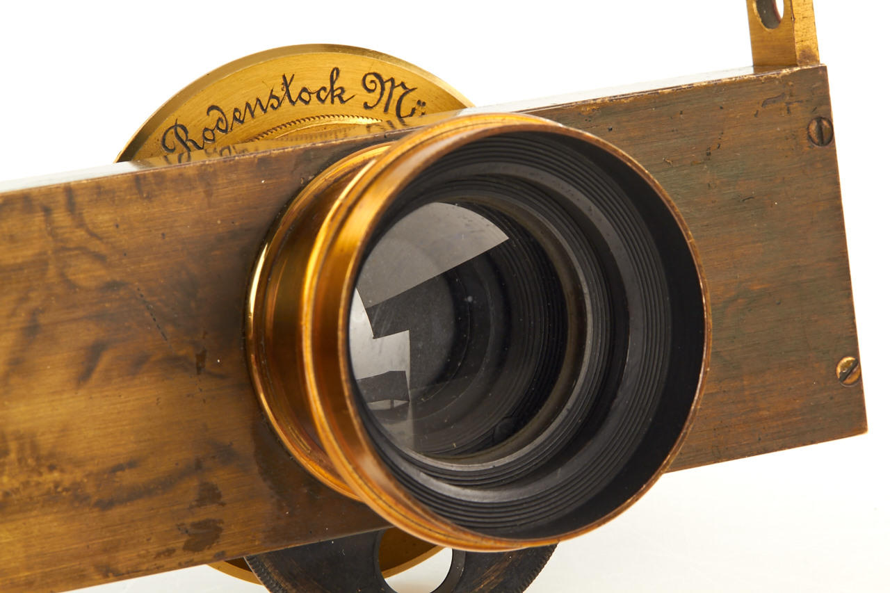 set of two Rodenstock rectilinear lenses, c.15cm focal length, front and rear element diameter c.25mm, total height c.50mm, mounted in German brass double guillotine shutter (working), with two mounting rings, in excellent condition