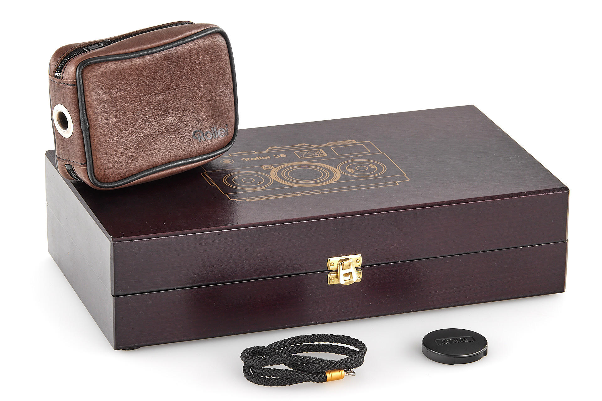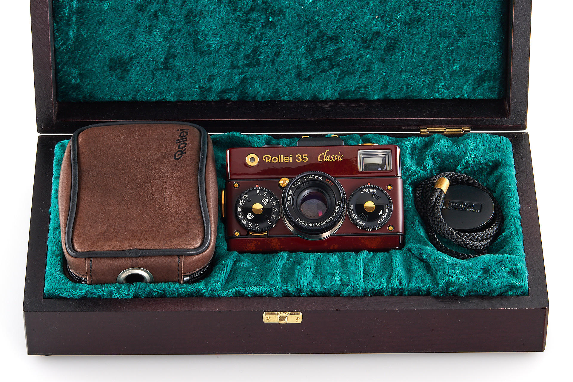 prototype Rollei 35 finished in special red Urushi laque, with red leather covering and gold-plated fittings, no serial number, in beautiful, mint condition, with cap, case, strap, in wooden 75 years box