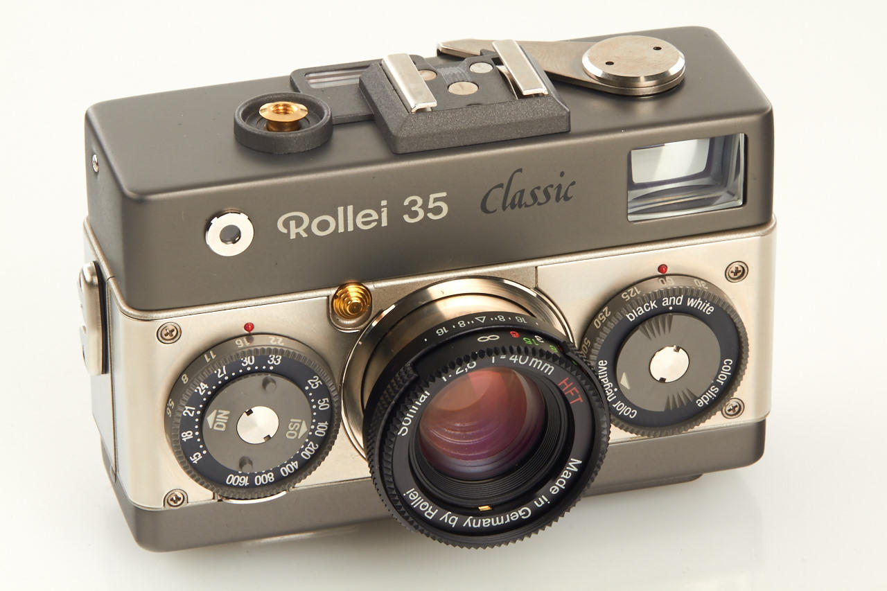 late Rollei 35 in Titanium finish made in Germany, with Sonnar 2.8/40mm, complete with lens cap, case, 20REB flash and all papers in maker's box